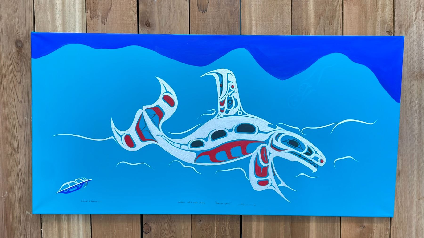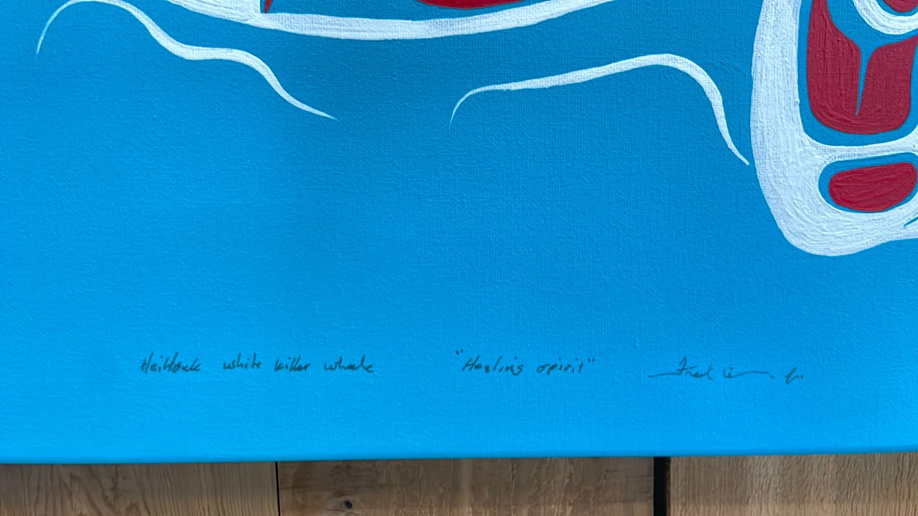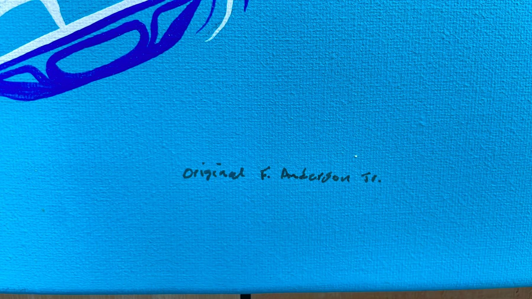ORIGINAL OIL ON CANVAS BY F. ANDERSON JR TITLED "HEILTSUK WHITE KILLER WHALE 'HEALING SPIRIT'" 39" X 19.5"