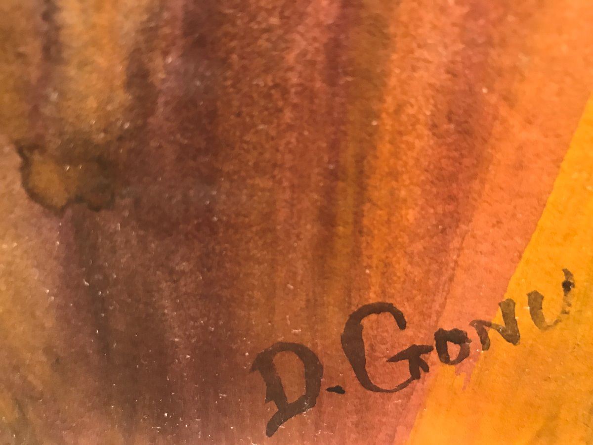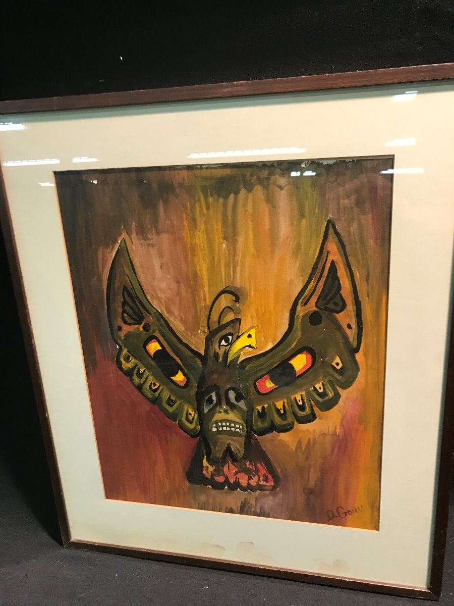 ORIGINAL PAINTING BY DANIAL PAUL GONU (1942-2007) FROM NEW AIYANSH, B.C. GONU WAS ONE OF THE FIRST BC FIRST NATIONS GRADUATES OF THE EMILY CARR SCHOOL OF ART. SMALL WATER DAMAGE ON THE MATTING, PAINTING IS IN EXCELLENT CONDITION.