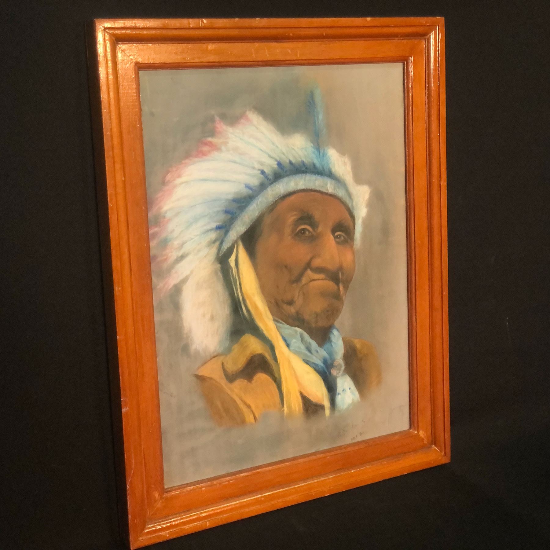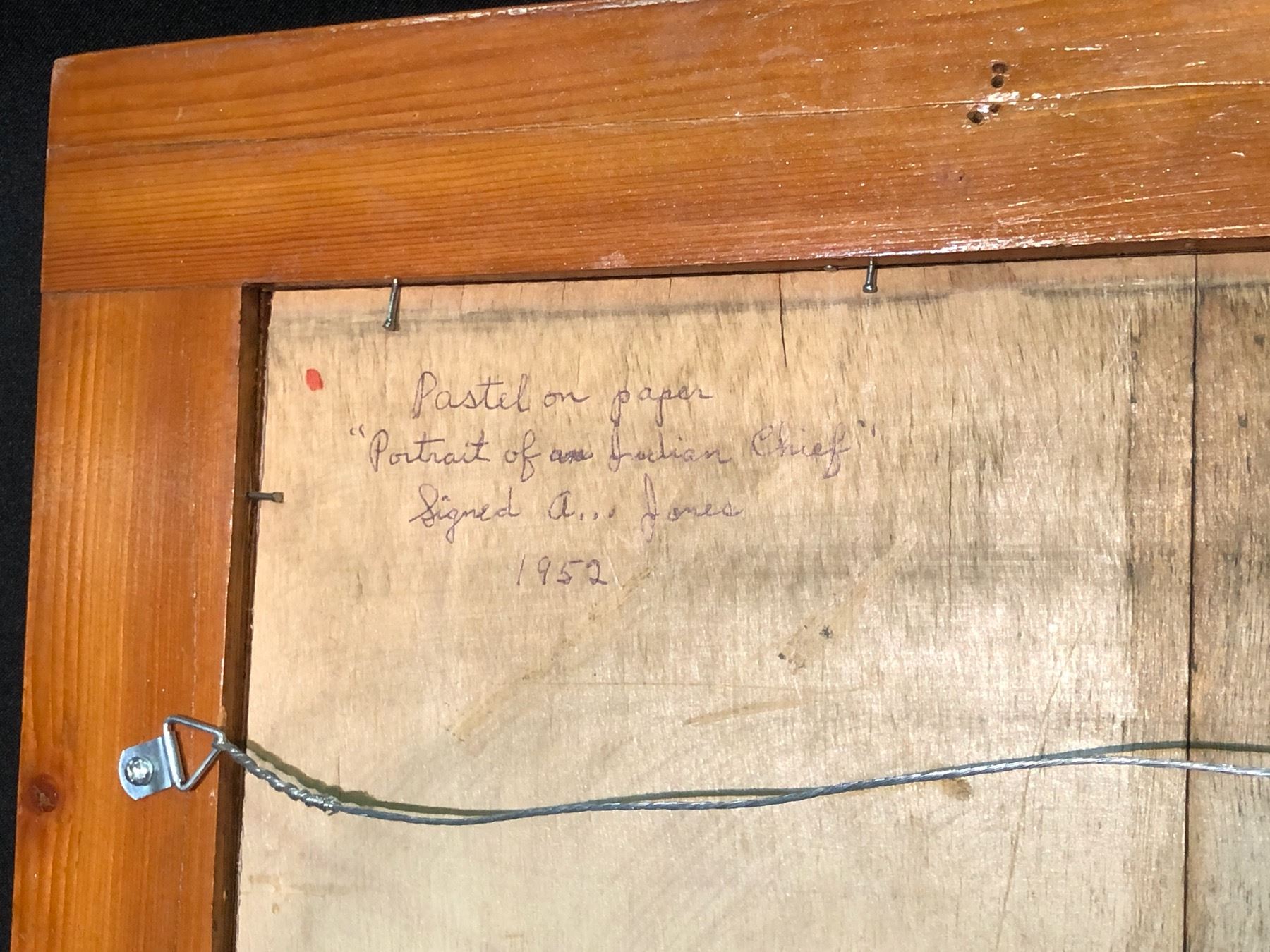 ORIGINAL PASTEL ON PAPER, "PORTRAIT OF AN INDIAN CHIEF", SIGNED ON LOWER RIGHT BY A. JAMES, 1952, 25.5" X 20.5" INC. FRAME