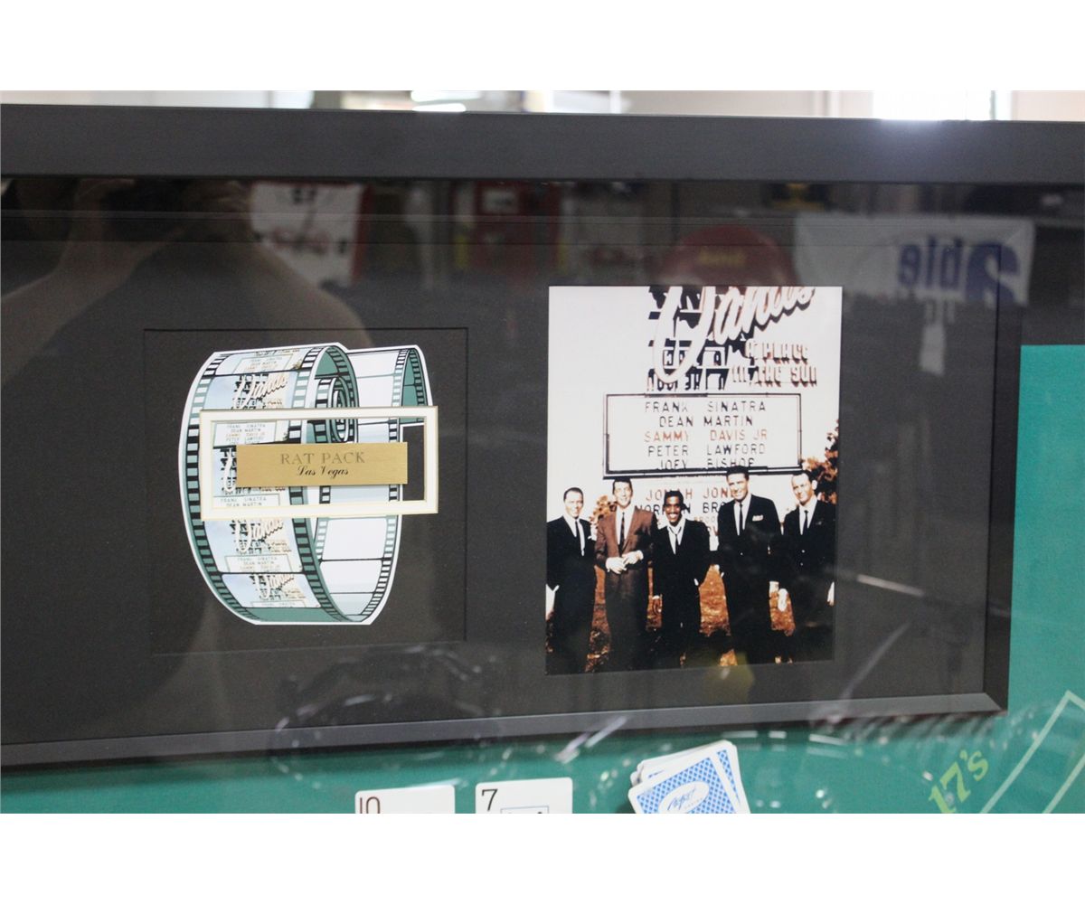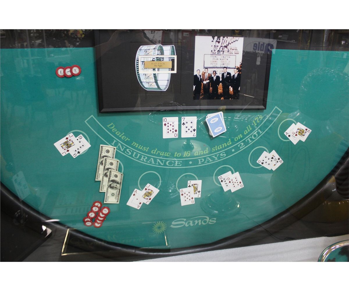 ORIGINAL "SANDS CASINO" LAS VEGAS BLACK JACK TABLE WITH CHIPS AND SCREEN USED MOVIE MONEY. INCL. RAT PACK PHOTO, CUSTOM FRAMED. ONE OF A KIND!