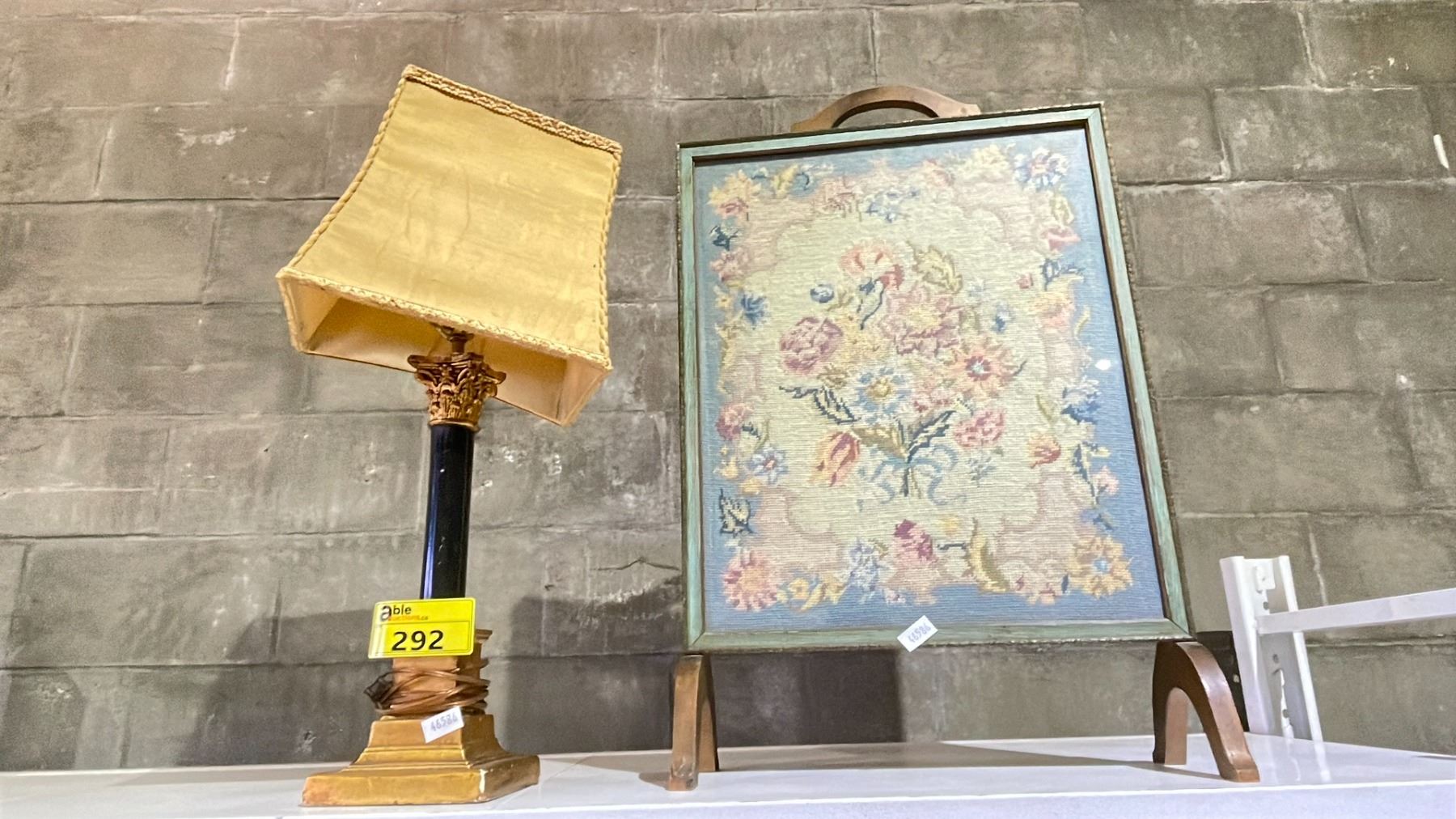 ORNATE TABLE LAMP WITH SHADE & FRAMED NEEDLEPOINT ARTWORK