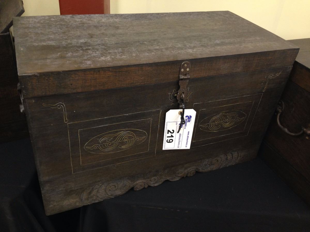 ORNATELY CARVED WOOD TRUNK, WITH MULTIPLE COMPARTMENTS, 27'' W X 16.5'' H X 13.5'' D