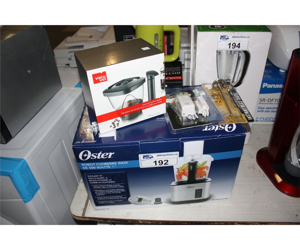 OSTER FOOD PROCESSOR, VACUUM COFFEE SAVER, DOOR CHIME AND THERMOMETER