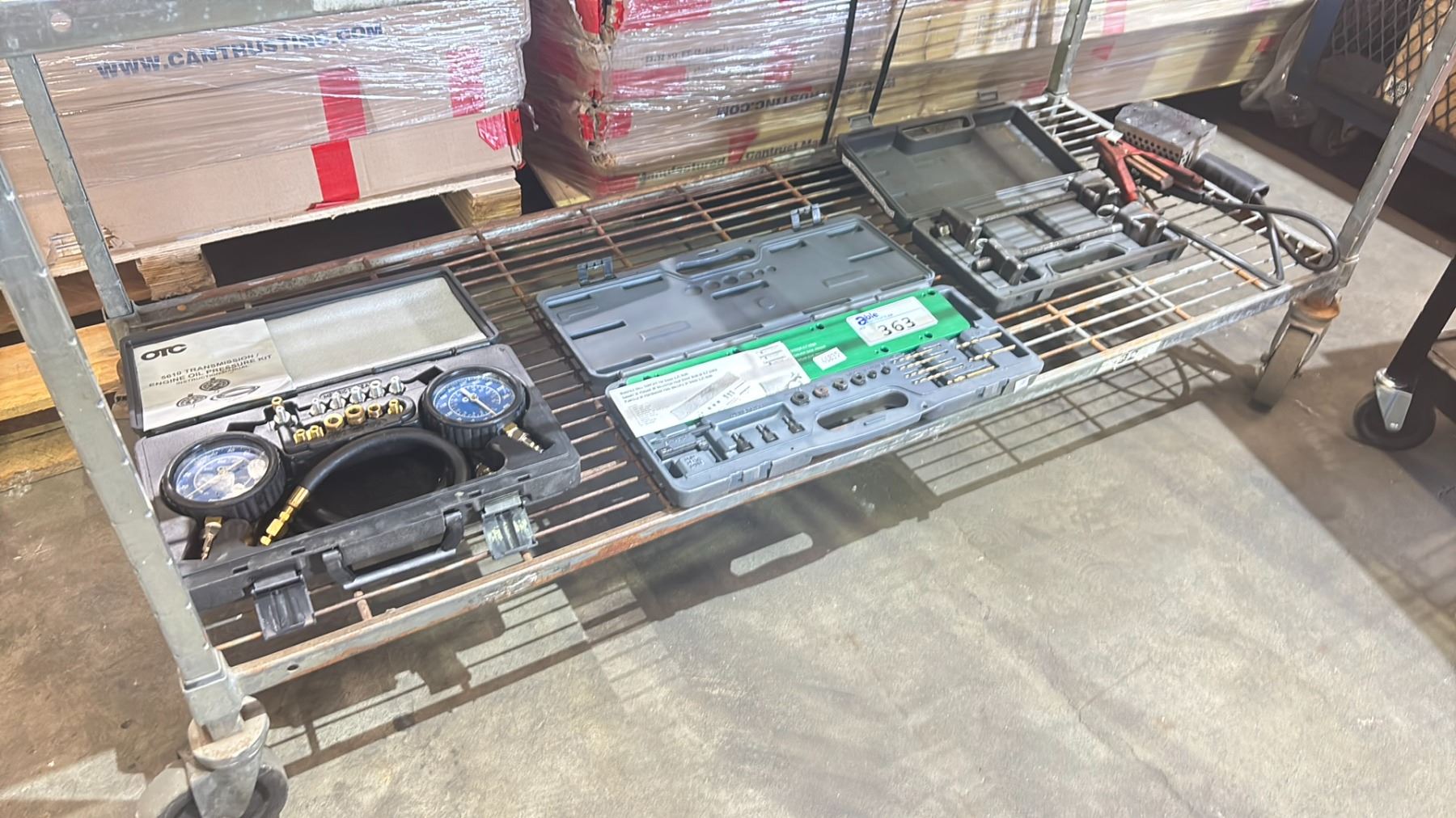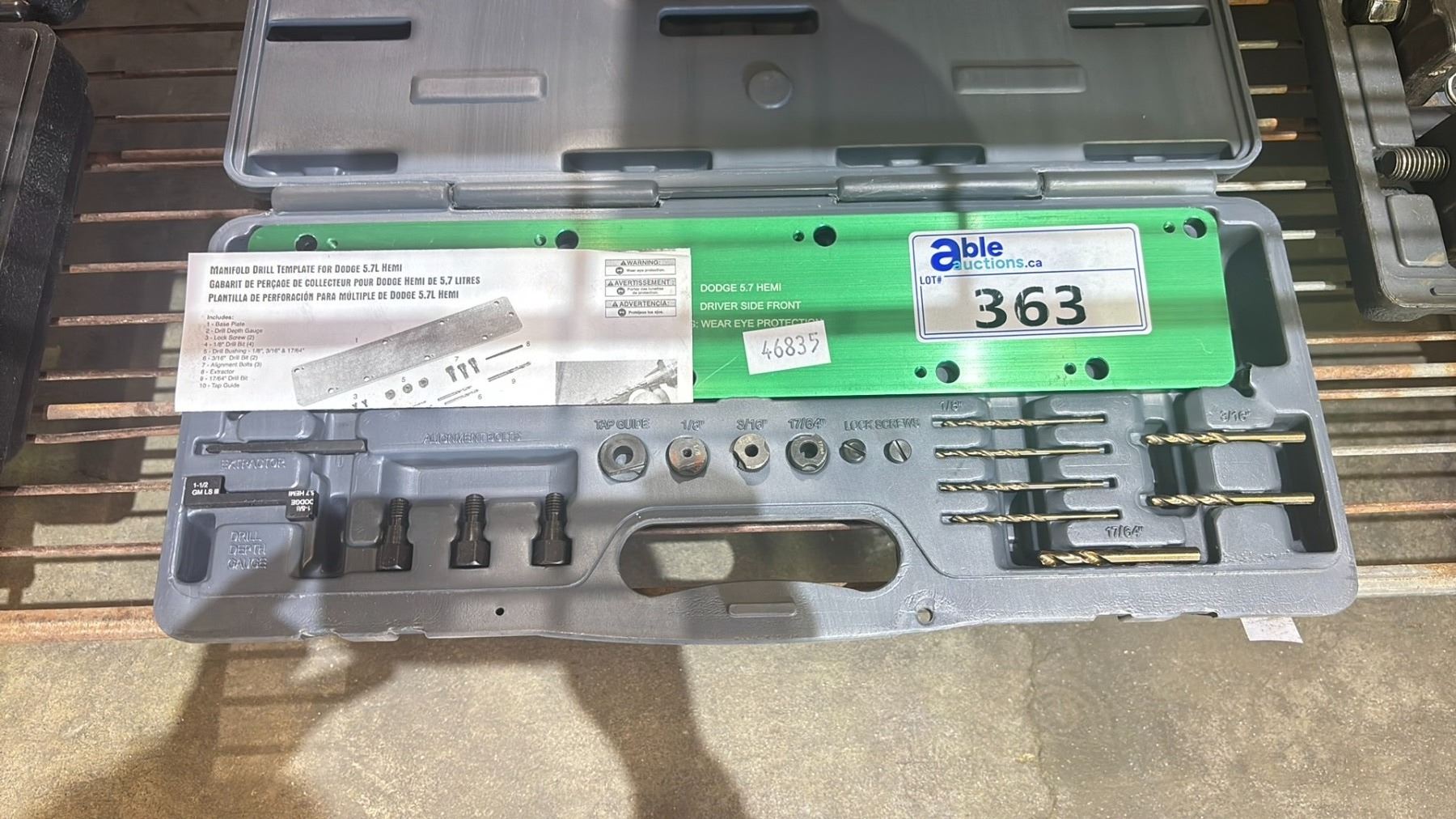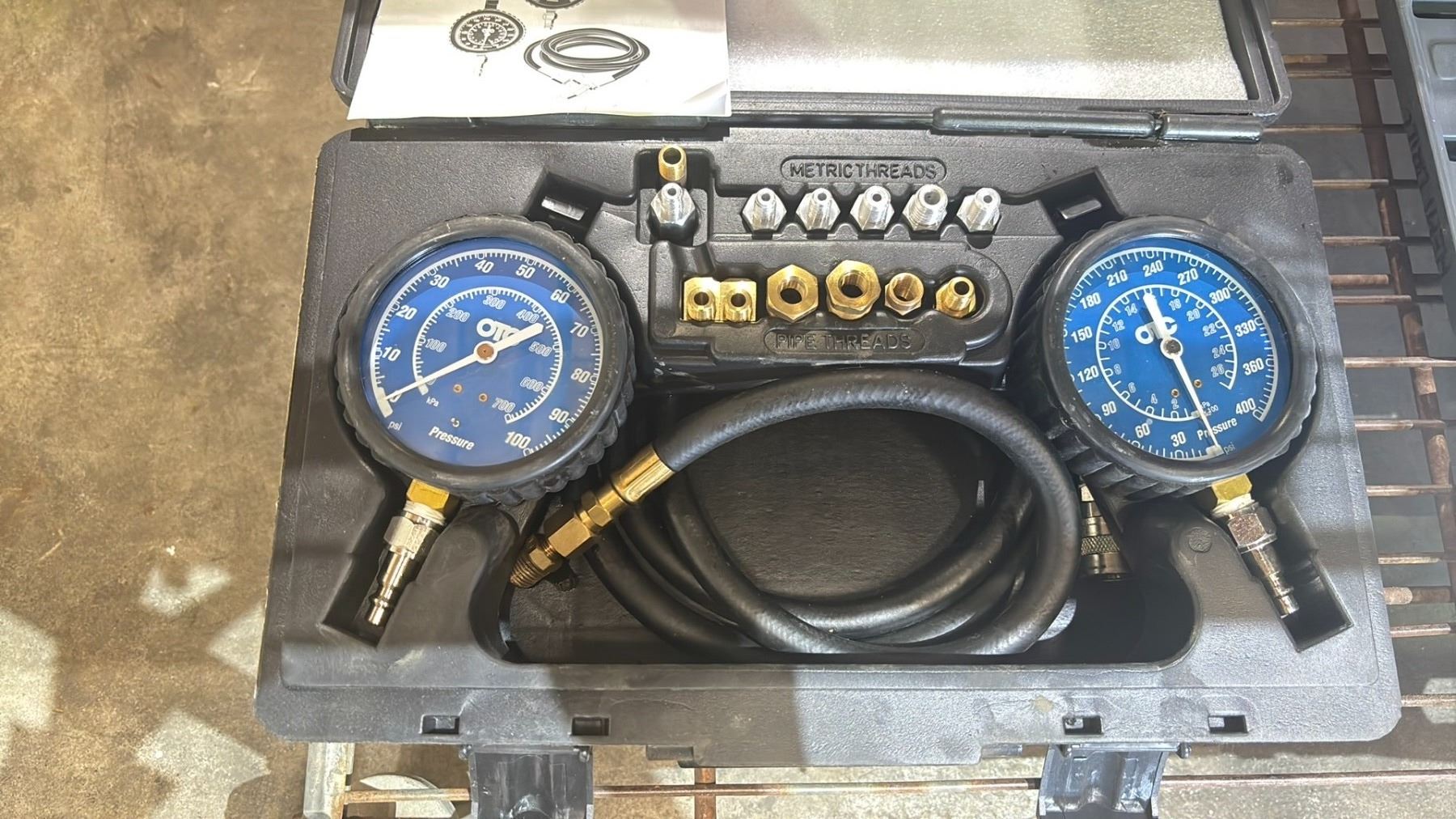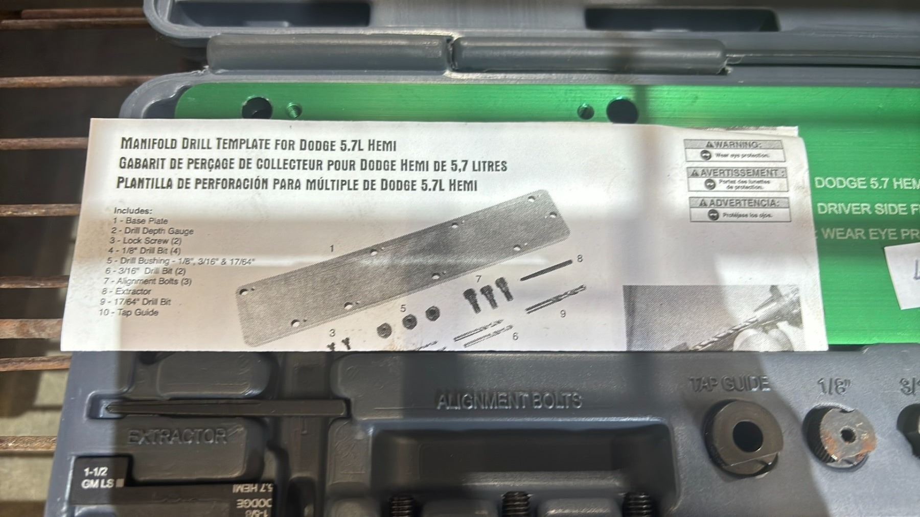 OTC 5610 TRANSMISSION/ ENGINE OIL PRESSURE KIT IN A HARD TRANSPORT CASE, COIL SPRING COMPRESSOR TOOL IN A HARD TRANSPORT CASE, ASSOCIATED 6029 6/12 VOLT BATTERY TESTER & A MANIFOLD DRILL TEMPLATE FOR DODGE 5.7L HEMI