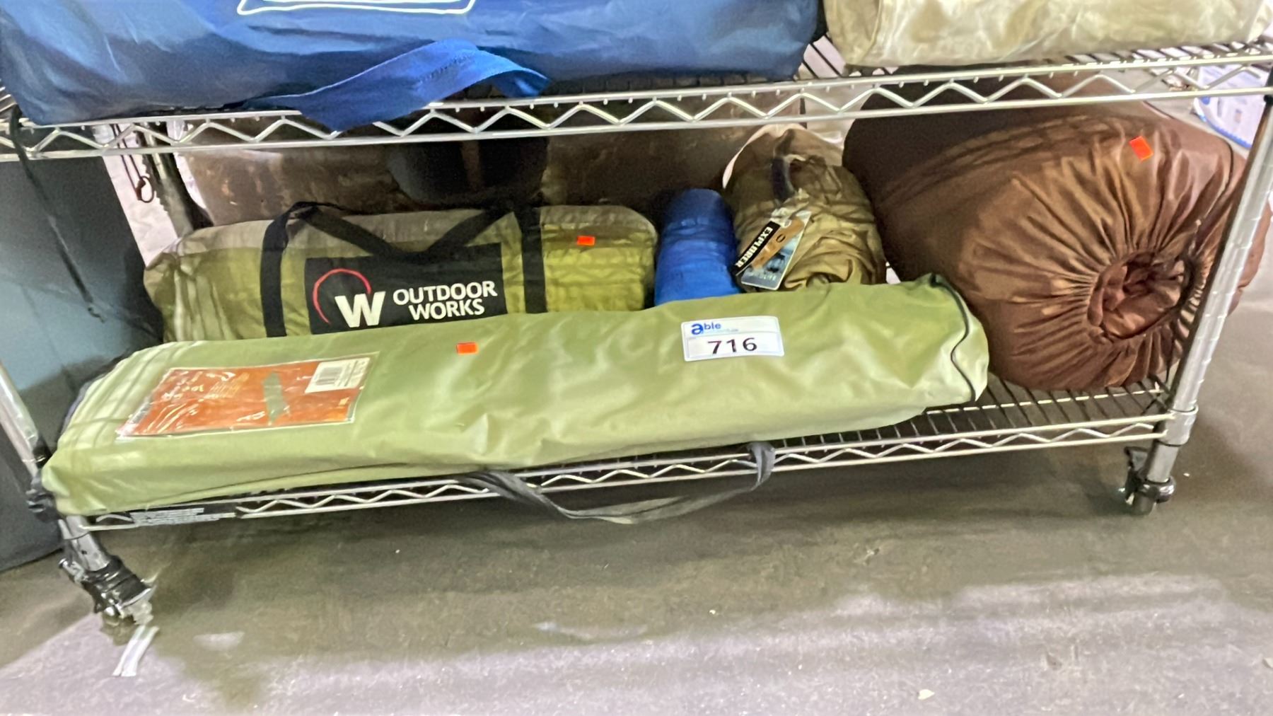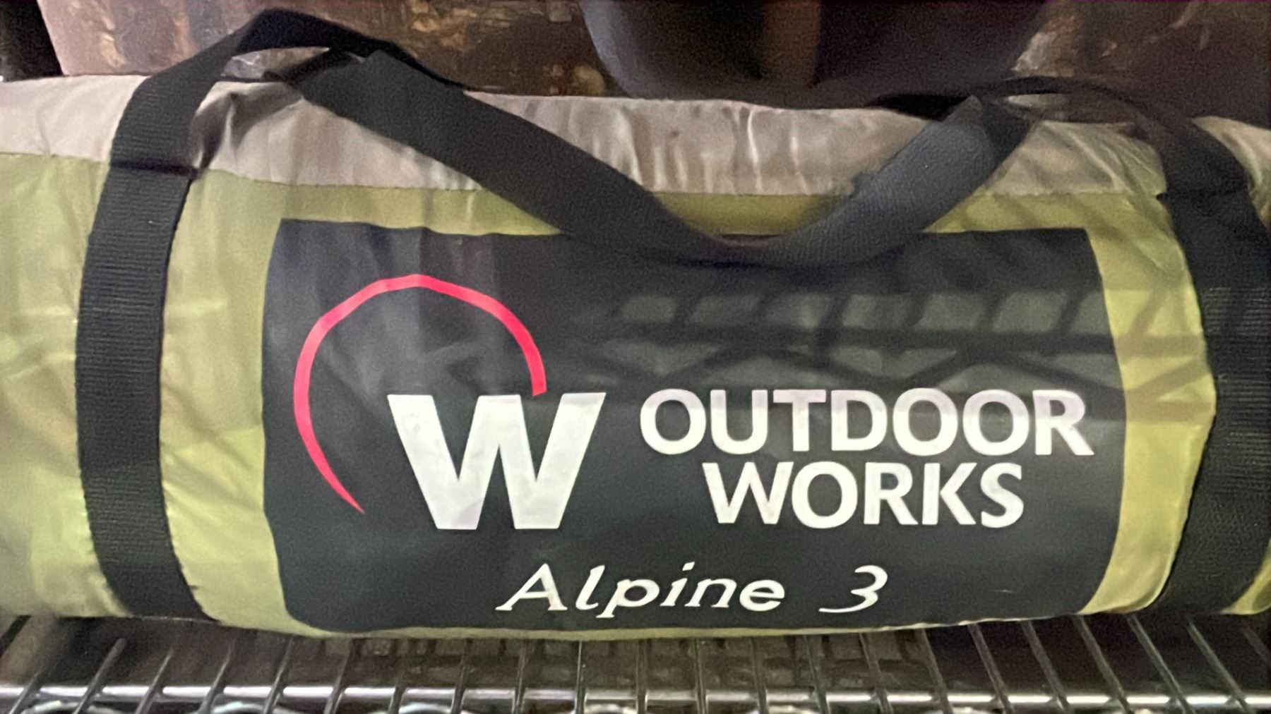 OUTDOOR WORKS ALPINE 3 TENT, CAMP COT & 3 SLEEPING BAGS
