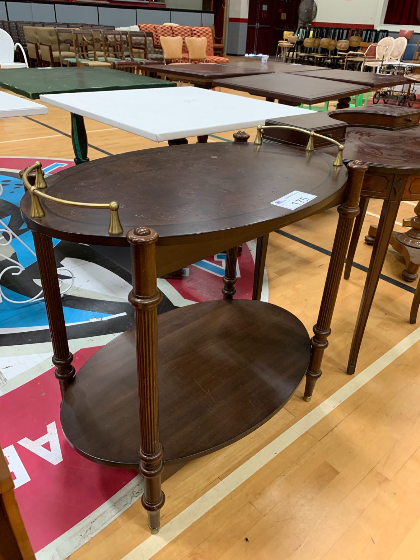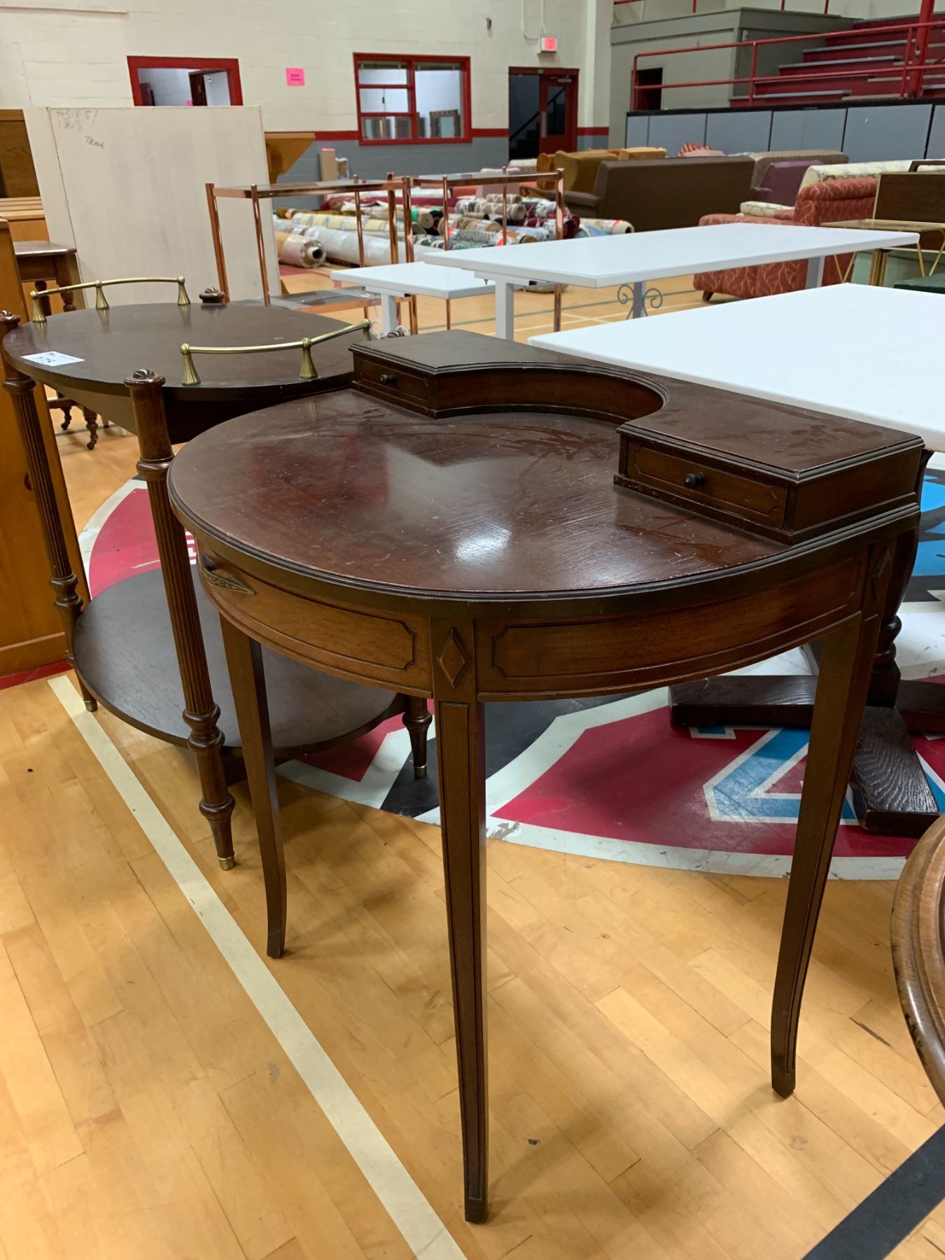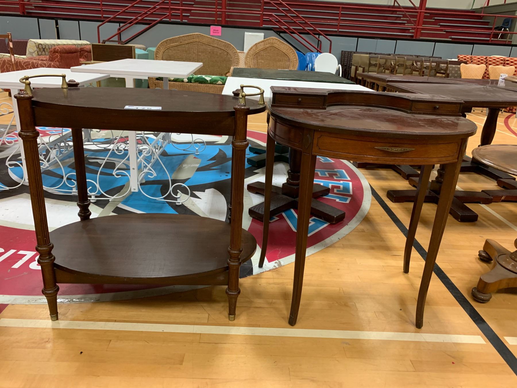 OVAL 2 TIER WOOD HALL TABLE APPROX 30"X33"X21" & 3 DRAWER WOOD HALL TABLE APPROX 30"X28"X20"