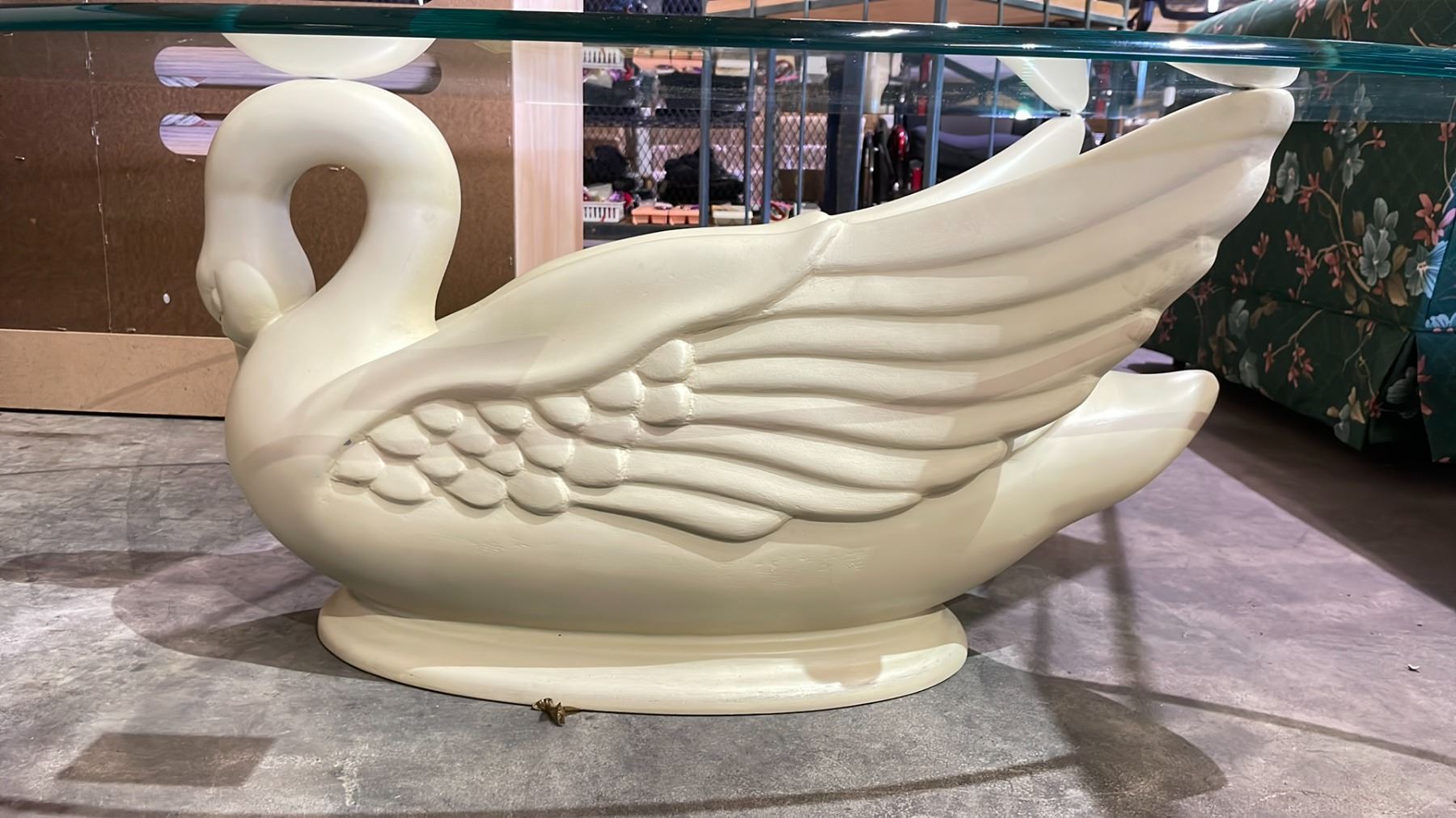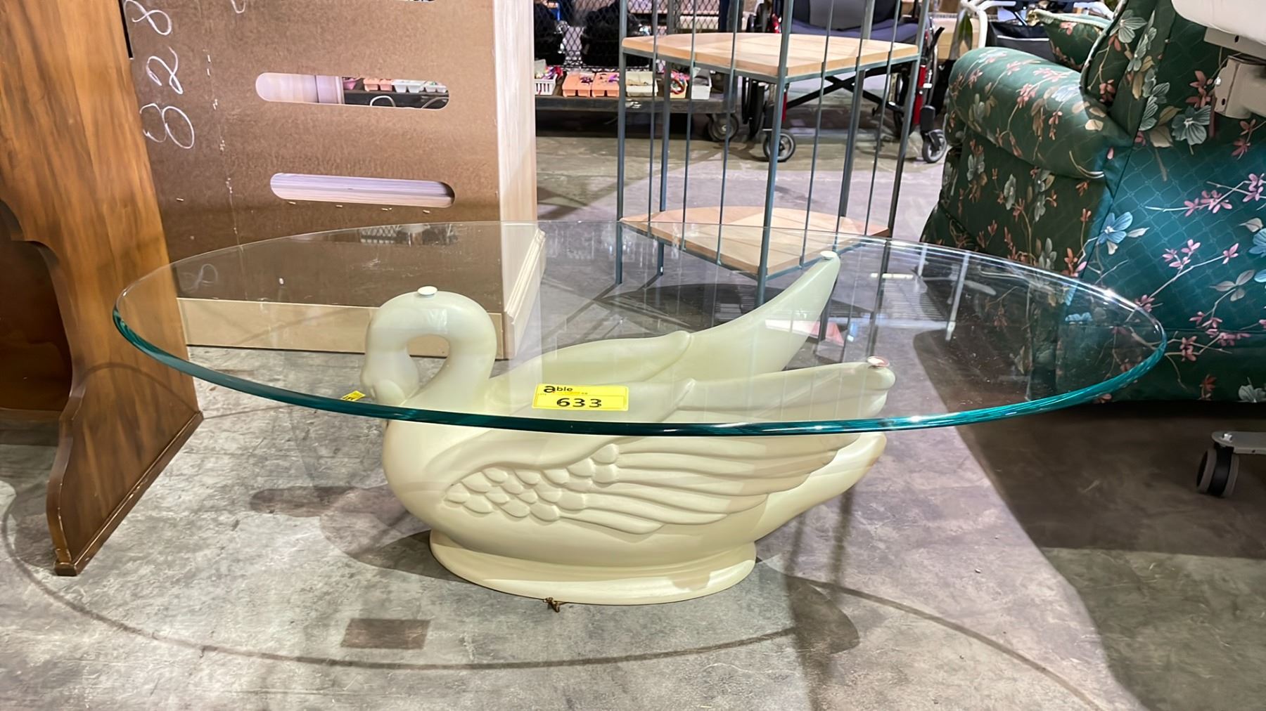OVAL GLASS TOP COFFEE TABLE WITH SWAN BASE (53"W X 25"D X 16.5"T)
