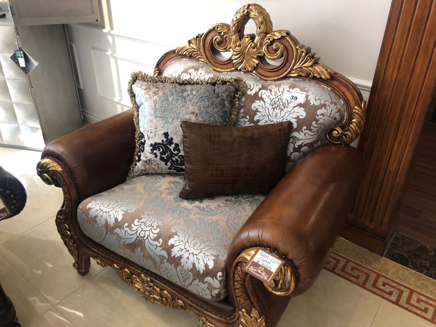 OVER SIZED LEATHER AND FLORAL PRINT LOUNGE CHAIR. RETAIL $3,900.00