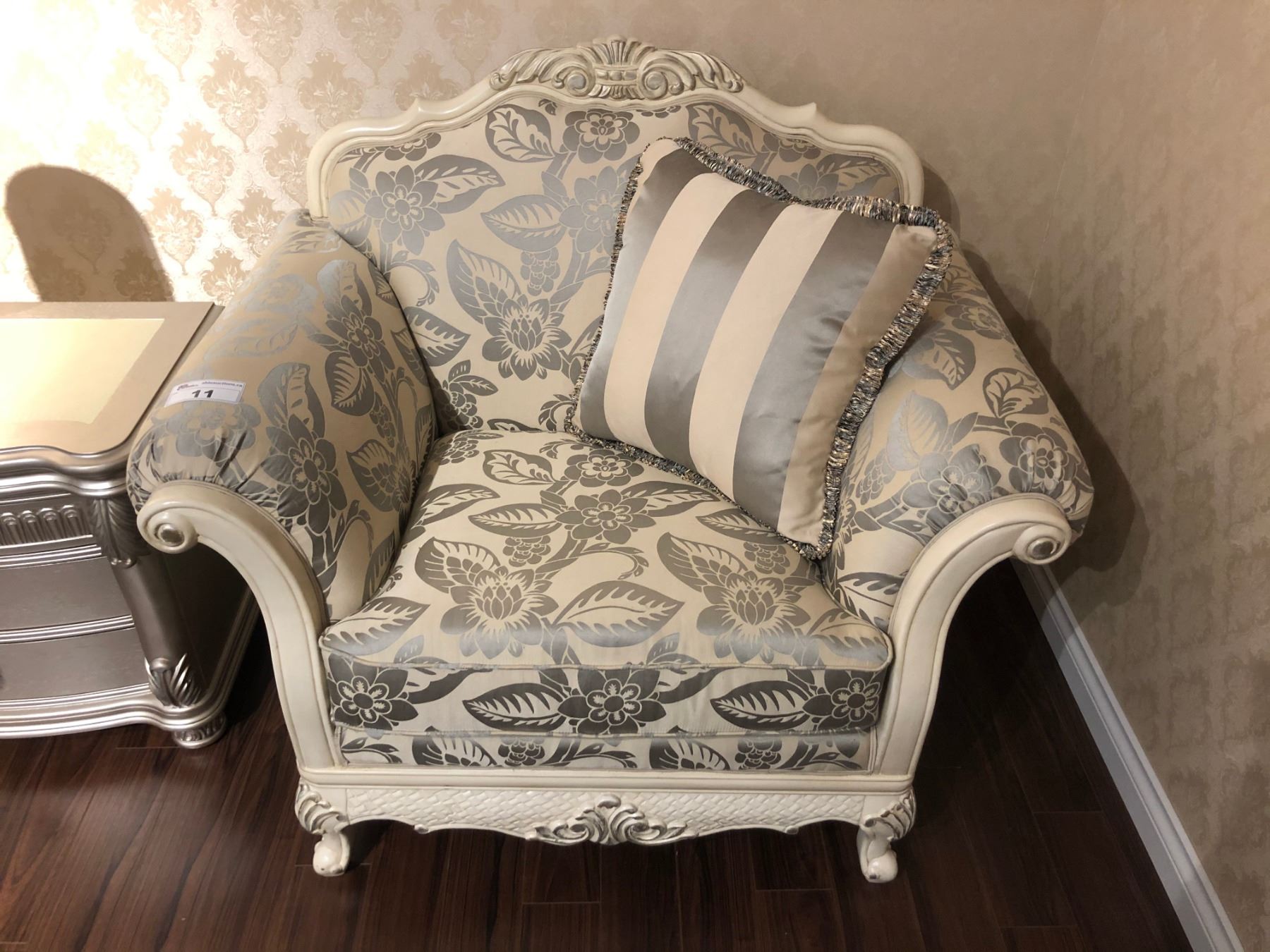 OVER SIZED LOUNGE CHAIR WITH FLORAL PRINT AND WOOD TRIM.