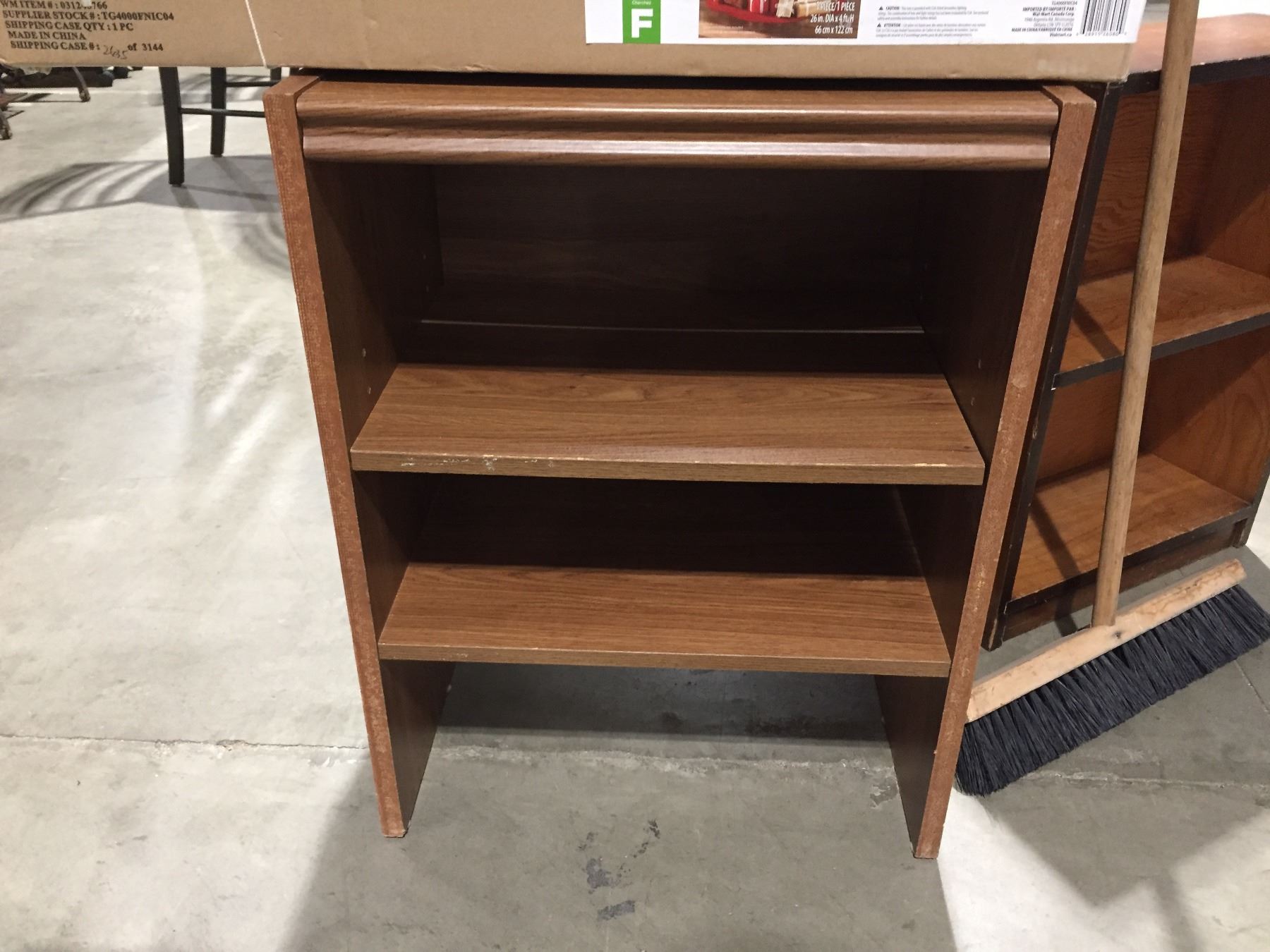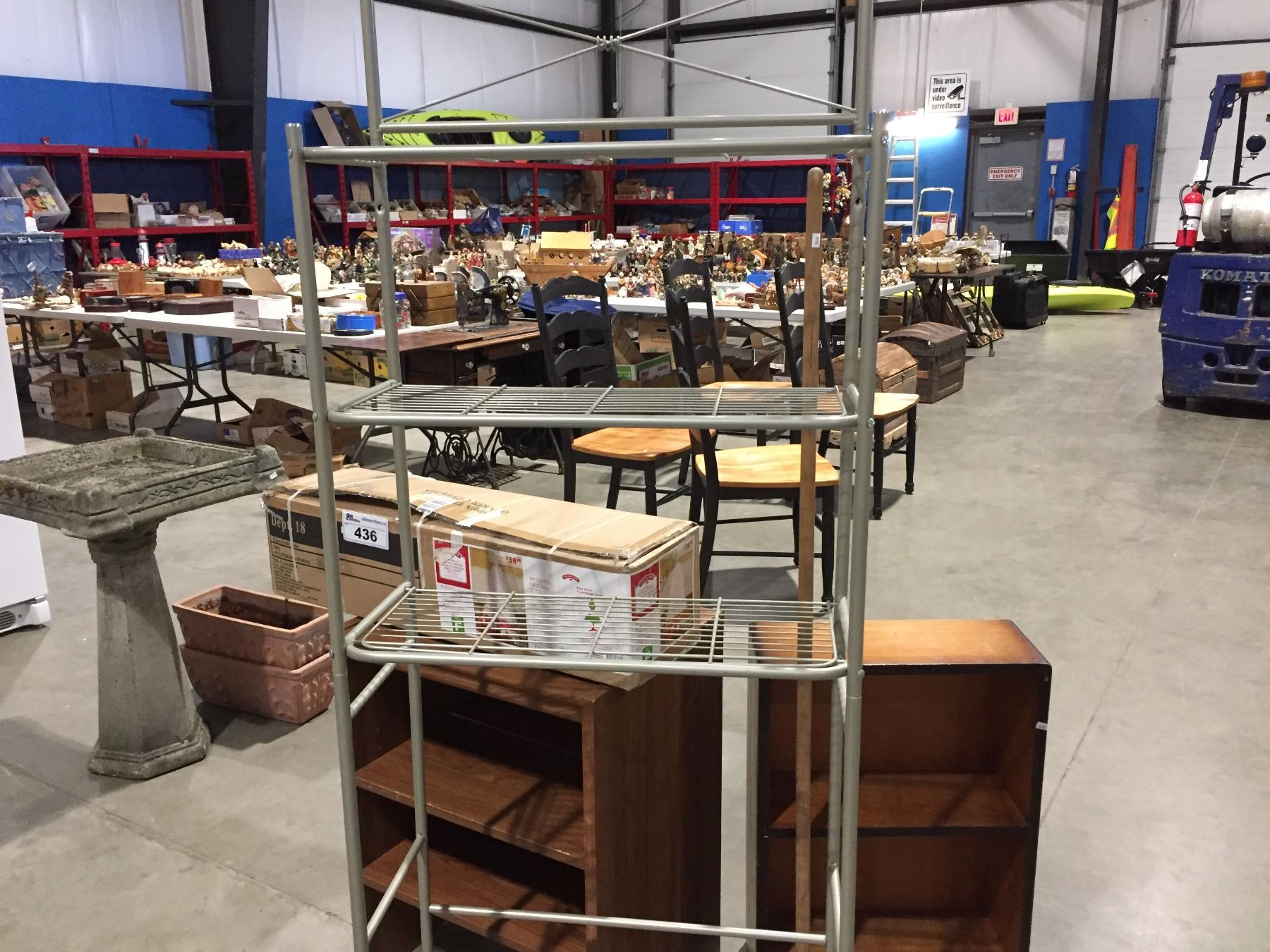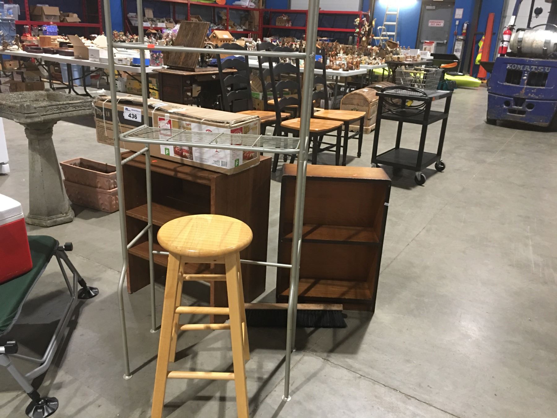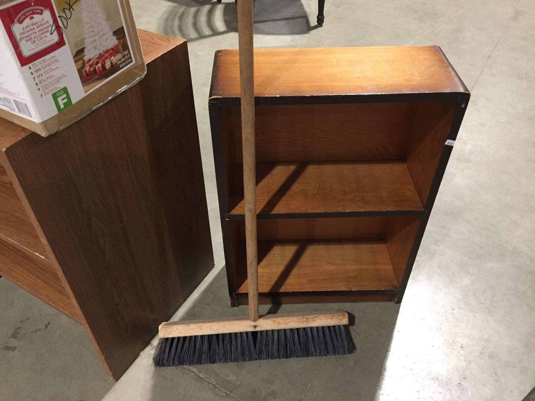 OVER TOILET STORAGE RACK, 2 SMALL BOOK SHELVES, BROOM & WHITE 4' XMAS TREE & WOODEN STOOL