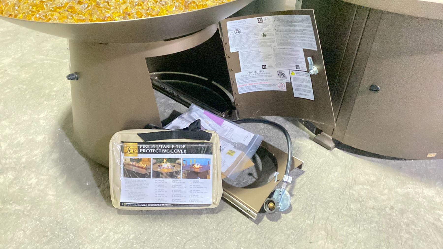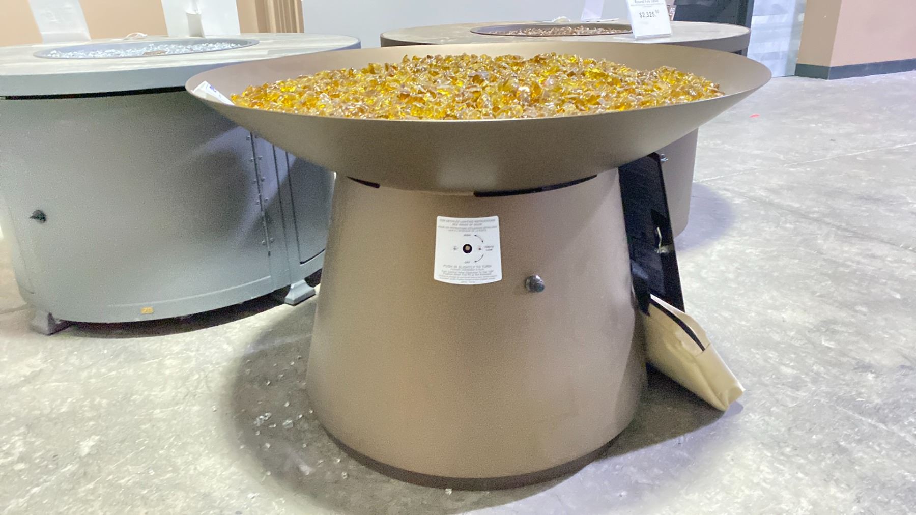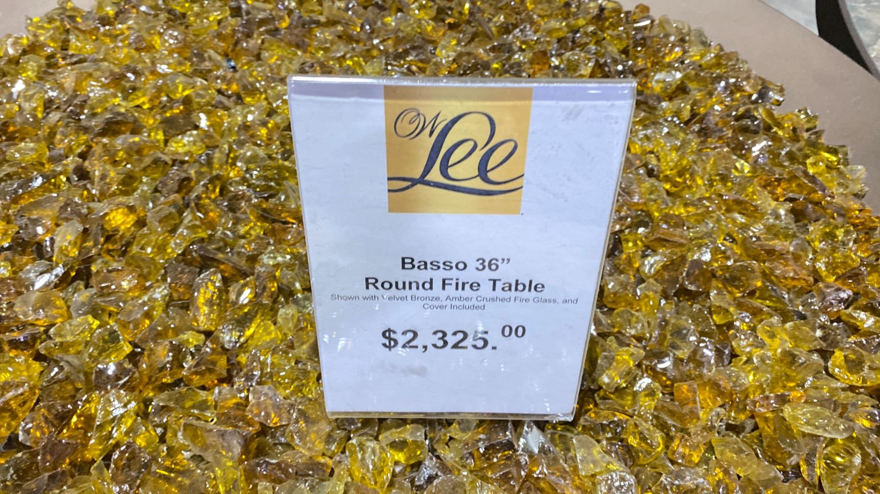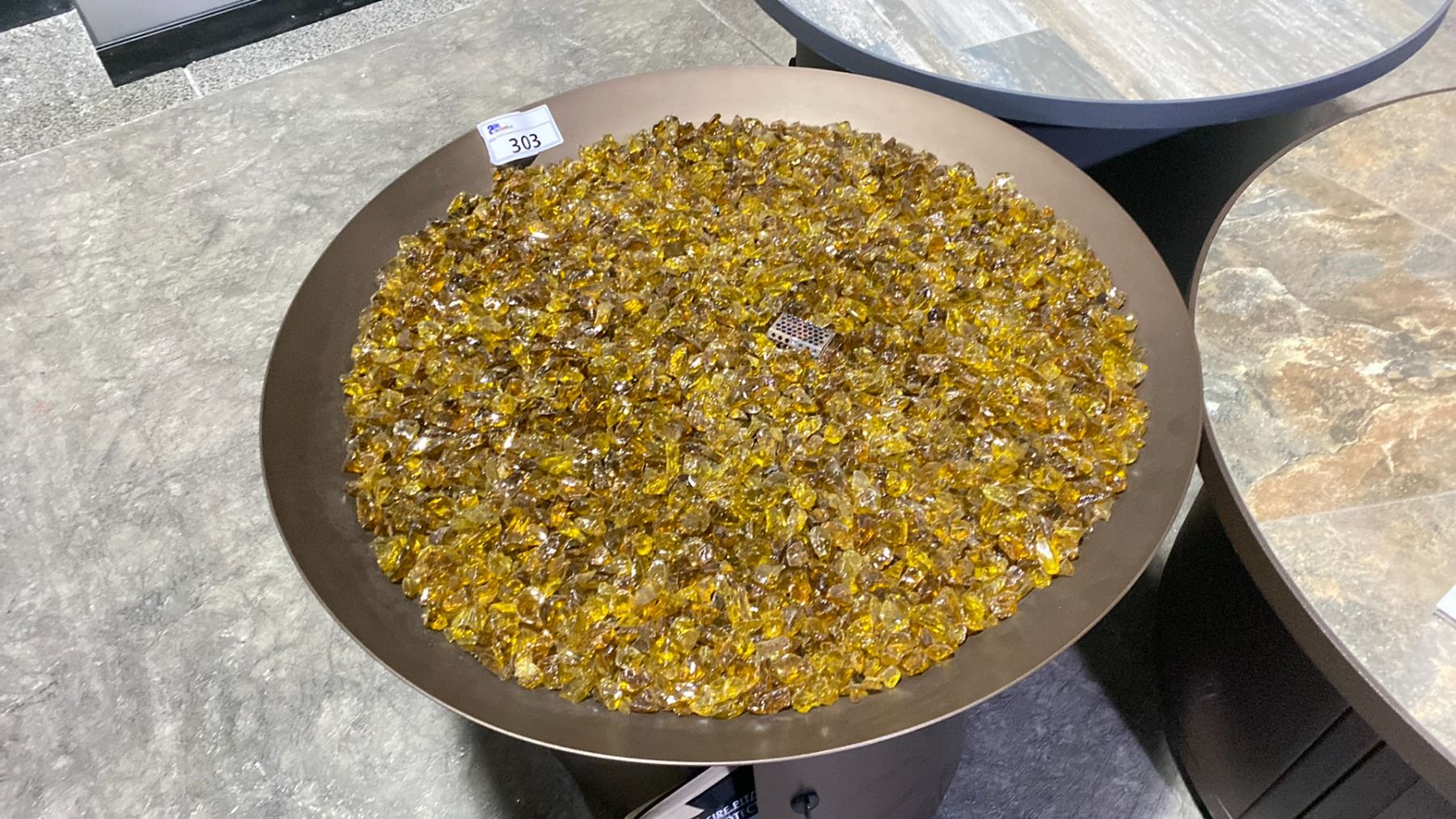 OW LEE BASSO 36" ROUND PROPANE FIRE TABLE WITH VELVET BRONZE, AMBER CRUSHED FIRE GLASS. COMES WITH COVER AND NAT GAS CONVERSION. RETAILS $2325