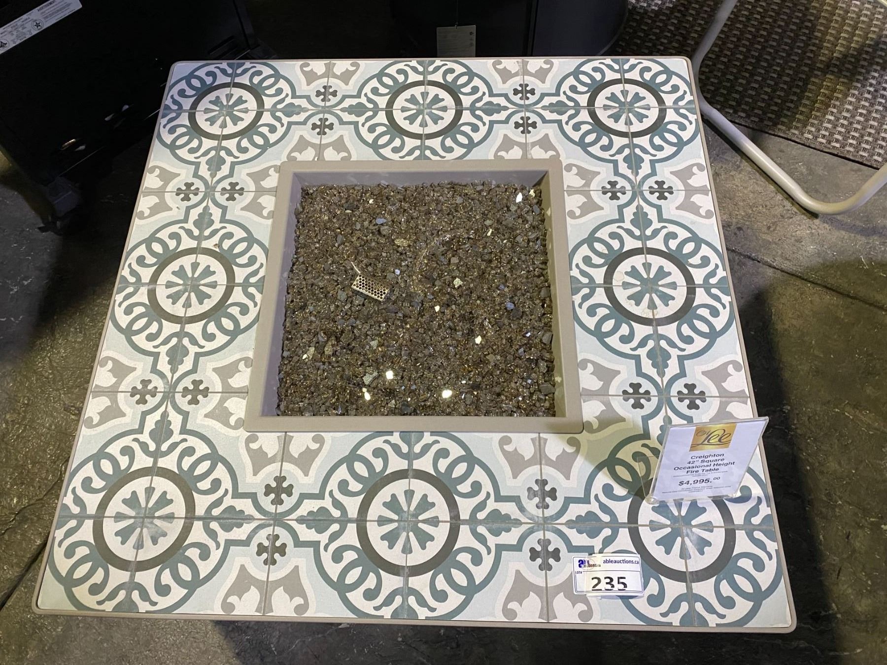 OW LEE CREIGHTON 42" SQUARE OCCASIONAL HEIGHT FIRE TABLE. DRIFTWOOD/VALENCIA TRULLO TILE TOP & SMOKE GLASS, INC COVER & NAT GAS CONVERSION. RETAIL $4995