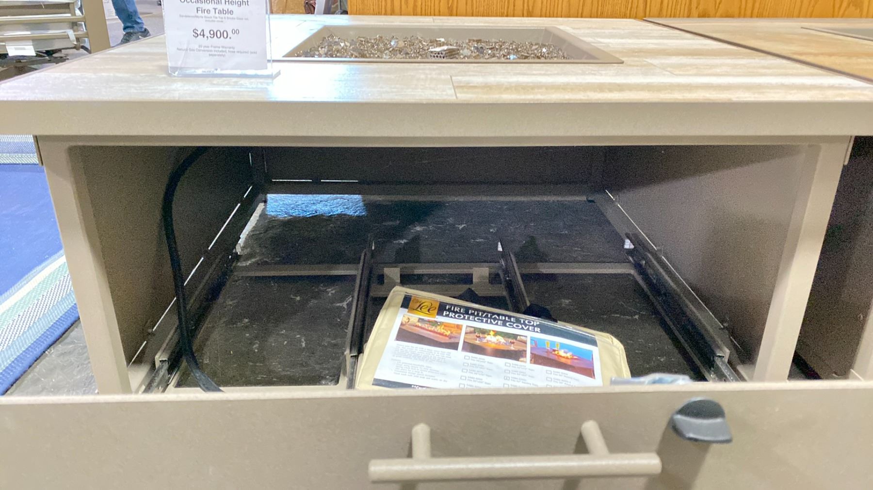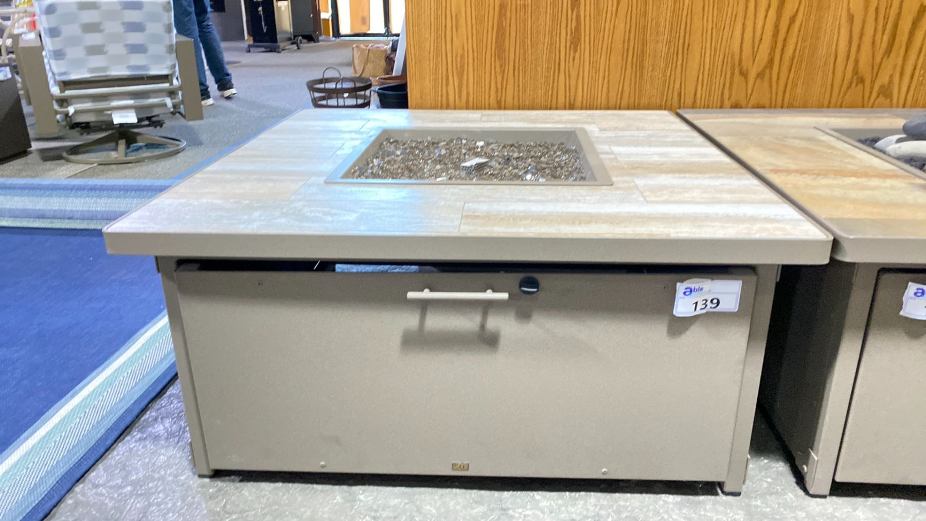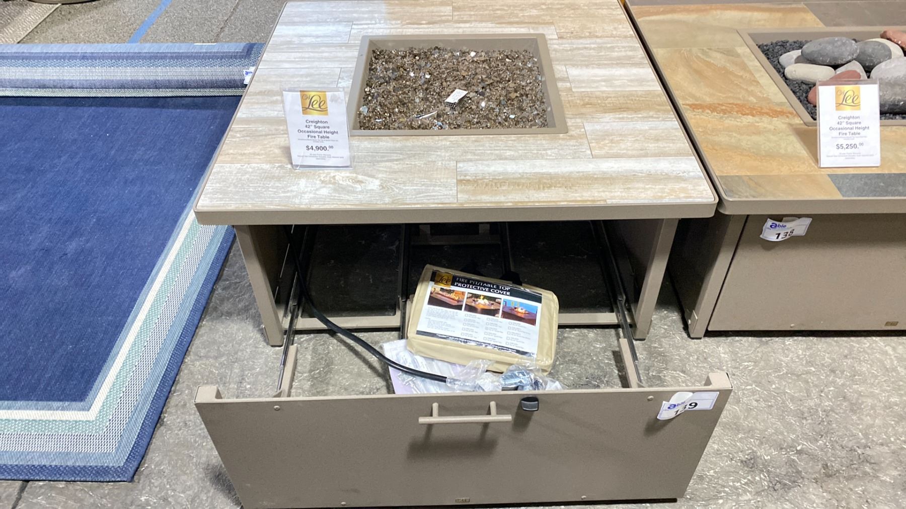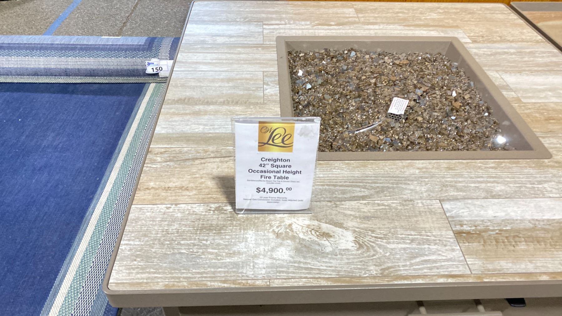 OW LEE CREIGHTON 42" SQUARE OCCASIONAL HEIGHT FIRE TABLE. SANDALWOOD/MYRTLE BEACH TILE TOP & SMOKE GLASS SET. INC COVER. PROPANE TABLE WITH NATURAL GAS ORIFICE SET INC. RETAILS $4900