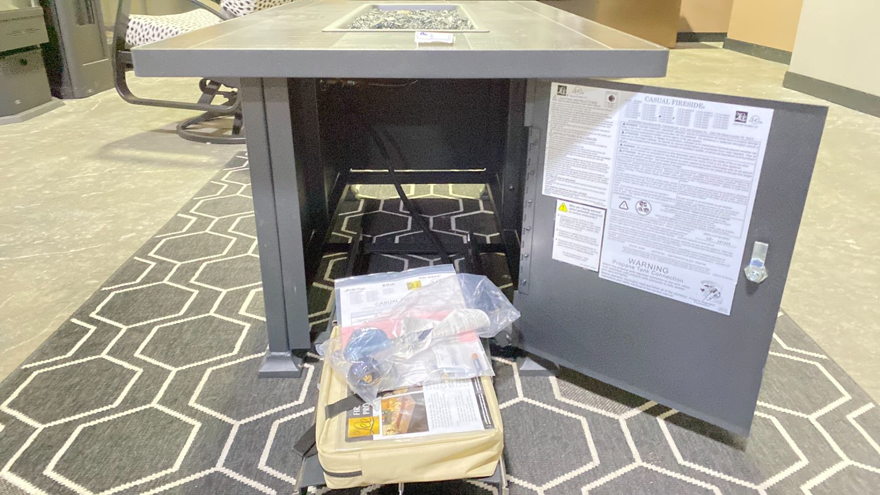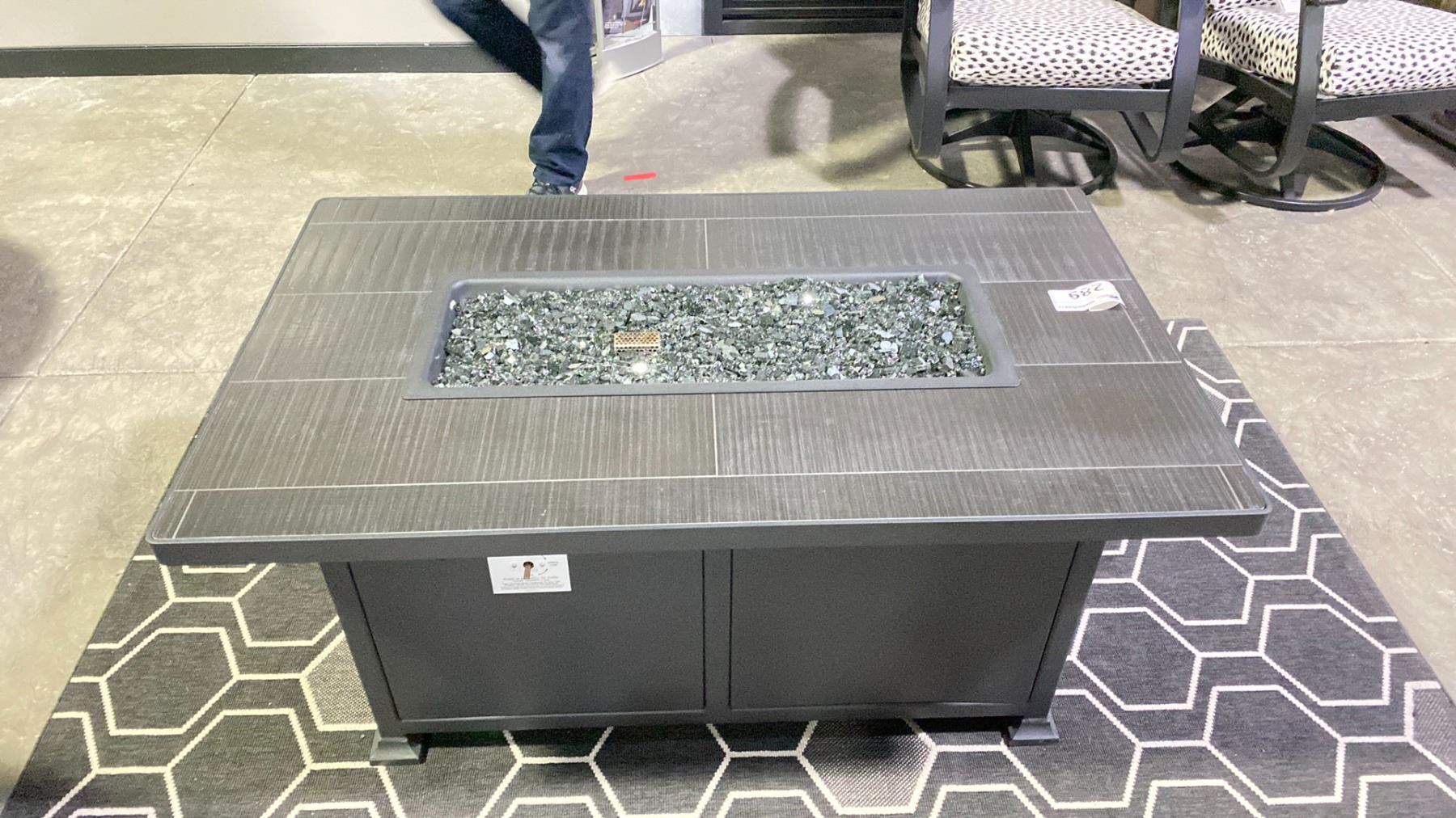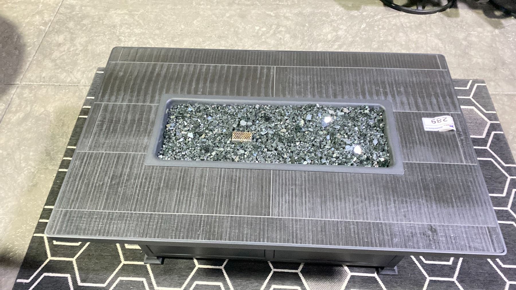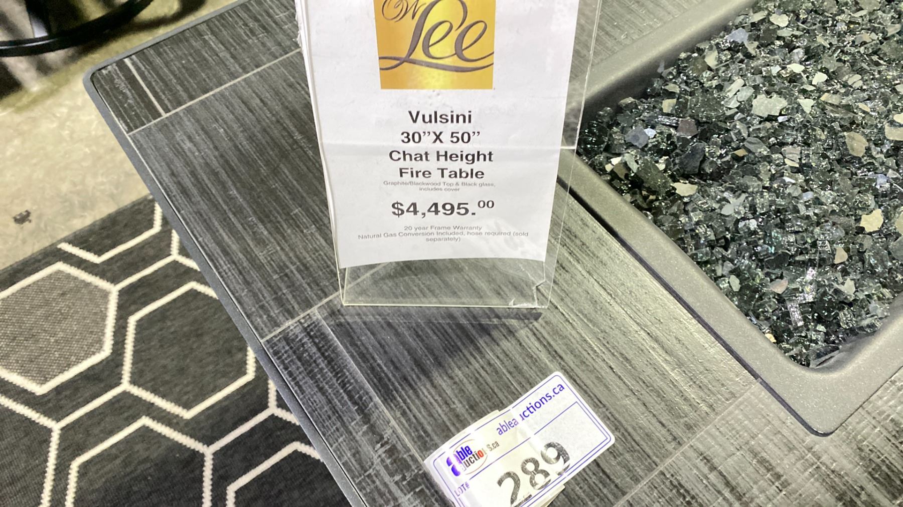 OW LEE VULSINI 30"X50" CHAT HEIGHT FIRE TABLE IN GRAPHITE/BLACKWOOD TOP & BLACK GLASS. INC COVER. PROPANE WITH NAT GAS CONVERSION INCLUDED RETAILS $4500