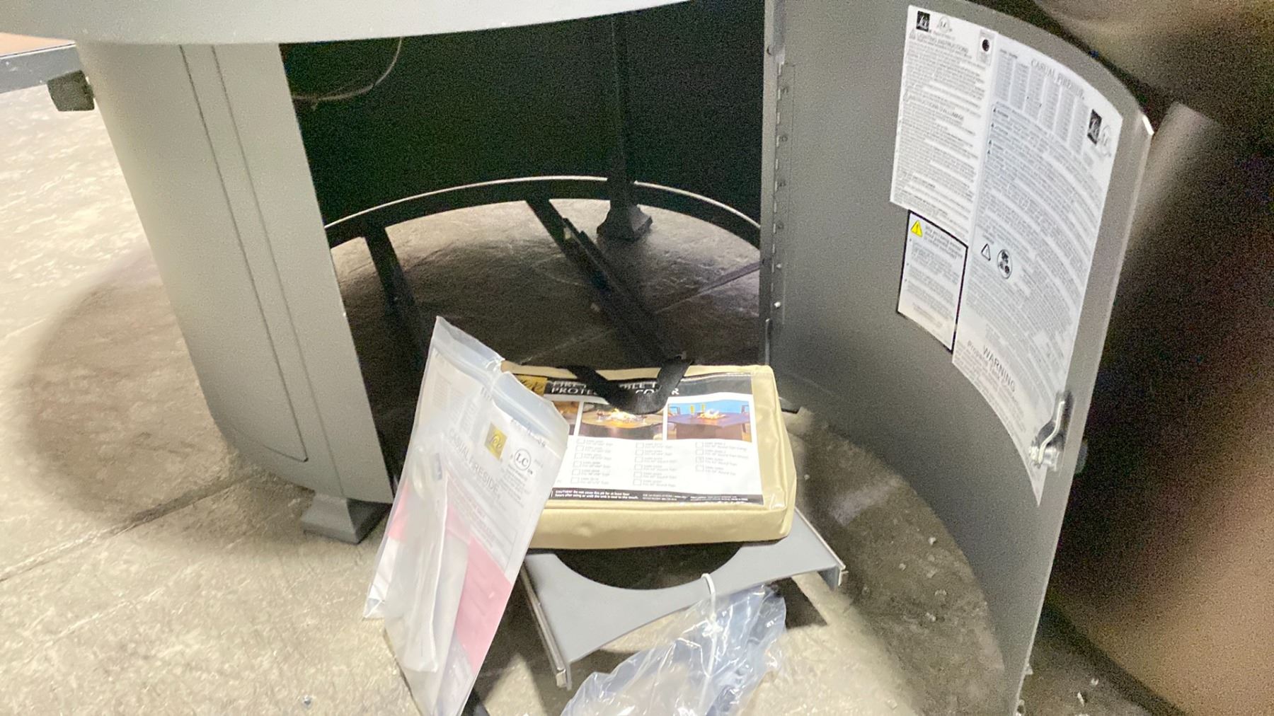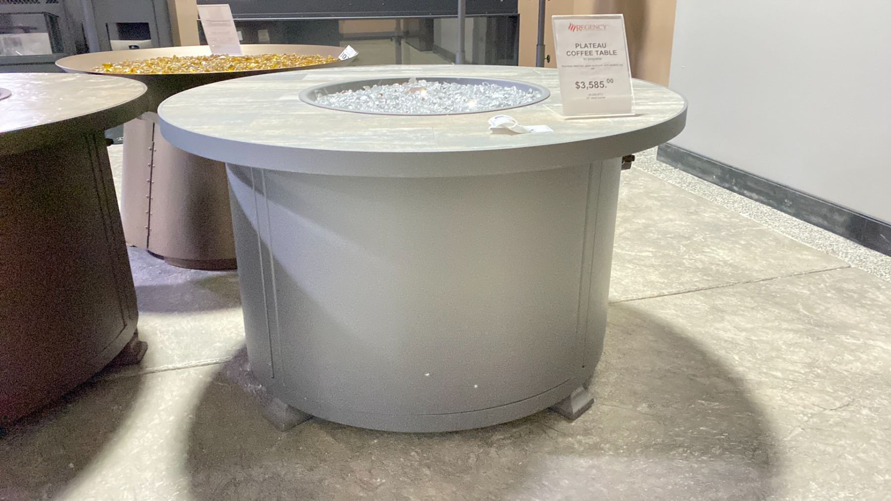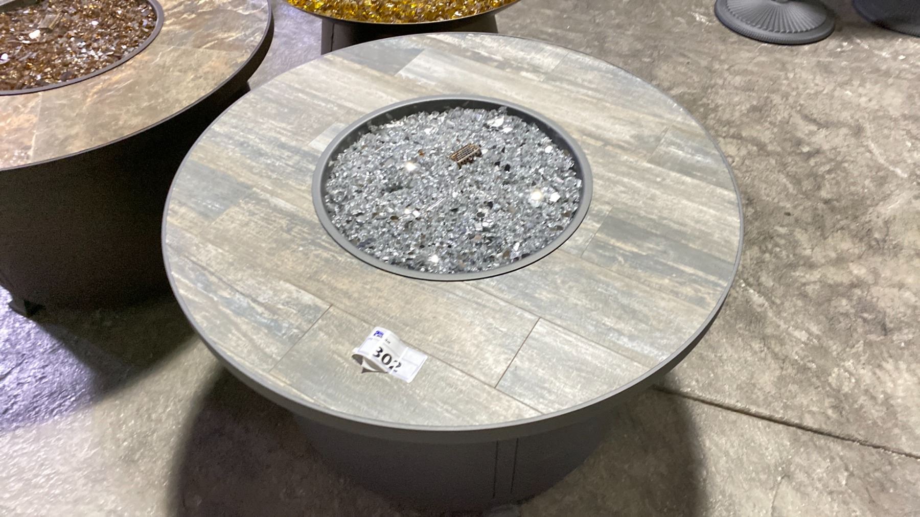 OW LEE VULSINI 42" ROUND CHAT HEIGHT FIRE TABLE. PROPANE BUT HAS NAT GAS CONVERSION INC. VELVET PEWTER/ATLANTIC CITY TILE TOP & SILVER MIRROR GLASS. INC COVER. RETAILS $4350