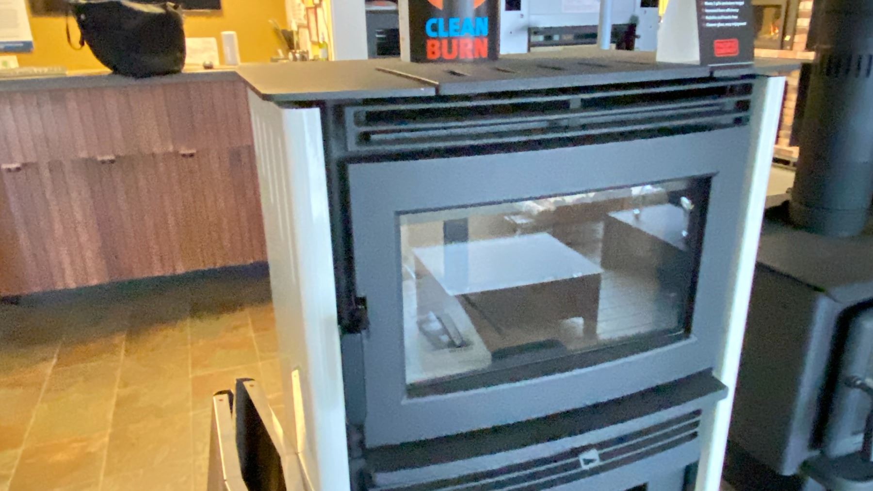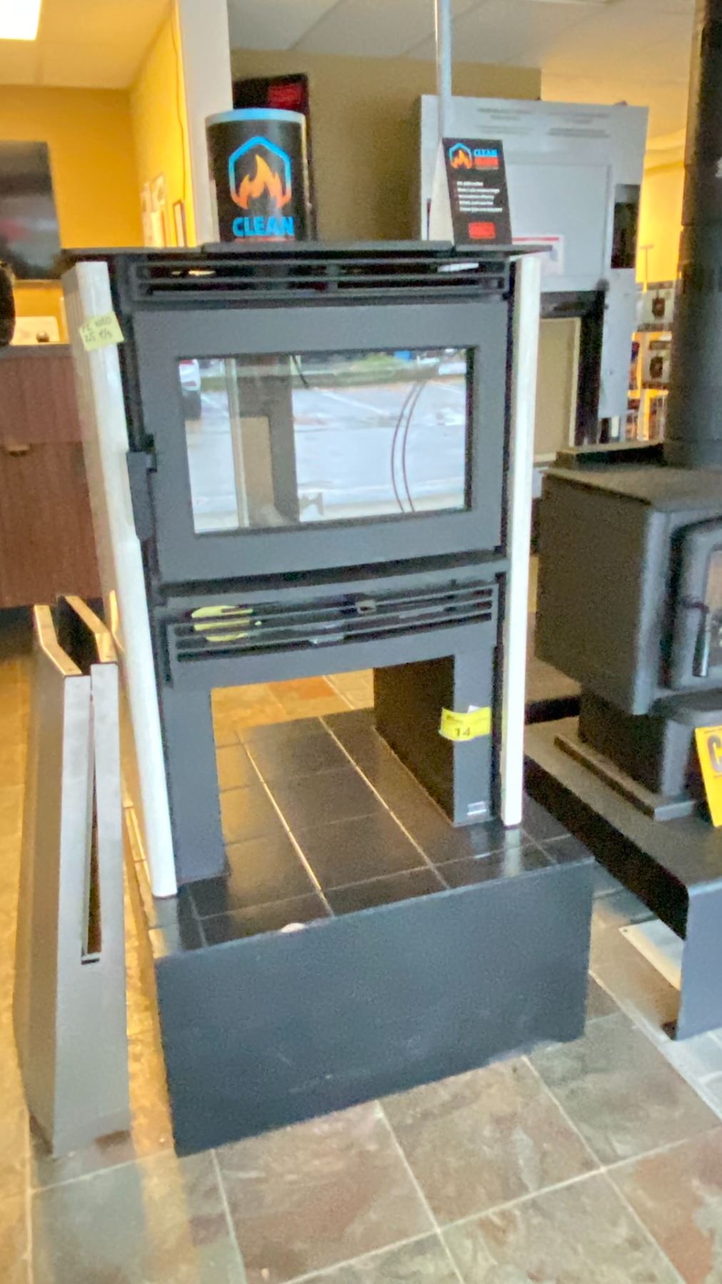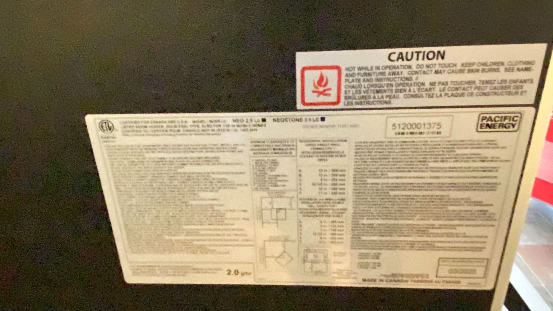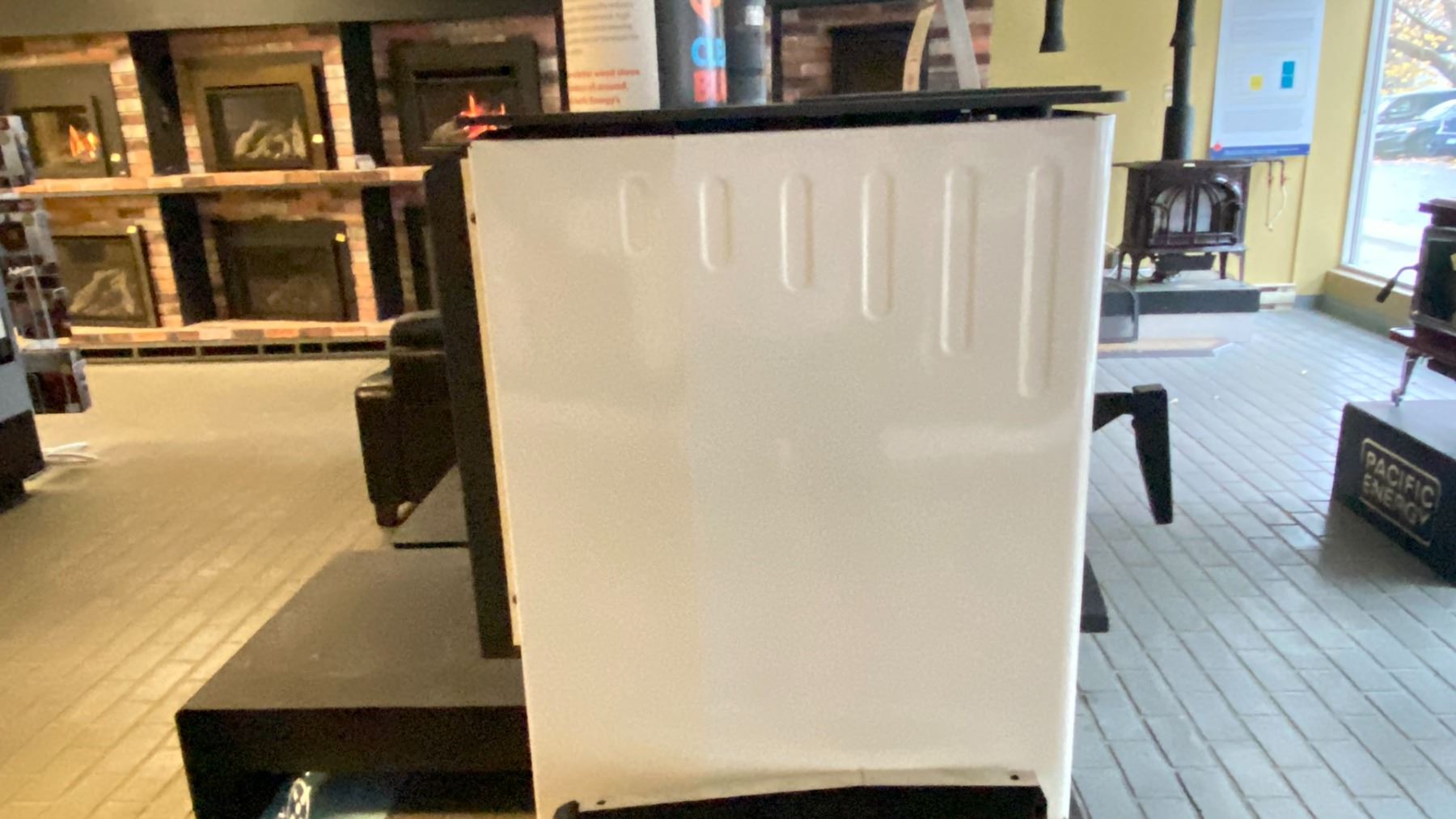 PACIFIC ENERGY NEO LE2.5 CONTEMPORARY WOOD BURNING STOVE PEDESTAL WOOD BURNING STOVE. 2.5 CUBIC FOOT FIREBOX. 85,000 BTU PEAK. 460LBS. 6-INCH CHIMNEY. IVORY SIDE PANEL WITH OPTIONAL STAINLESS STEEL SIDE PANELS.
