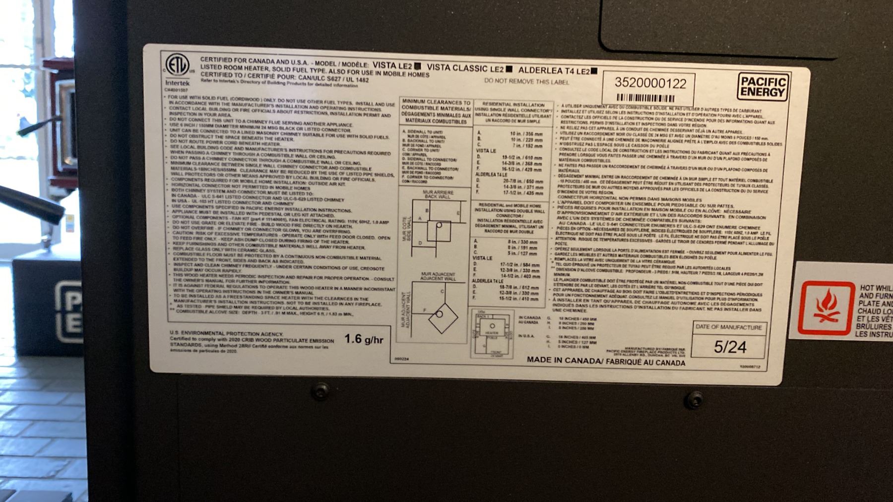 PACIFIC ENERGY VISTA LE2 TRADITIONAL WOOD BURNING STOVE FIRE BOX 2.1 CUBIC FEET. 72,000 BTUS. PEDESTAL BASE.