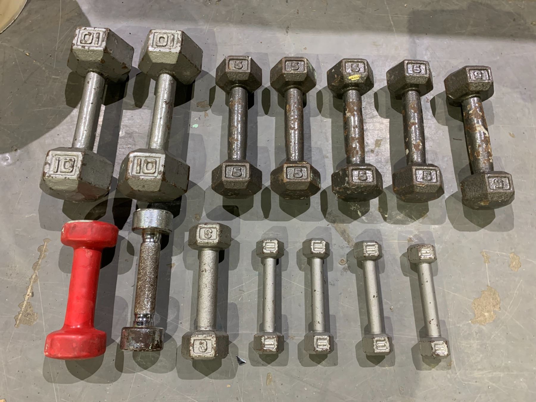 PAIL OF ASSORTED DUMBBELLS INCLUDING; 1 LBS UP TO 10 LBS