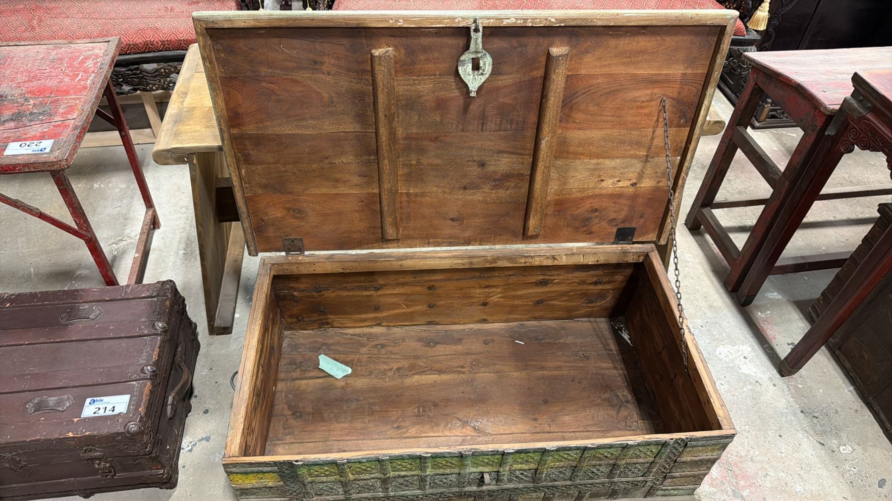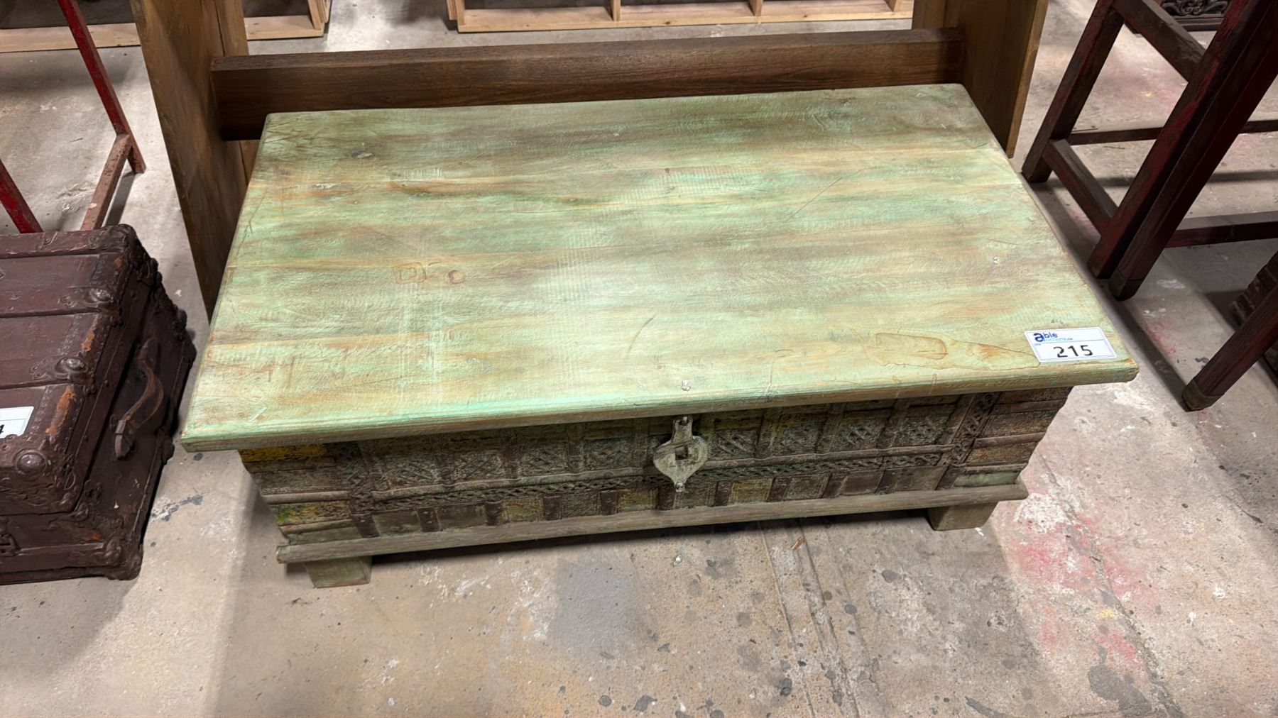 PAINTED GREEN WOODEN STEAMER TRUNK WITH METAL ACCENTS