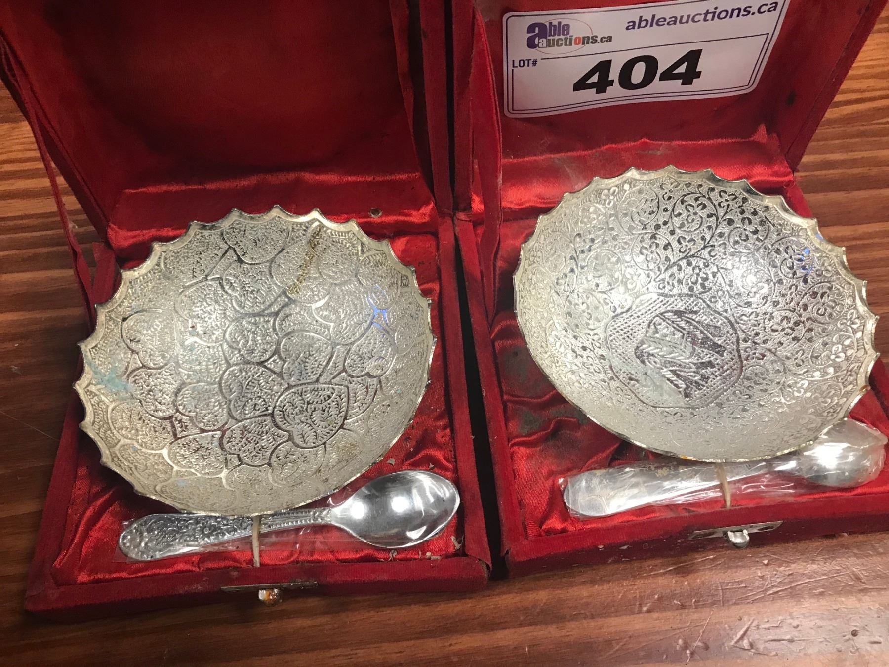 PAIR ANTIQUE STERLING BOWL & SPOON SETS (POLICE RECOVERED - AUTHENTICITY NOT VERIFIED)