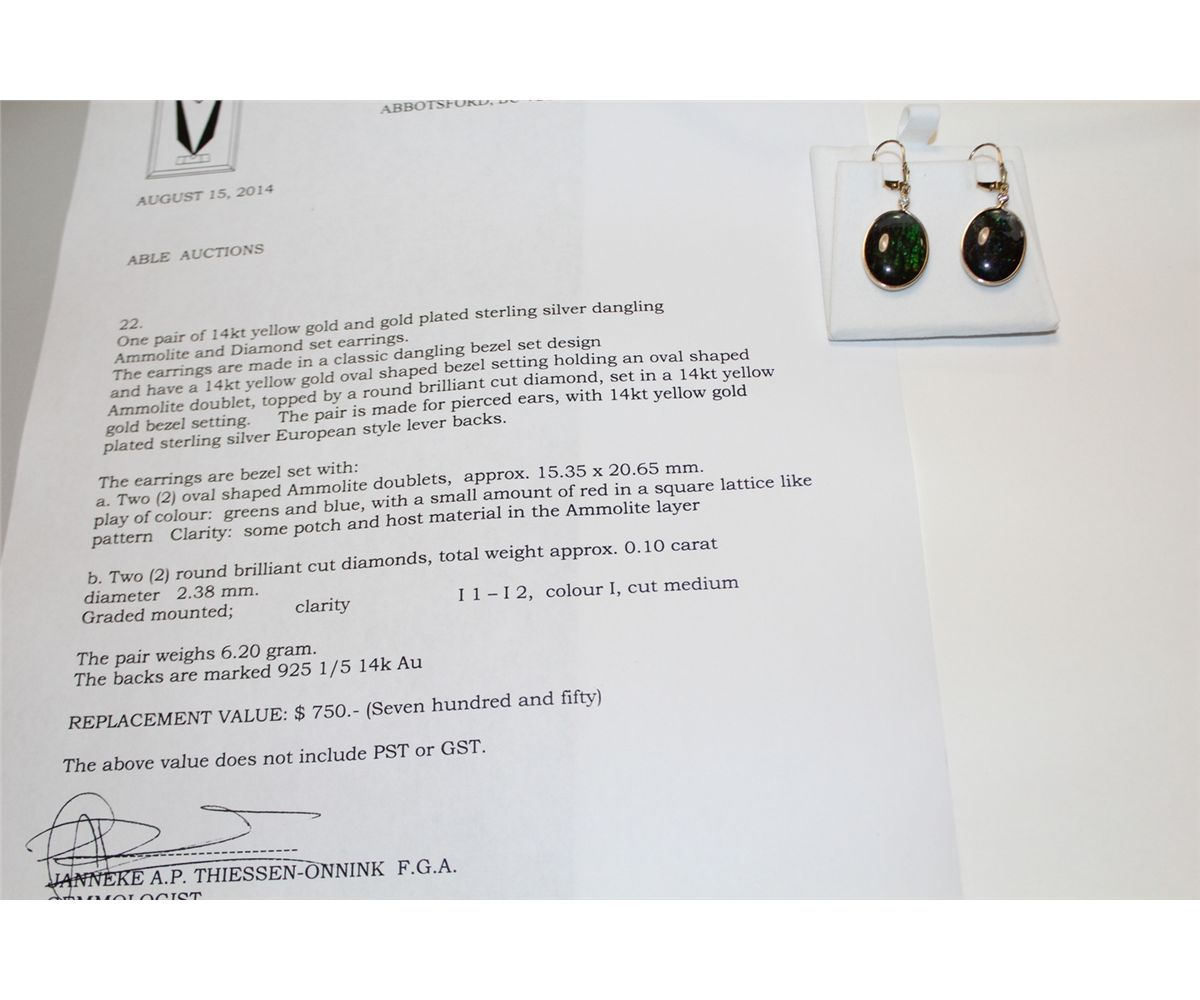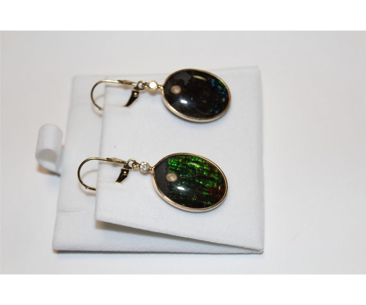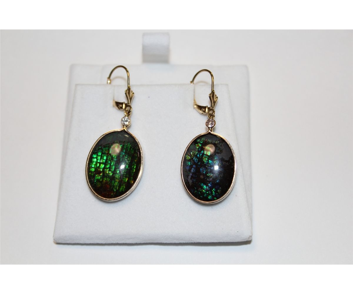 PAIR IF 14 KT. YELLOW GOLD & GOLD PLATED STERLING SILVER DANGLING AMMOLITE & DIAMOND EARRINGS. BEZEL SET WITH 2 OVAL SHAPED AMMOLITE DOUBLETS AND 2 ROUND BRILLIANT CUT DIAMONDS APPROX. 0.10 CARATS. BACK IS MARKED .925.  REPLACEMENT VALUE: $750.00