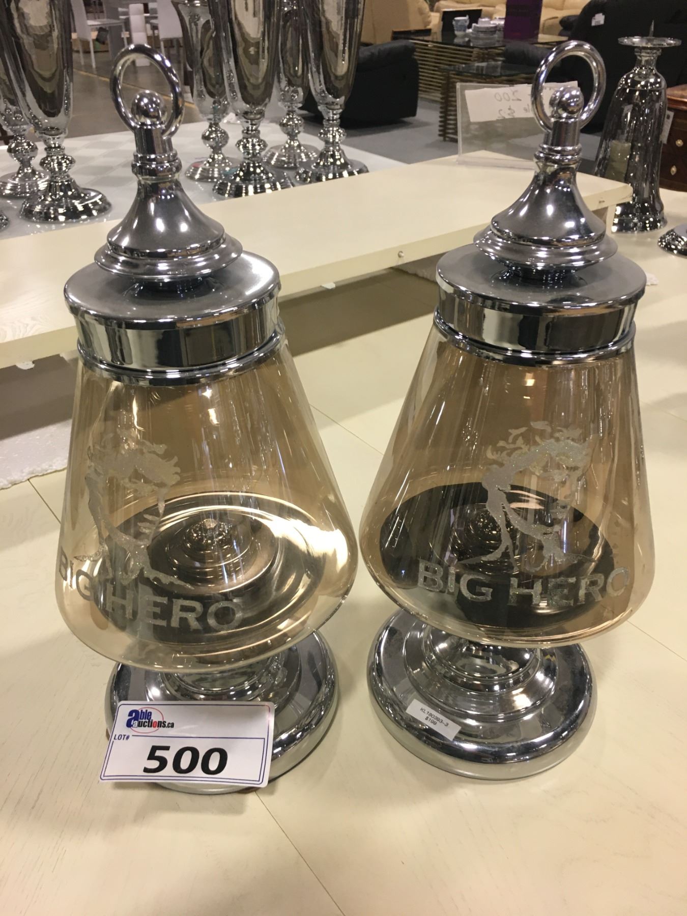 PAIR LIDDED CHROME FINISH & GLASS DRY FLOWER/POTPOURRI URNS