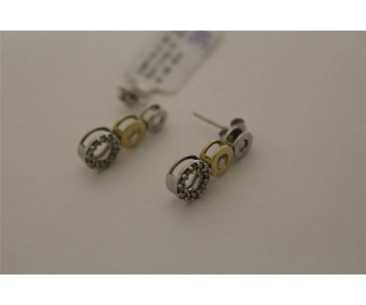 PAIR OF 10K. WHITE GOLD & YELLOW GOLD DIAMOND SET PIERCED EARRINGS. CONTEMPORATY DANGLING DESIGN IN A PAVE SETTING WITH A TOTAL OF 24 ROUND BRILLIANT CUT DIAMONDS. WEIGHT APPROX. 0.24 CARATS. REPLACEMENT VALUE $650.00