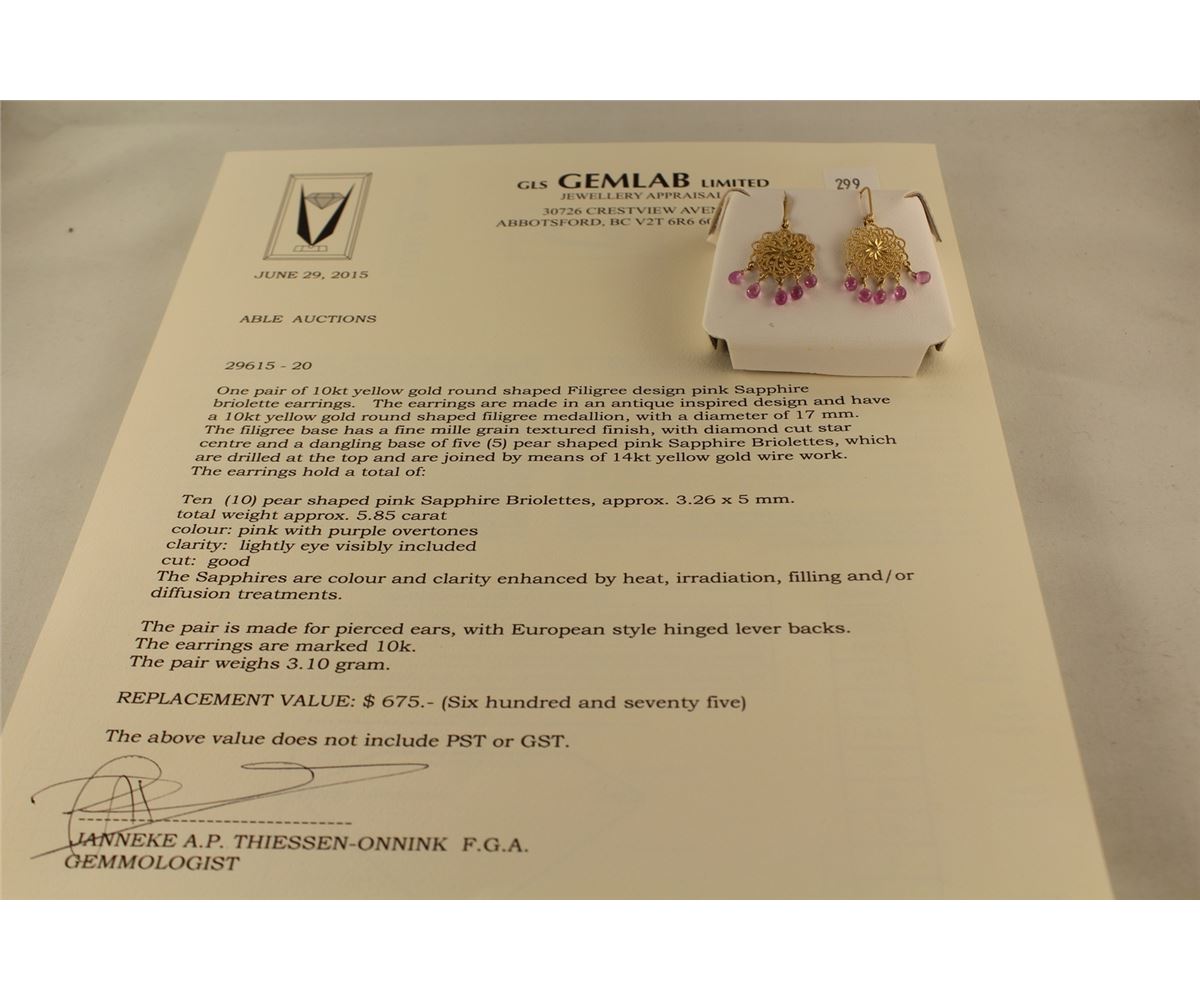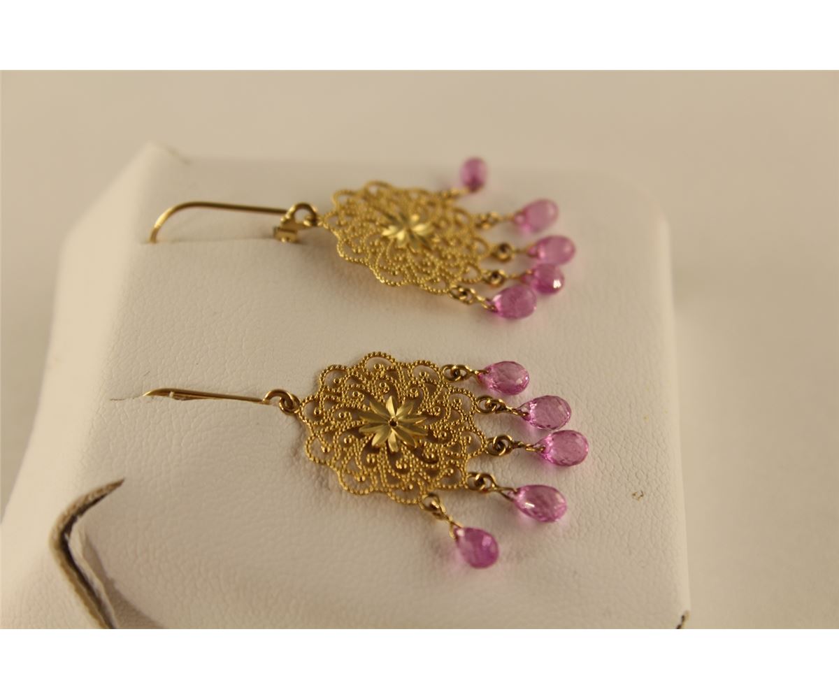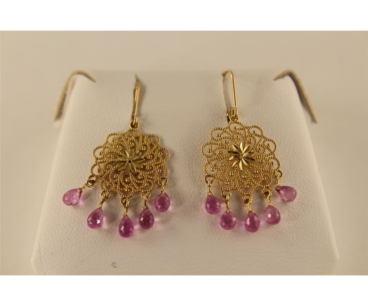 PAIR OF 10KT YELLOW GOLD ROUND SHAPED FILIGREE DESIGN PINK SAPPHIRE BRIOLETTE EARRINGS IN AN ANTIQUE INSPIRED DESIGN WITH A 10KT YELLOW GOLD ROUND SHAPED FILIGREE MEDALLION. HOLDS 10 PEAR SHAPED PINK SAPPHIRE BRIOLETTES APPROX. 5.85 CARATS. REPLACEMENT VLAUE:$675.00