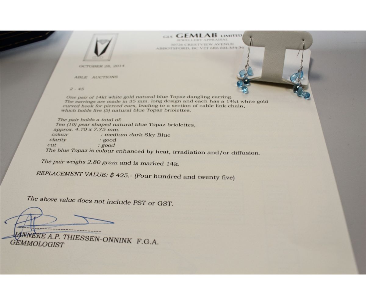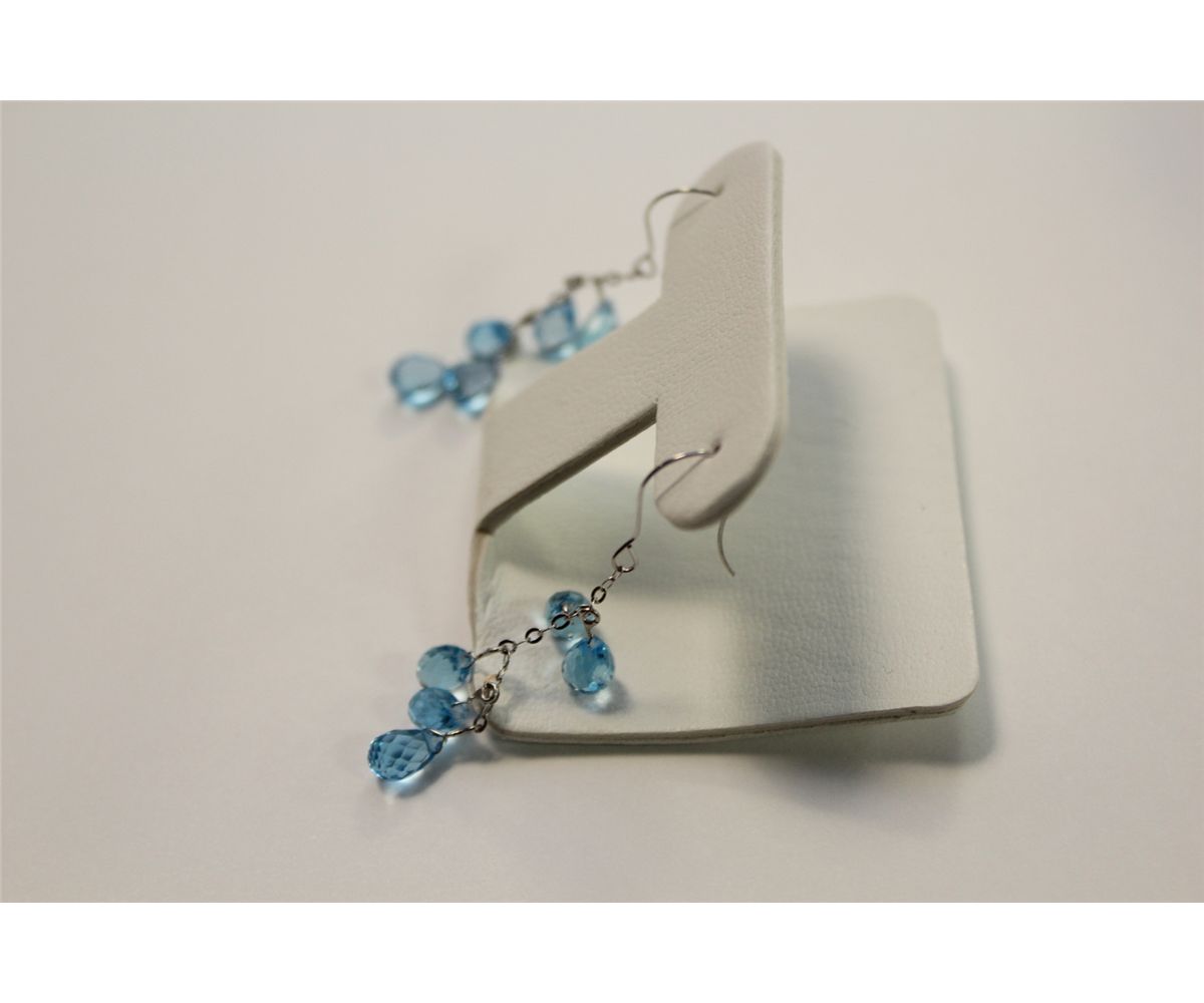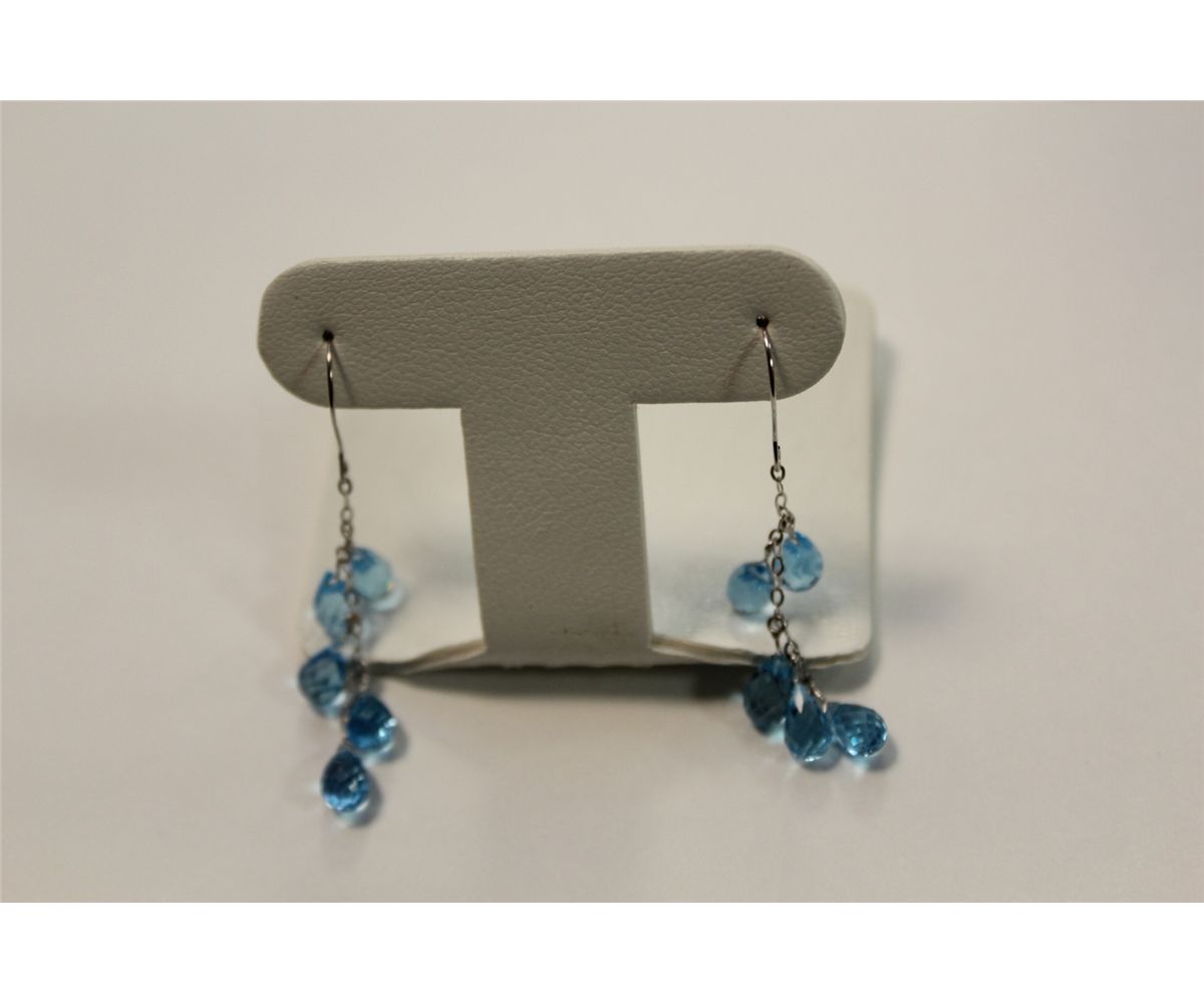 PAIR OF 14 KT WHITE GOLD NATURAL BLUE TOPAZ DANGLING EARRINGS SET WITH 10 PEAR SHAPED NATURAL BLUE TOPAZ BRIOLETTES. REPLACEMENT VALUE: 425