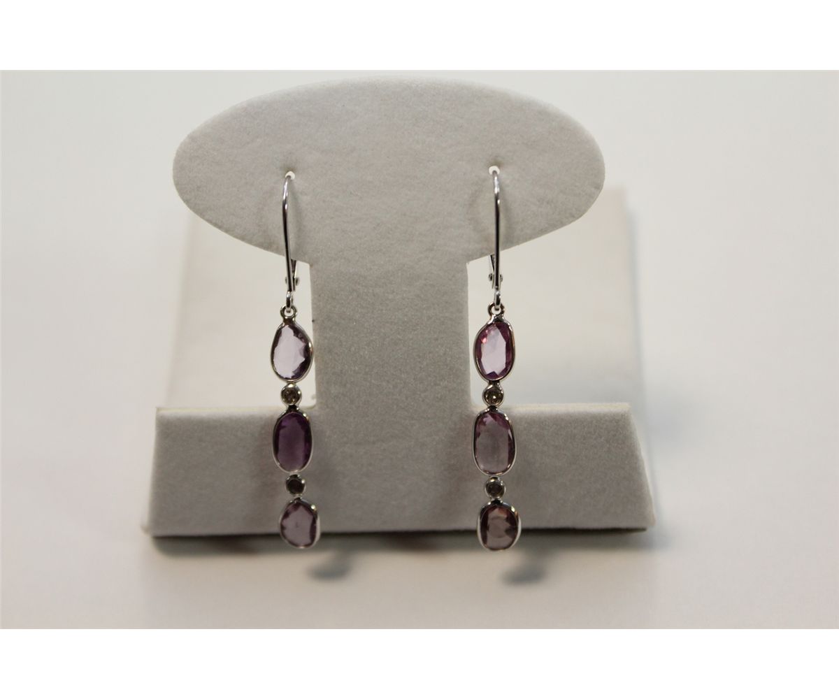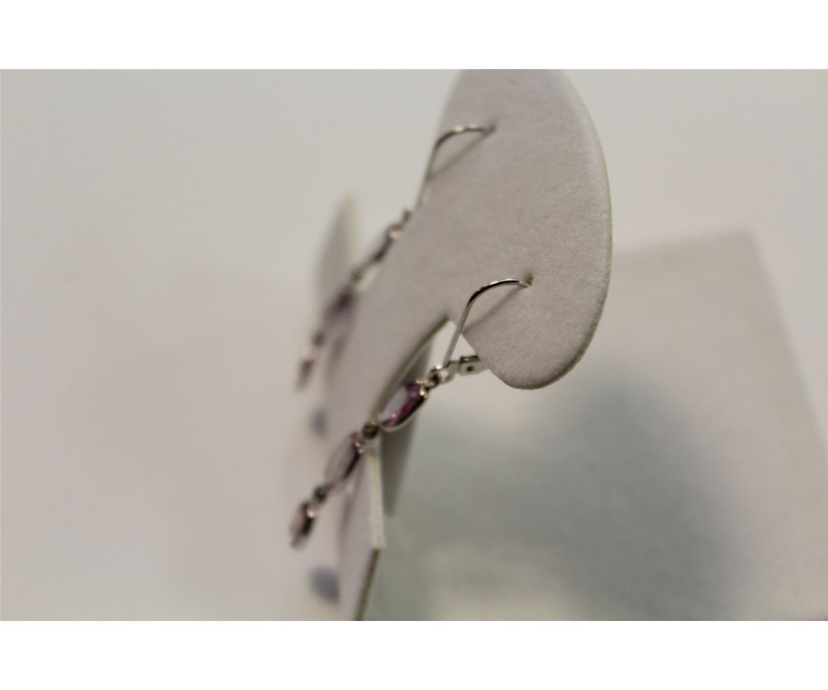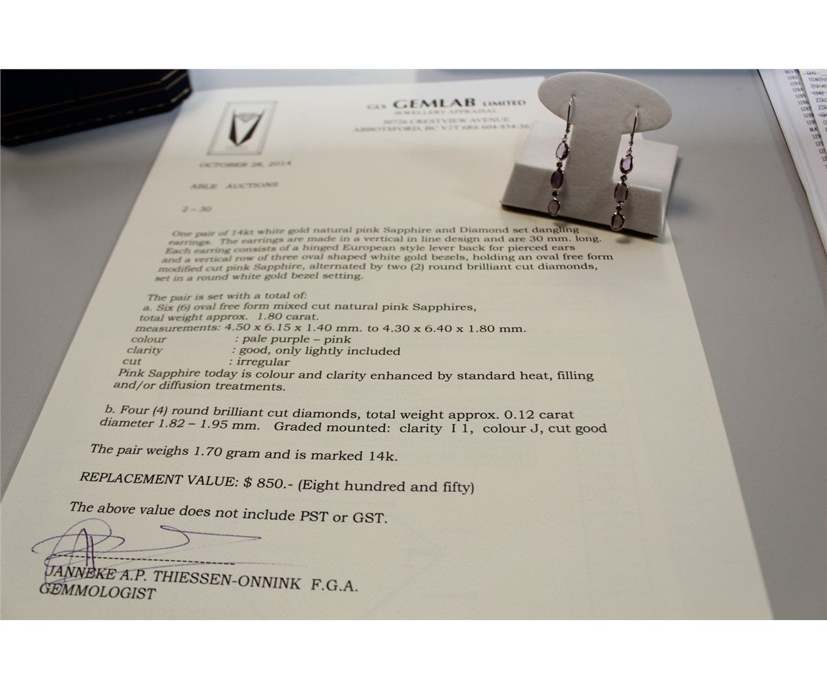 PAIR OF 14 KT WHITE GOLD NATURAL PINK SAPPHIRE AND DIAMOND SET DANGLING EARRINGS. SET WITH 6 OVAL FREE FORM MIXED CUT NATURAL PINK SAPPHIRES APPROX. 1.80 CARATS AND 4 ROUND BRILLIANT CUT DIAMONDS APPROX. 0.12 CARATS. REPLACEMENT VALUE: $850.00