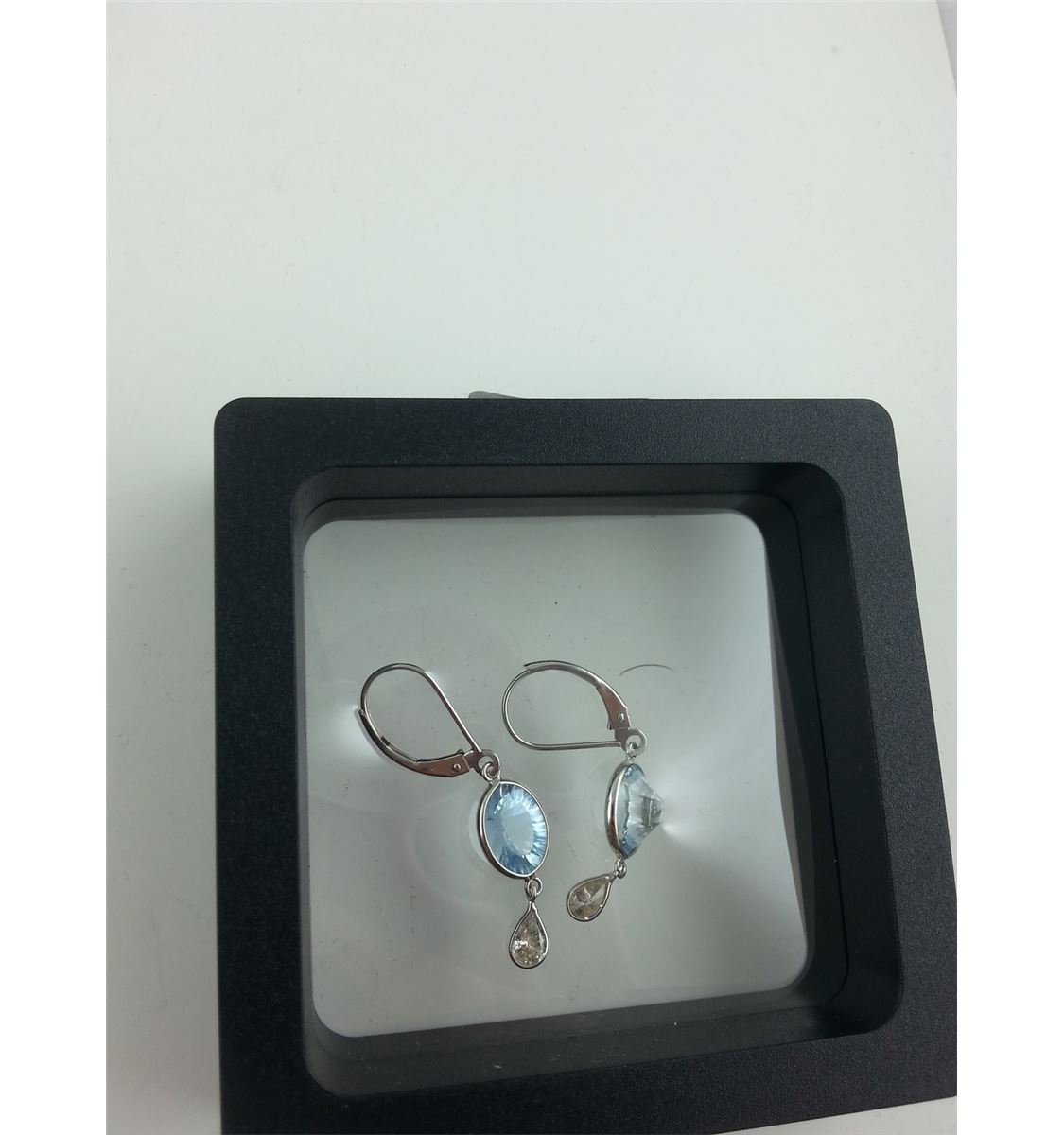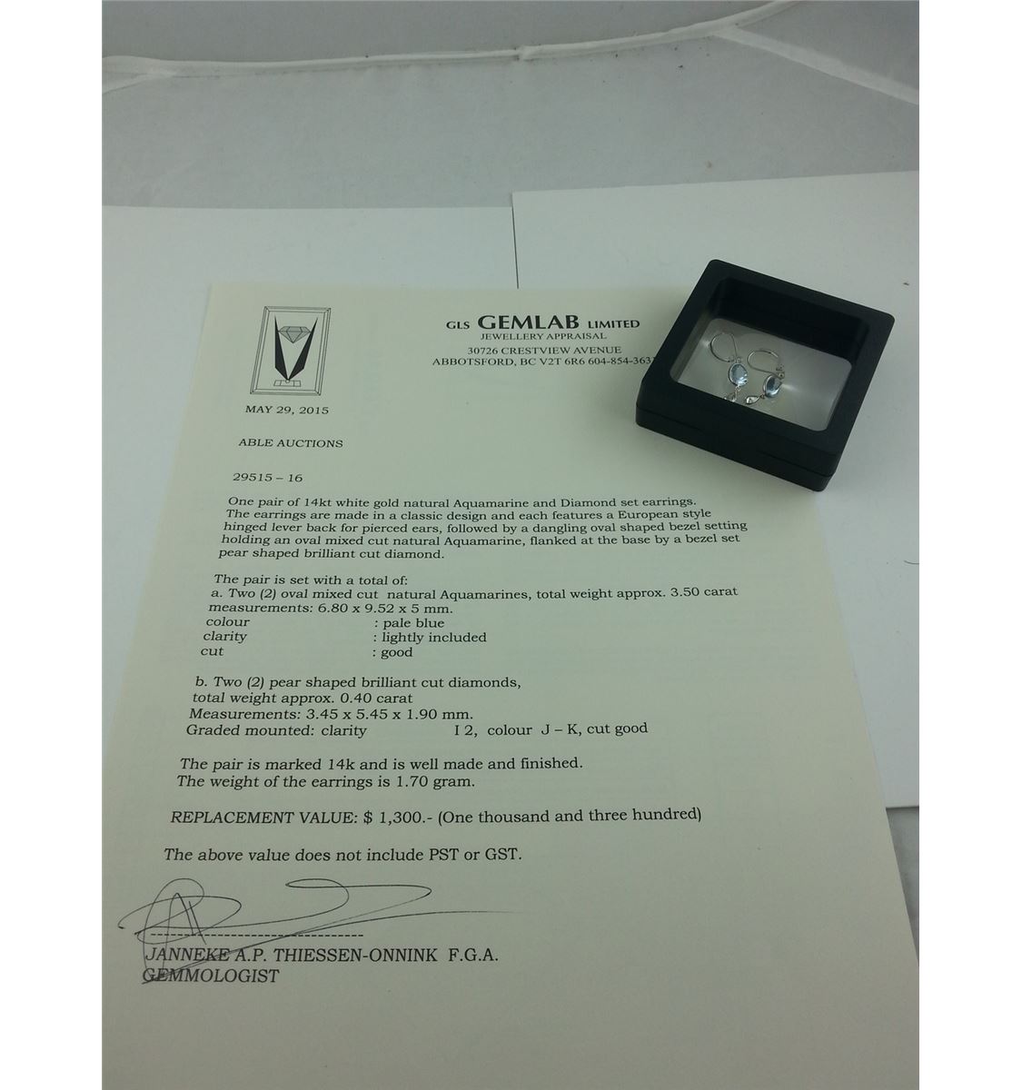 PAIR OF 14KT WHITE GOLD NATURAL AQUA MARINE AND DIAMOND SET EARRINGS WITH 2 AQUAMARINES, APPROX 3.50CARAT AND 2 DIAMONDS, APPROX 0.40CARAT REPLACEMENT VALUE $1300