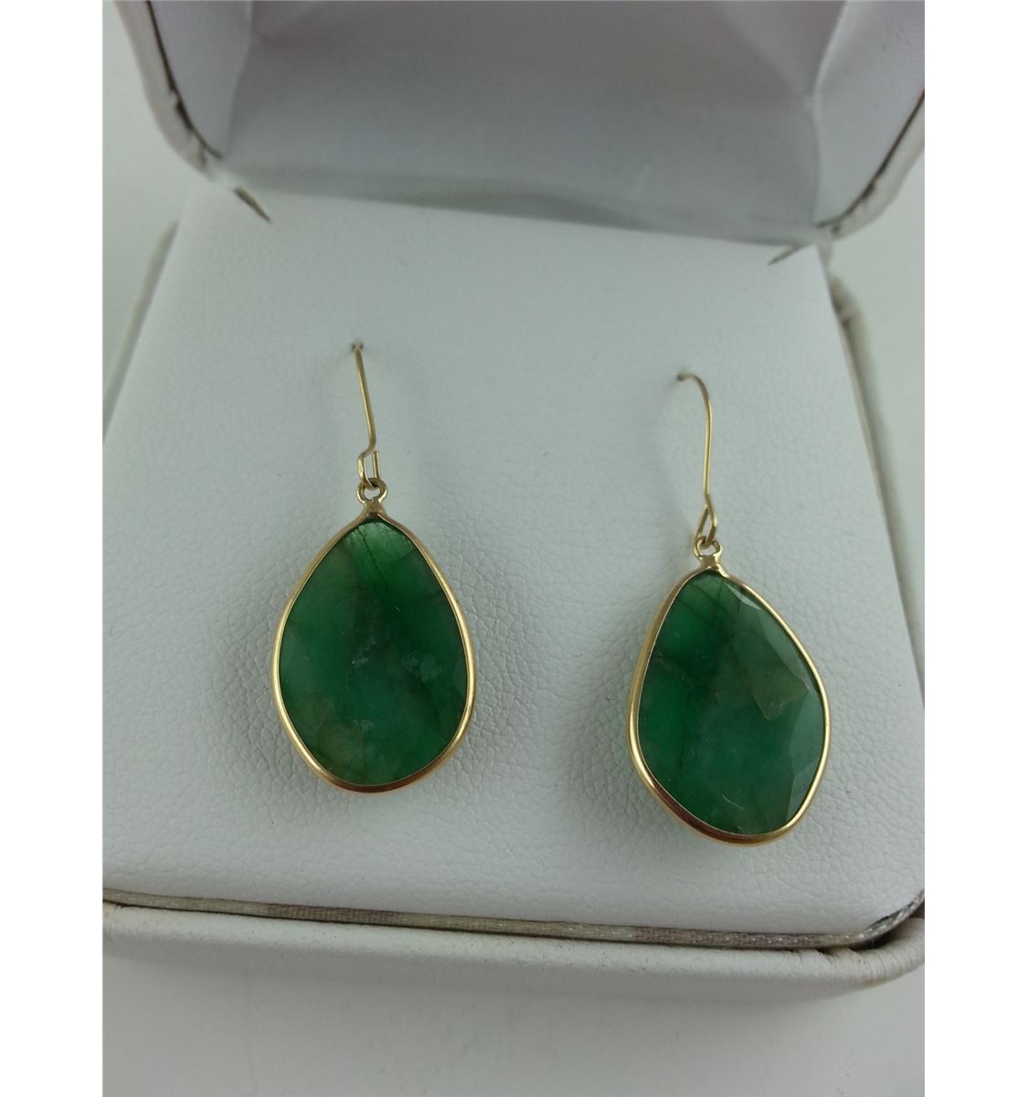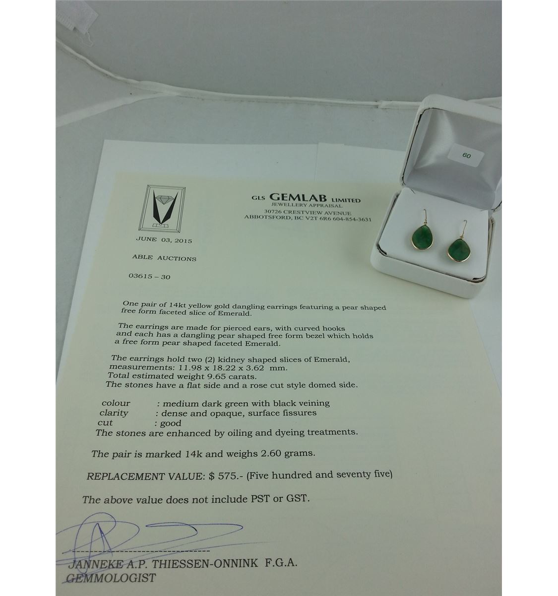 PAIR OF 14KT YELLOW GOLD AND EMERALD DANGLING EARRINGS WITH 2 SLICES OF EMERALD, APPROX 9.65CARATS REPLACEMENT VALUE $575