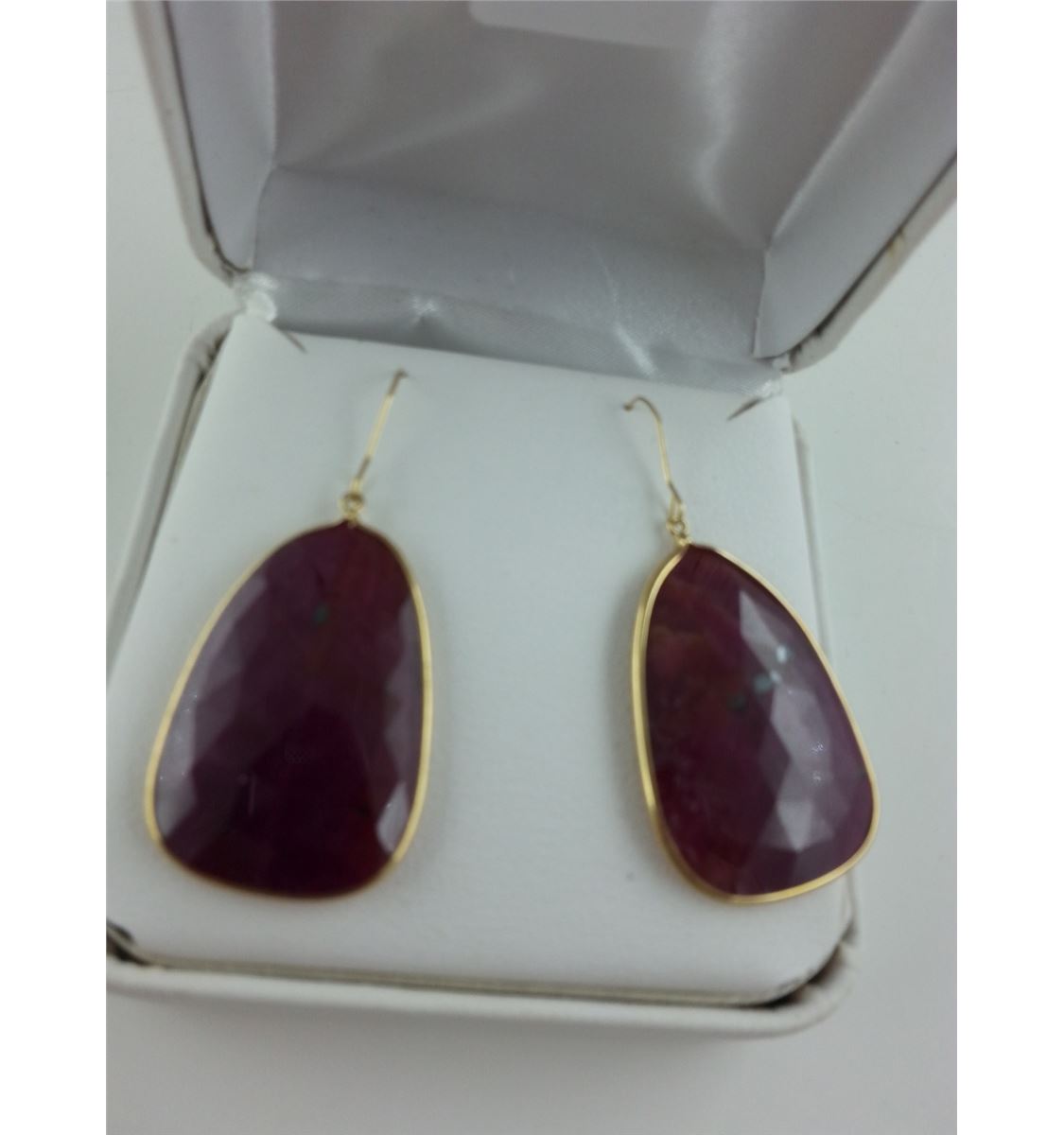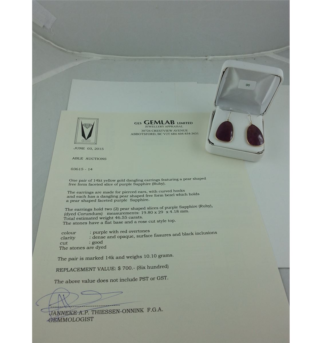 PAIR OF 14KT YELLOW GOLD DANGLING EARRINGS WITH PURPLE SAPPHIRES. SET WITH 2 SLICES OF PURPLE SAPPHIRE (RUBY), APPROX 46.55CARATS REPLACEMENT VALUE $700