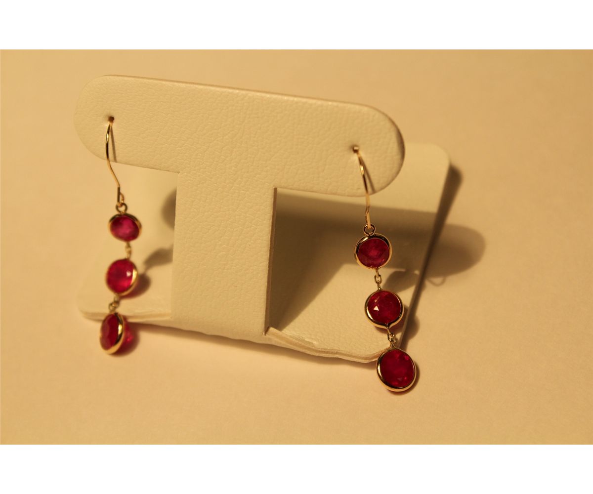 PAIR OF 14KT. YELLOW GOLD DANGLING RUBY EARRINGS SET WITH A TOTAL OF 6 ROUND MIXED CUT GLASS FILLED RUBIES APPROX: 5.50 CARATS. REPLACEMENT VALUE: $1300.00