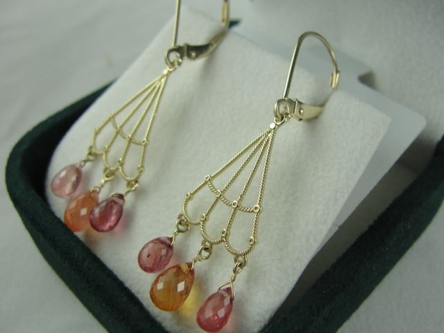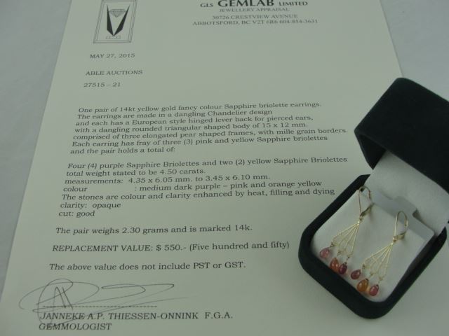 PAIR OF 14KT YELLOW GOLD FANCY COLOUR SAPPHIRE BRIOLETTE EARRINGS WI6 SAPPHIRE BRIOLETTES, APPROX 4.50CARATS REPLACEMENT VALUE $550