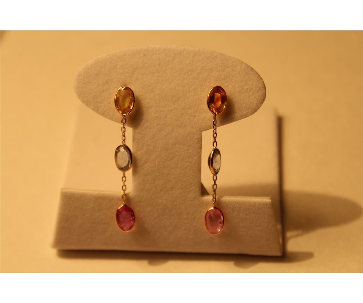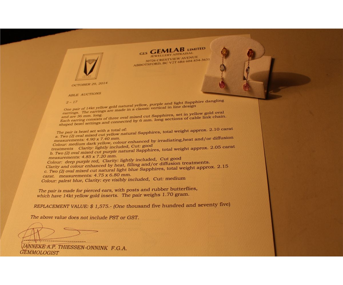 PAIR OF 14KT YELLOW GOLD NATURAL YELLOW, PURPLE AND LIGHT SAPPHIRE DANGLING EARRINGS BEZEL SET WITH 2 OVAL MIXED CUT YELLOW NATURAL SAPPHIRES APPROX. 2.10 CARATS, 2 OVAL MIXED CUT PURPLE NATURAL SAPPHIRES APPROX. 2.05 CARATS, 2 OVAL MIXED CUT NATURAL LIGHT SAPPHIRES APPROX 2.15 CARATS. REPLACEMENT VALUE: $1575.00