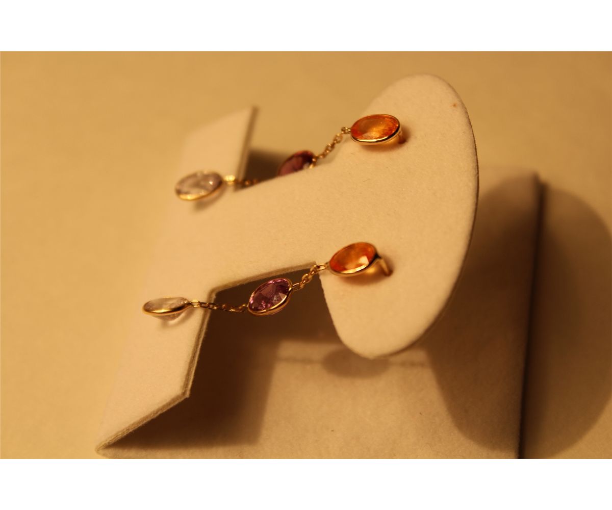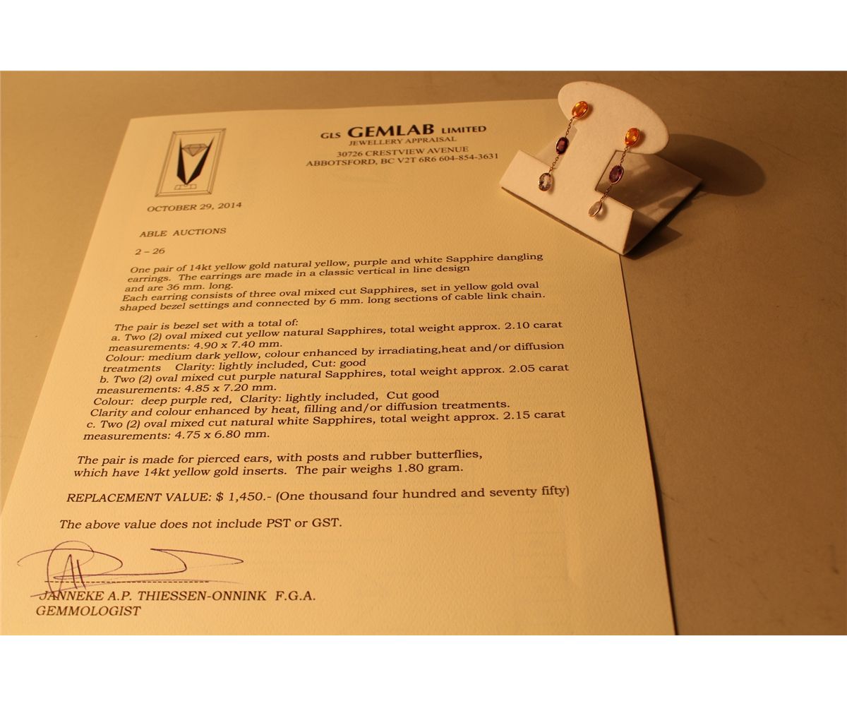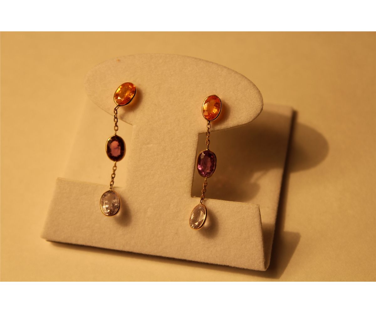 PAIR OF 14KT YELLOW GOLD NATURAL YELLOW, PURPLE AND WHITE SAPPHIRE DANGLING EARRINGS BEZEL SET WITH 2 OVAL MIXED CUT YELLOW NATURAL SAPPHIRES APPROX. 2.10 CARATS, 2 OVAL MIXED CUT PURPLE NATURAL SAPPHIRES APPROX. 2.05 CARATS, 2 OVAL MIXED CUT NATURAL WHITE NATURAL SAPPHIRES 2.15 CARATS. REPLACEMENT VALUE: $1450.00