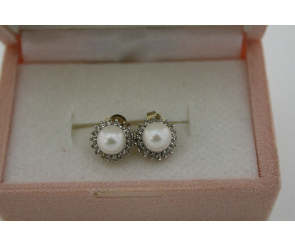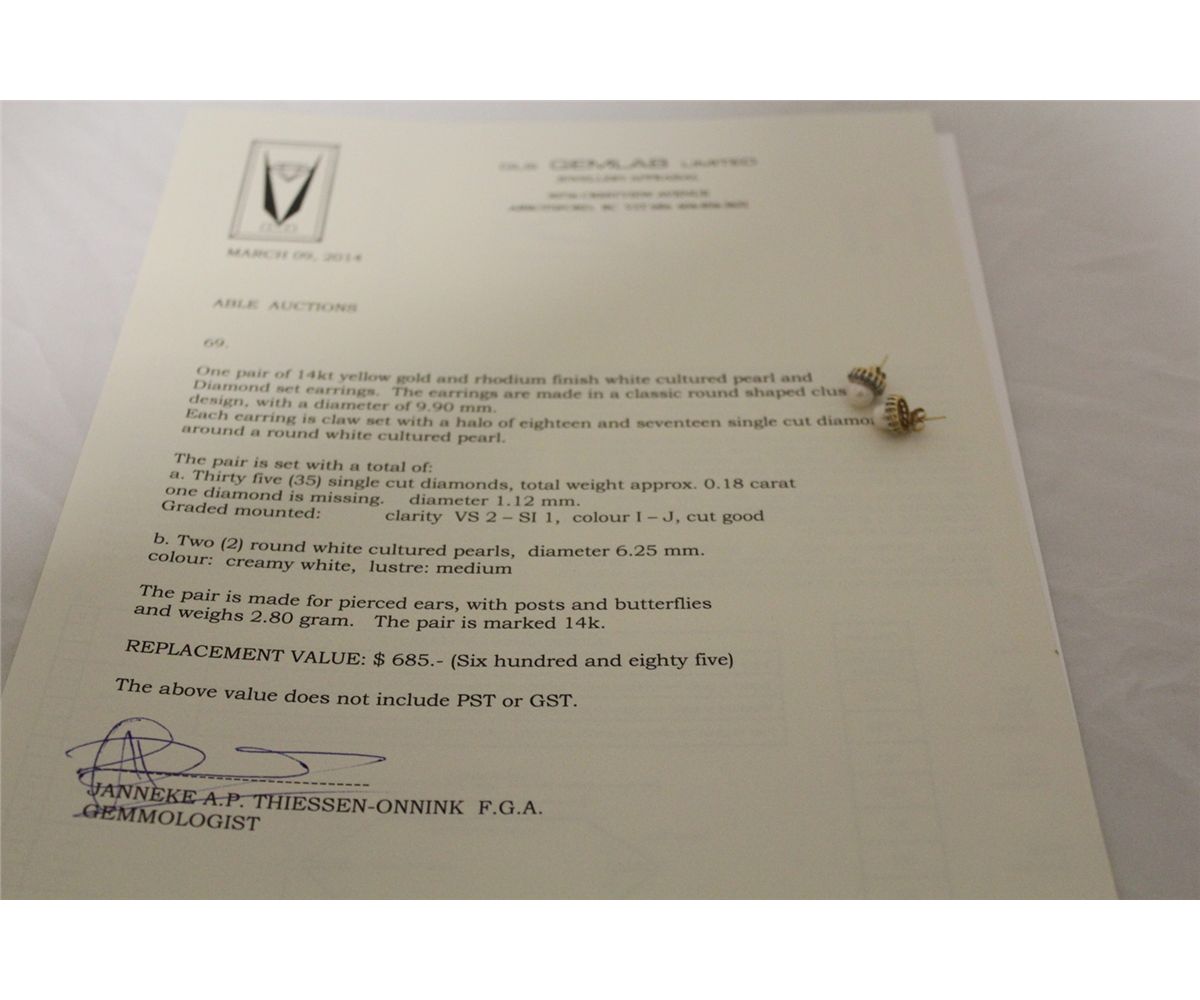 PAIR OF 14KT. YELLOW GOLD & RHODIUM FINISH WHITE CULTURED PEARL AND DIAMOND SET EARRINGS.  SET WITH A TOTAL  OF 35 SINGLE CUT DIAMONDS APPROX. 0.18 CARATS & 2 ROUND WHITE CULTURED PEARLS.  REPLACEMENT VALUE $685.00
