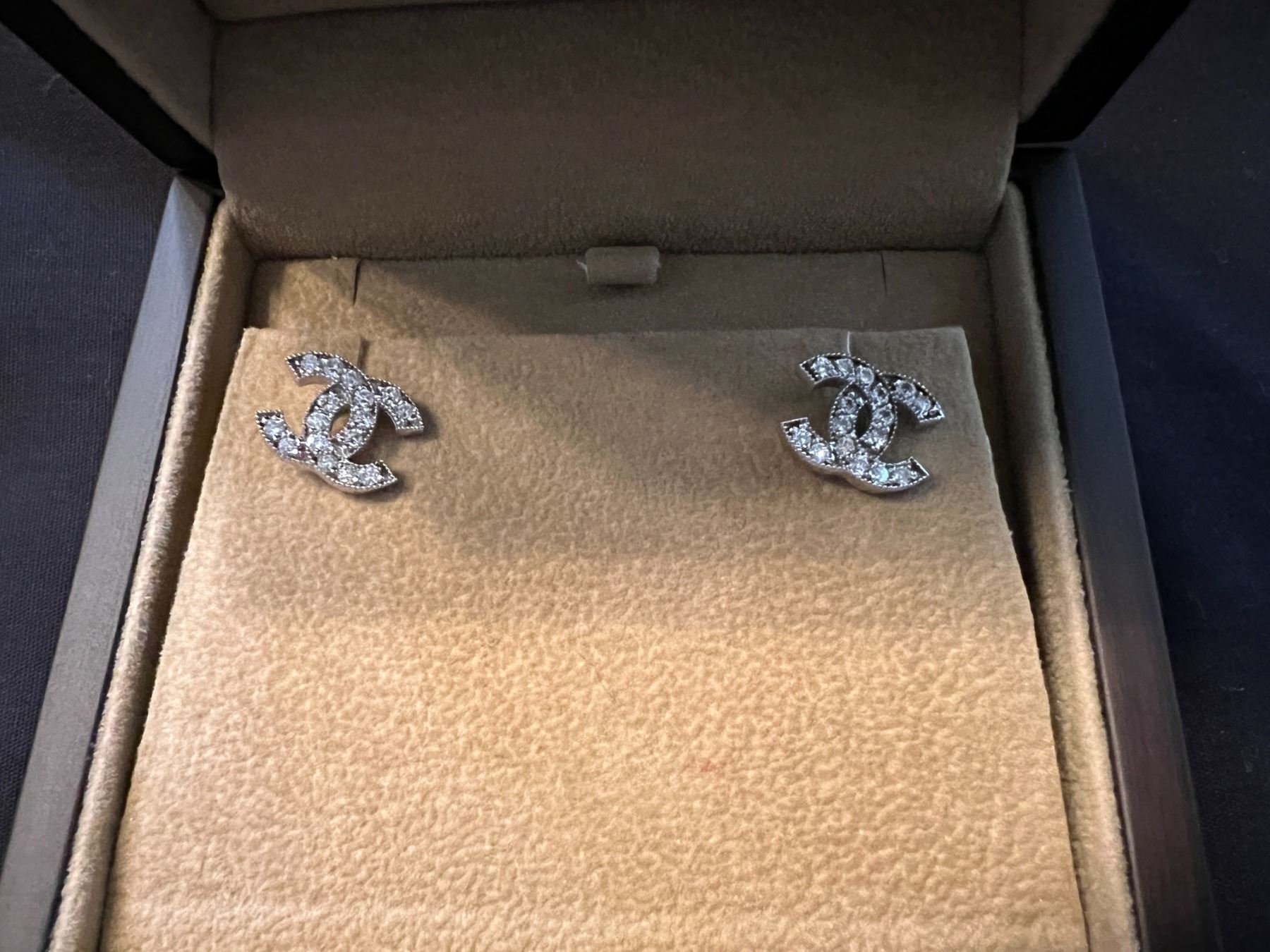 PAIR OF 18K WHITE GOLD DIAMOND SET EARRINGS WITH 2 INTERSECTING C'S INSPIRED BY THE CHANEL LOGO REPLACEMENT 3250.00
