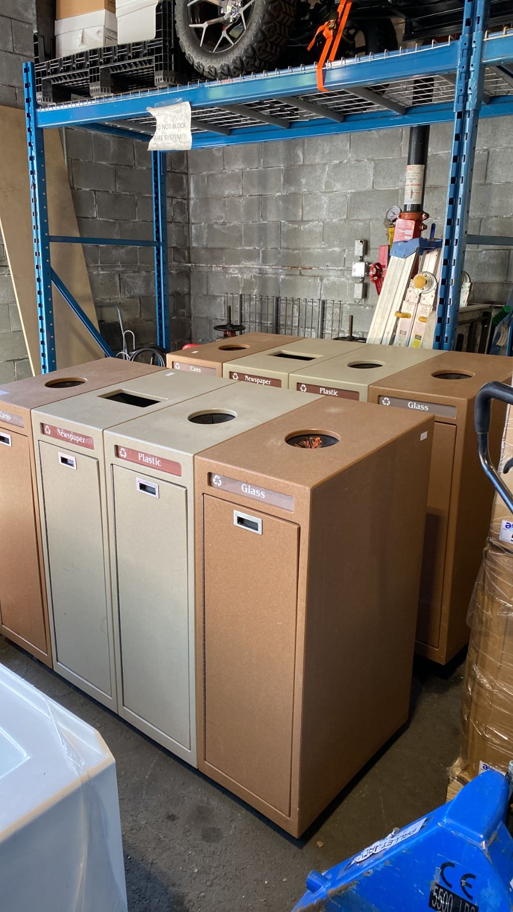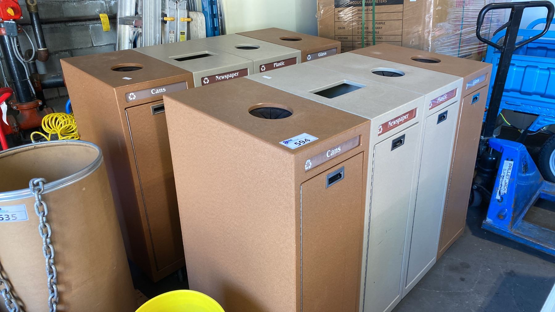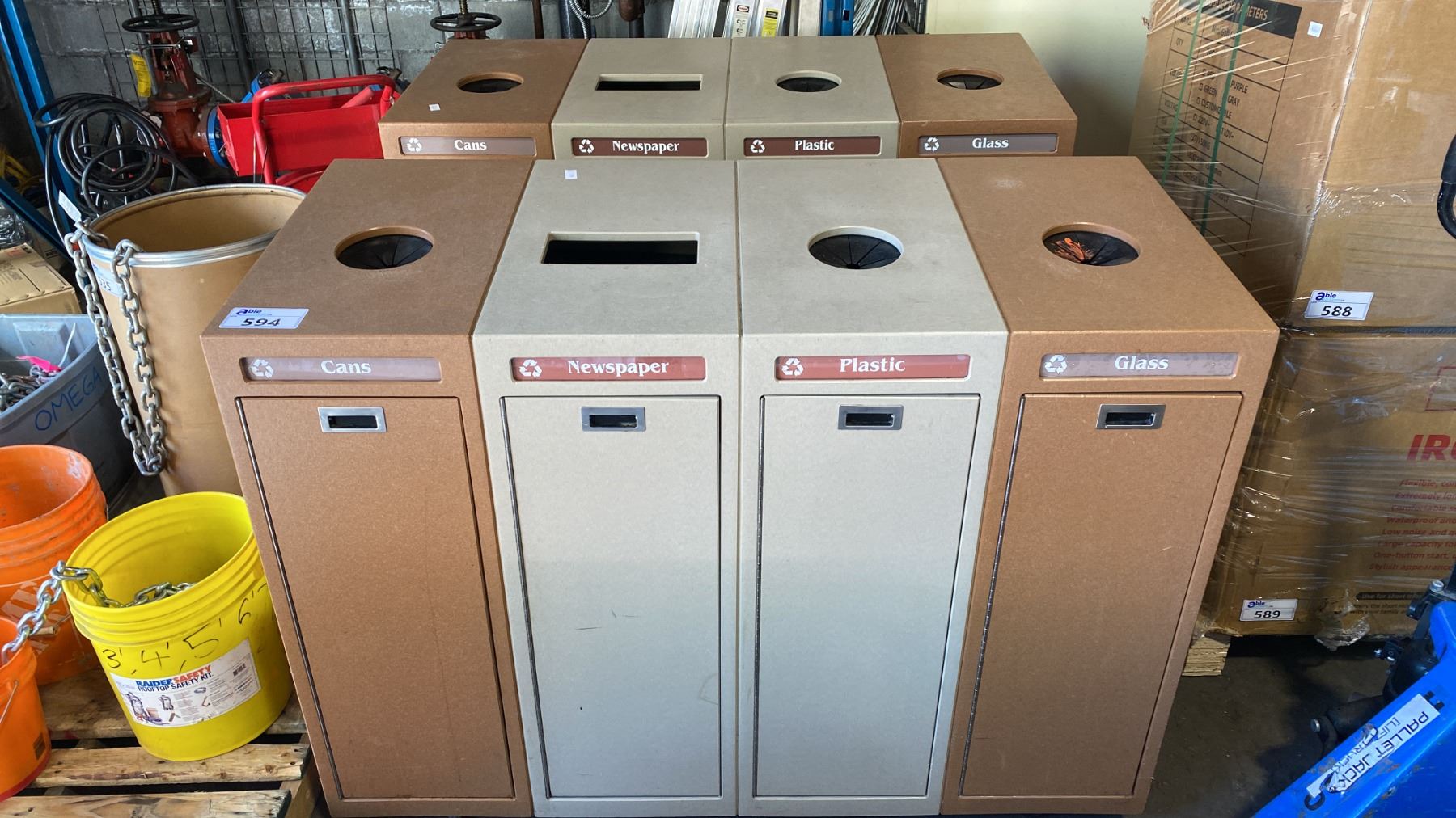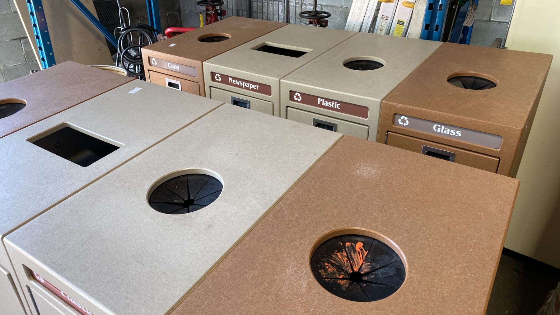 PAIR OF 4 BAY BROWN COMMERCIAL TRASH/RECYCLING STATIONS
