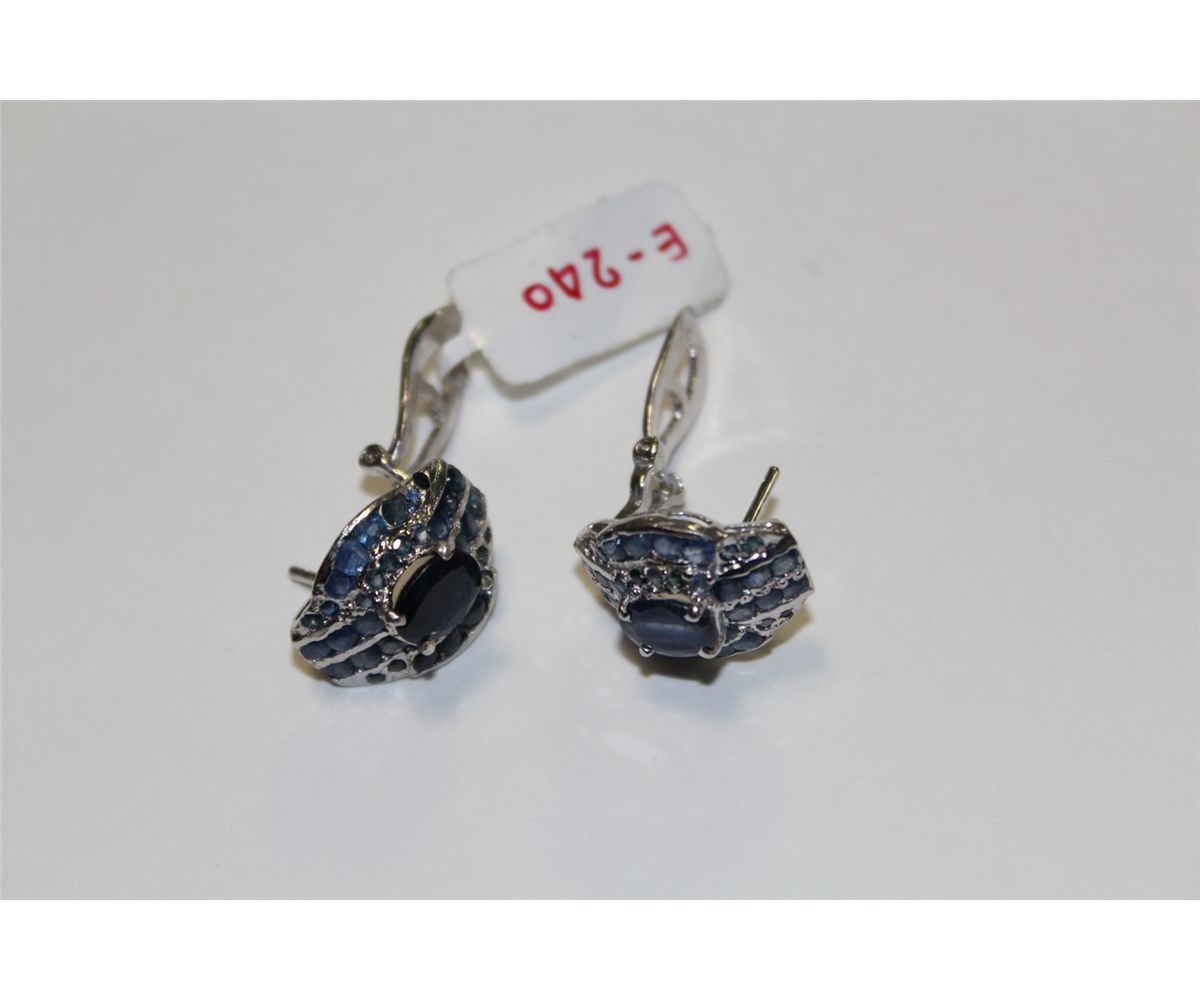 PAIR OF 925 STERLING SILVER NATURAL BLUE SAPPHIRE EARRINGS CLAW SET WITH 2 OVAL MIXED CUT NATURAL BLUE SAPPHIRES APROX. 2.50 CARATS AND BEAD AND CHANNEL SET WITH 76 ROUND MIXED CUT PROMO QUALITY BLUE SAPPHIRES APPROX 3 CARATS. REPLACEMENT VALUE $335.00