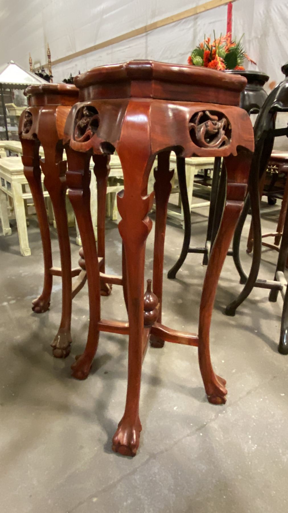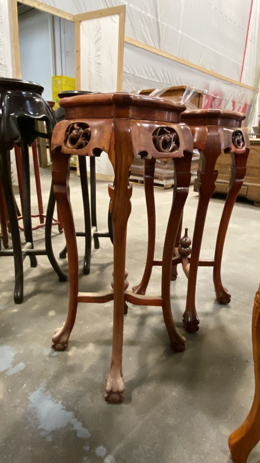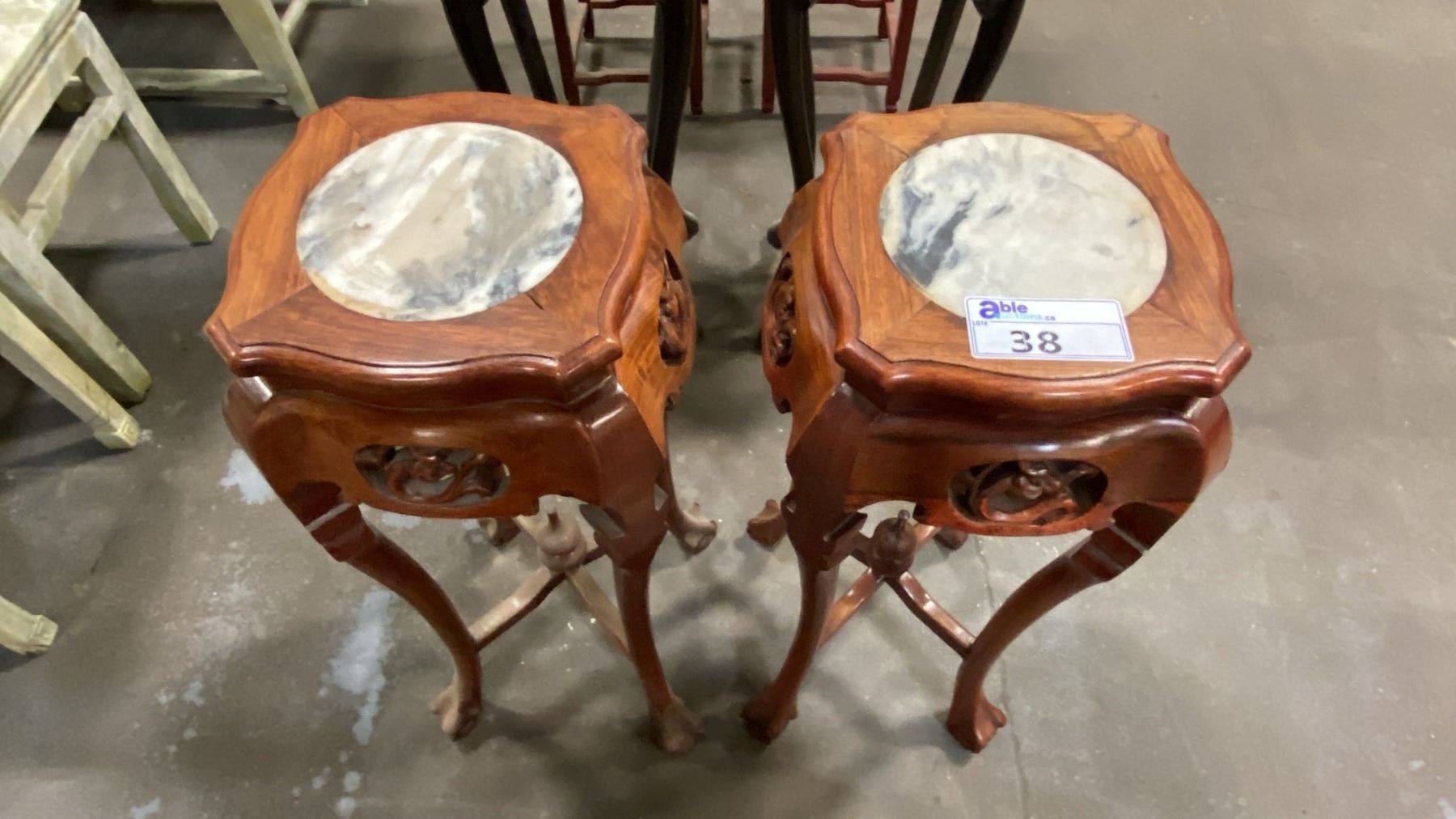 PAIR OF APPROX. 32" TALL CARVED MAHOGANY PLANT STANDS W/WHITE MARBLE INSET TOPS