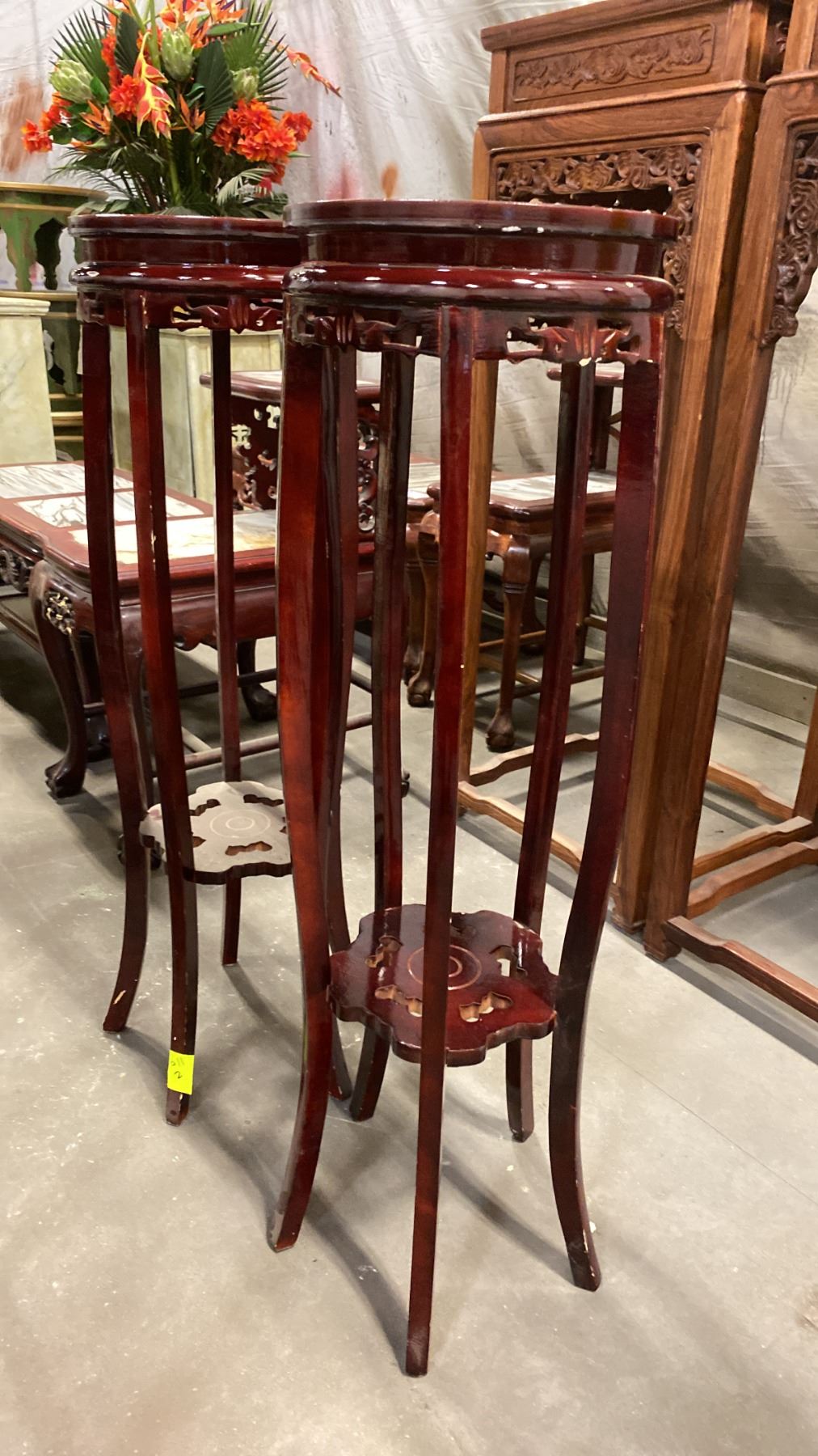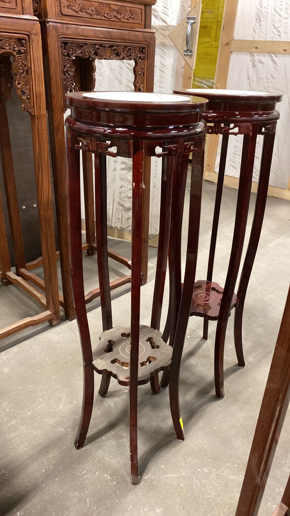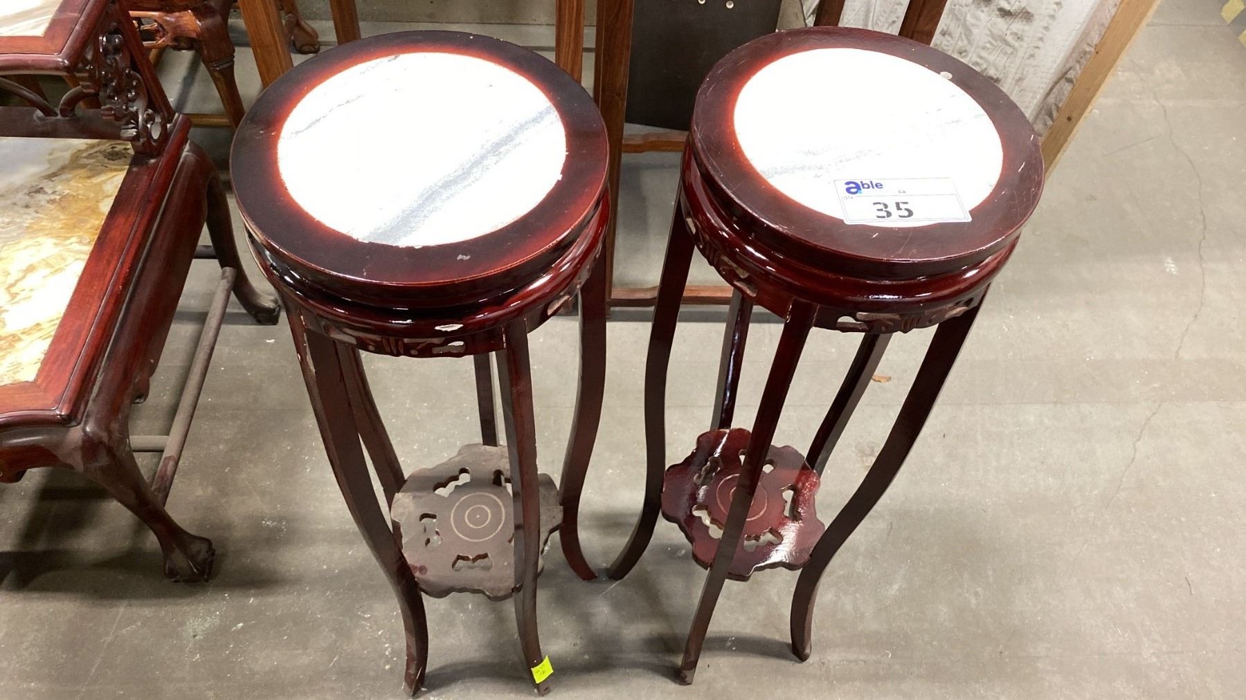 PAIR OF APPROX. 39" TALL CARVED MAHOGANY PLANT STANDS W/WHITE MARBLE INSET TOPS