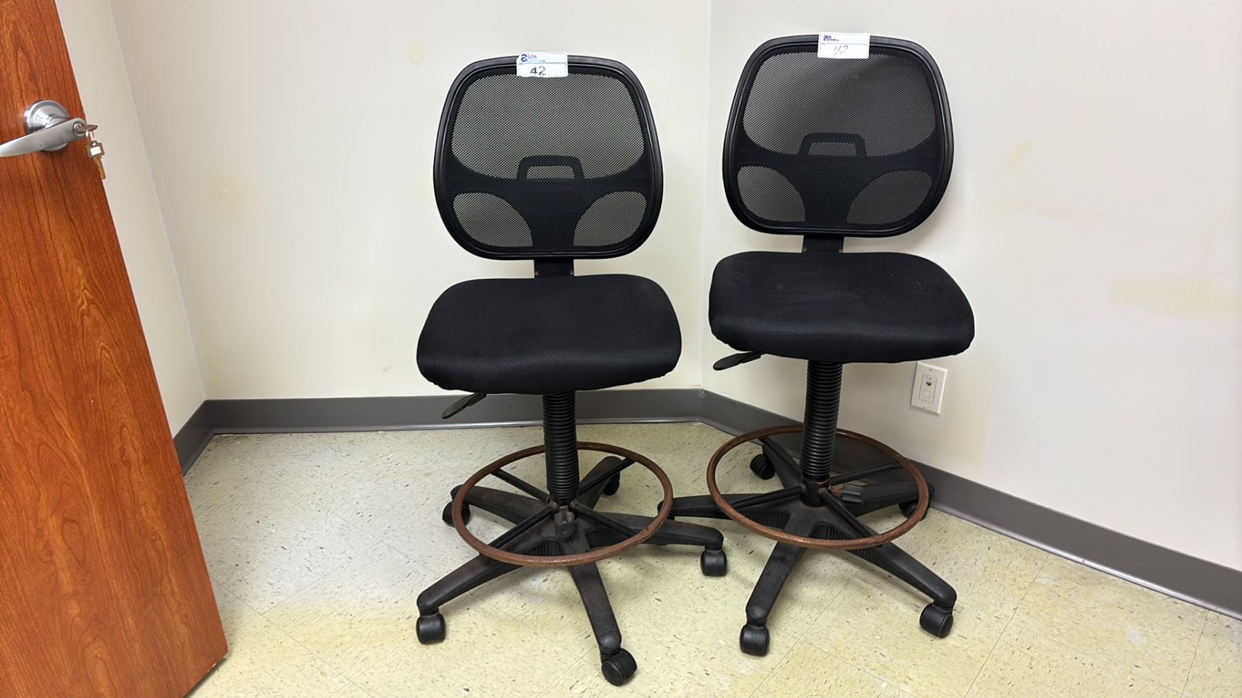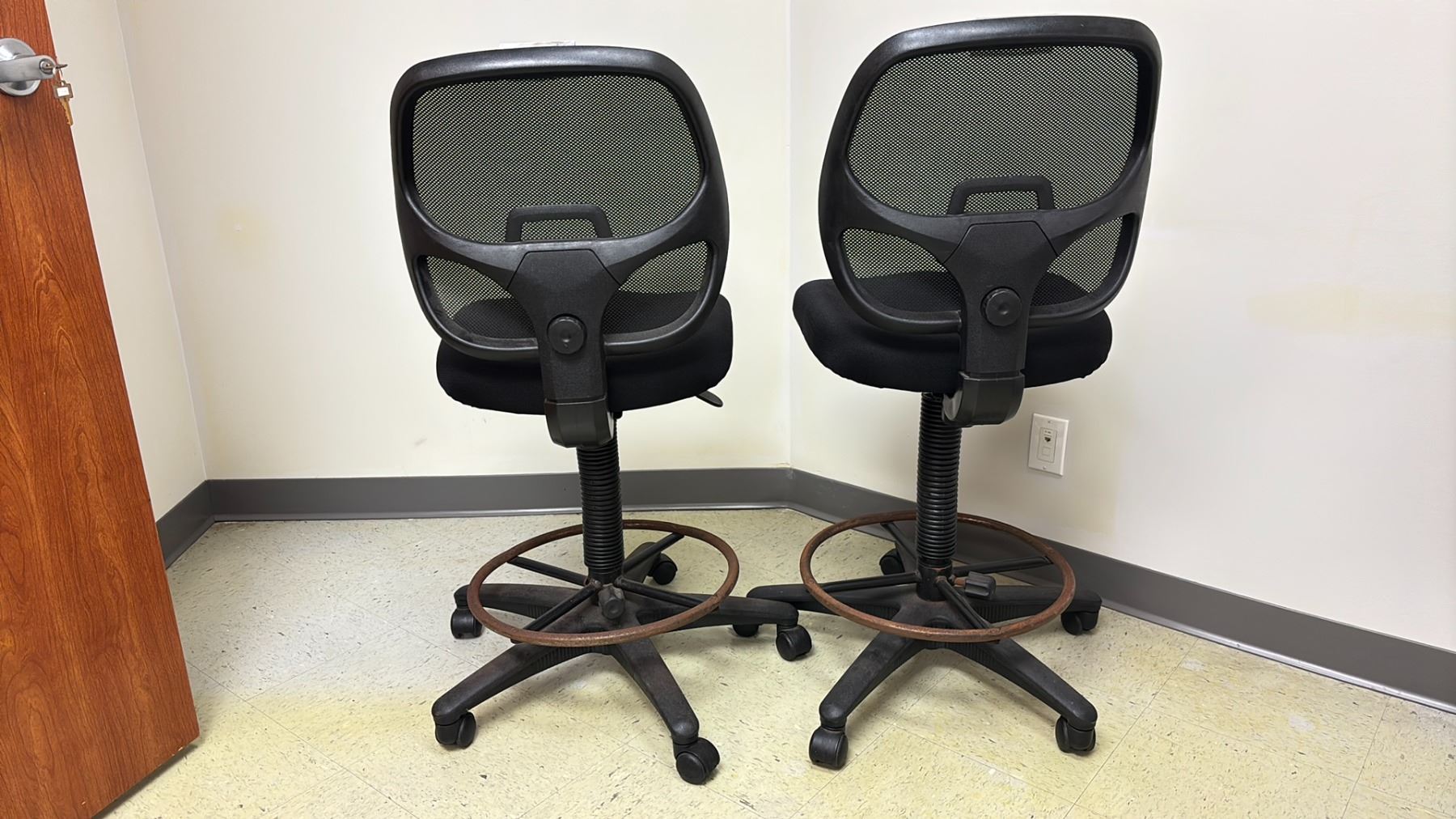 PAIR OF BLACK UPHOLSTERED GAS LIFT DRAFTING STOOLS