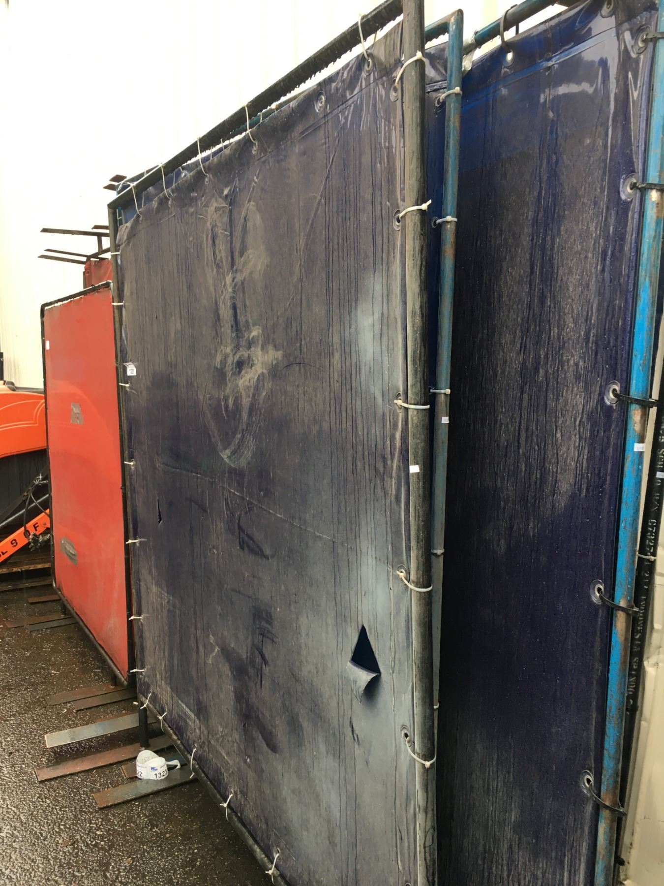 PAIR OF BLUE PLASTIC METAL FRAMED WELDING SCREENS