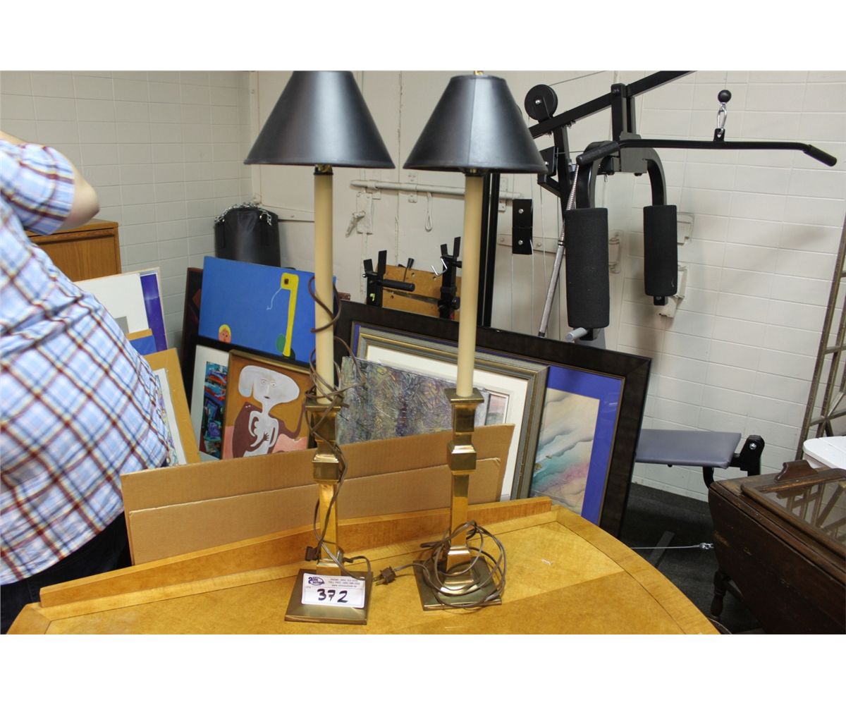 PAIR OF BRASS CANDLE STICK LATERNS WITH BLACK SHADES