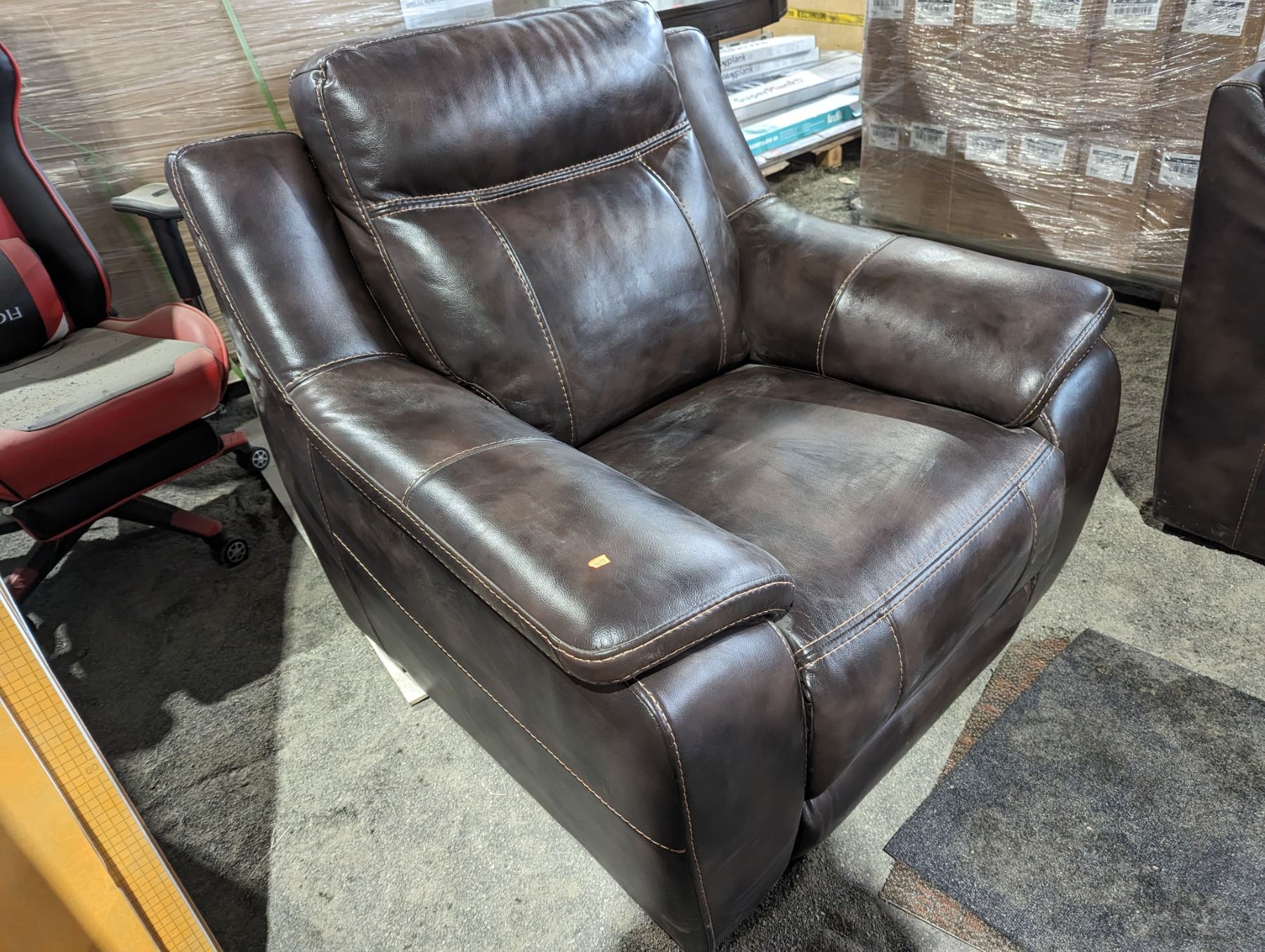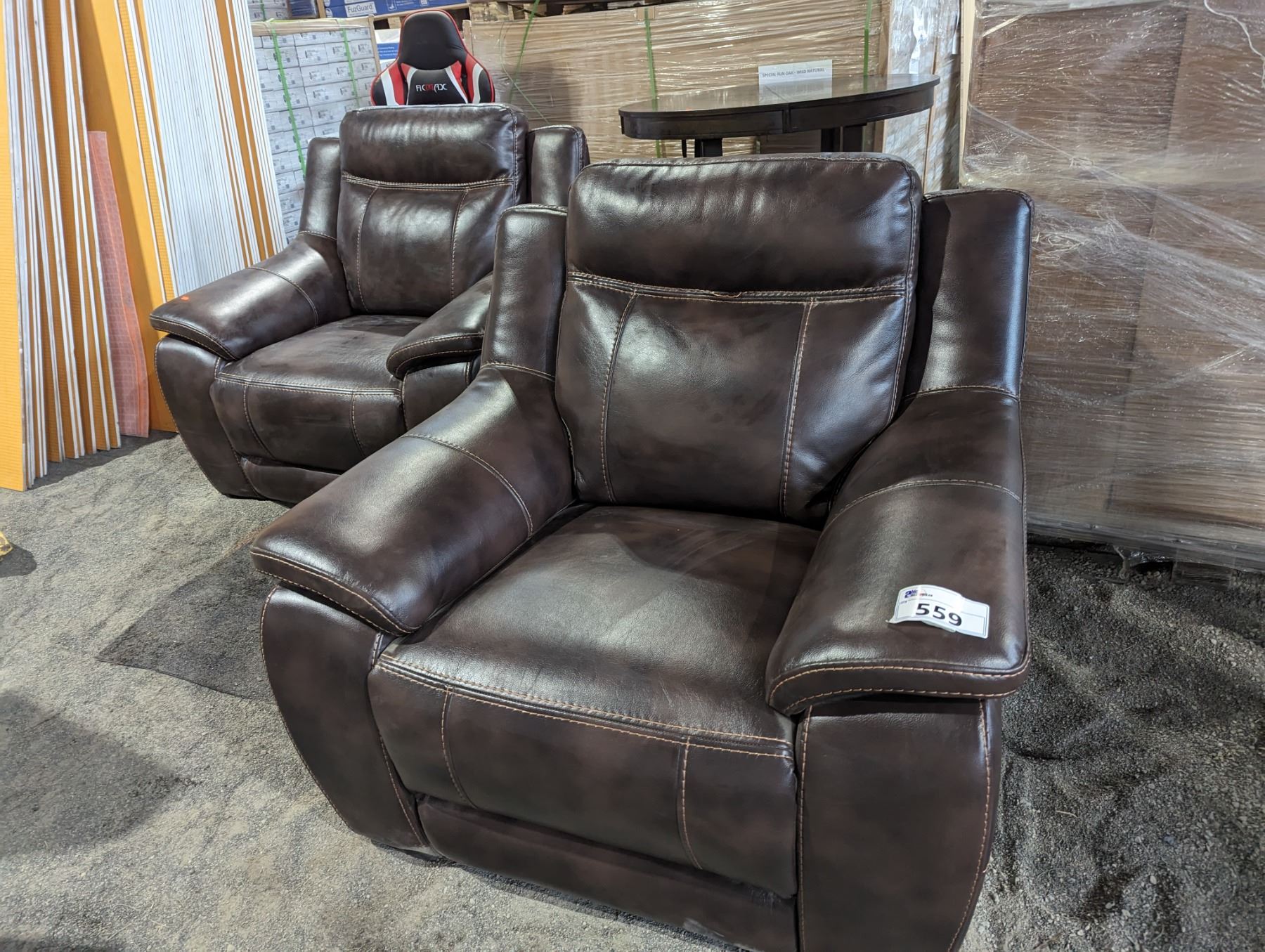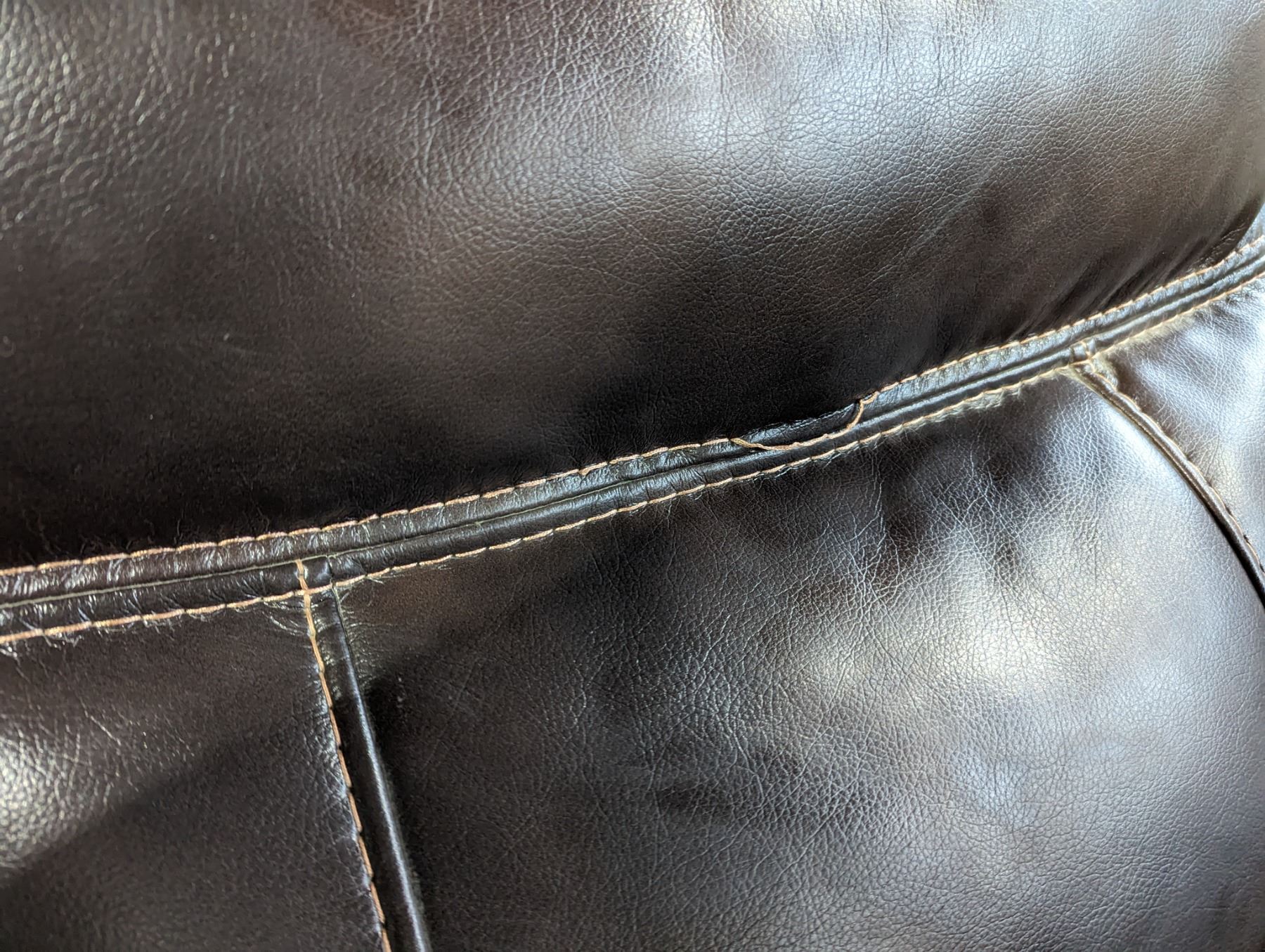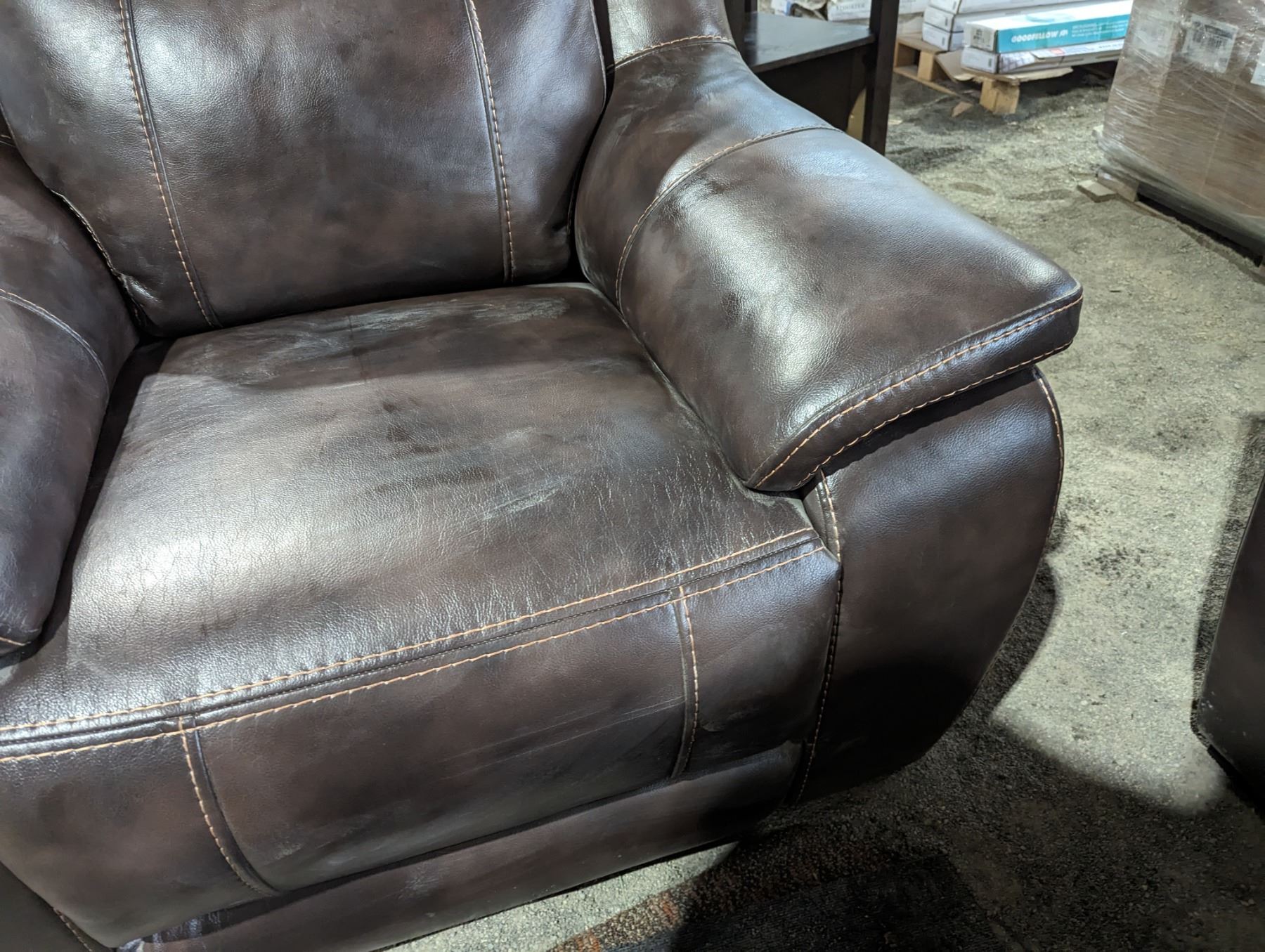 PAIR OF BROWN LOUNGE CHAIRS - A LITTLE BIT OF STITCHING OUT AS SHOWN IN PHOTO
