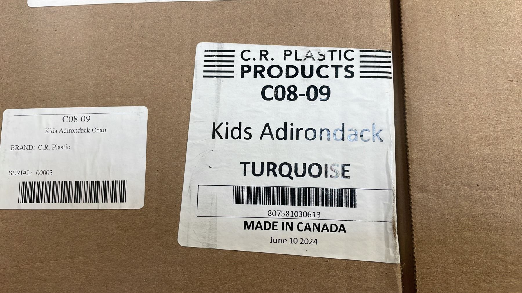 PAIR OF C.R. PLASTIC PRODUCTS MODEL CO8-09. KIDS ADIRONDACK OUTDOOR PATIO CHAIRS COLOR TURQUOISE *IN BOX*
