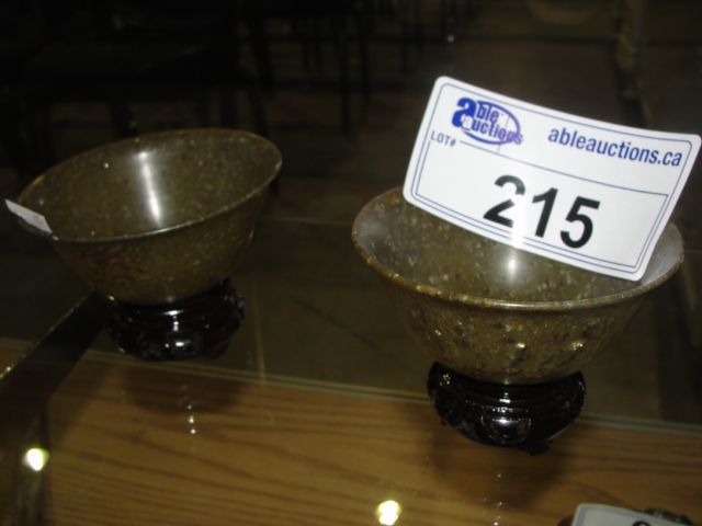 PAIR OF CARVED JADE BOWLS WITH SMALL WOODEN STANDS