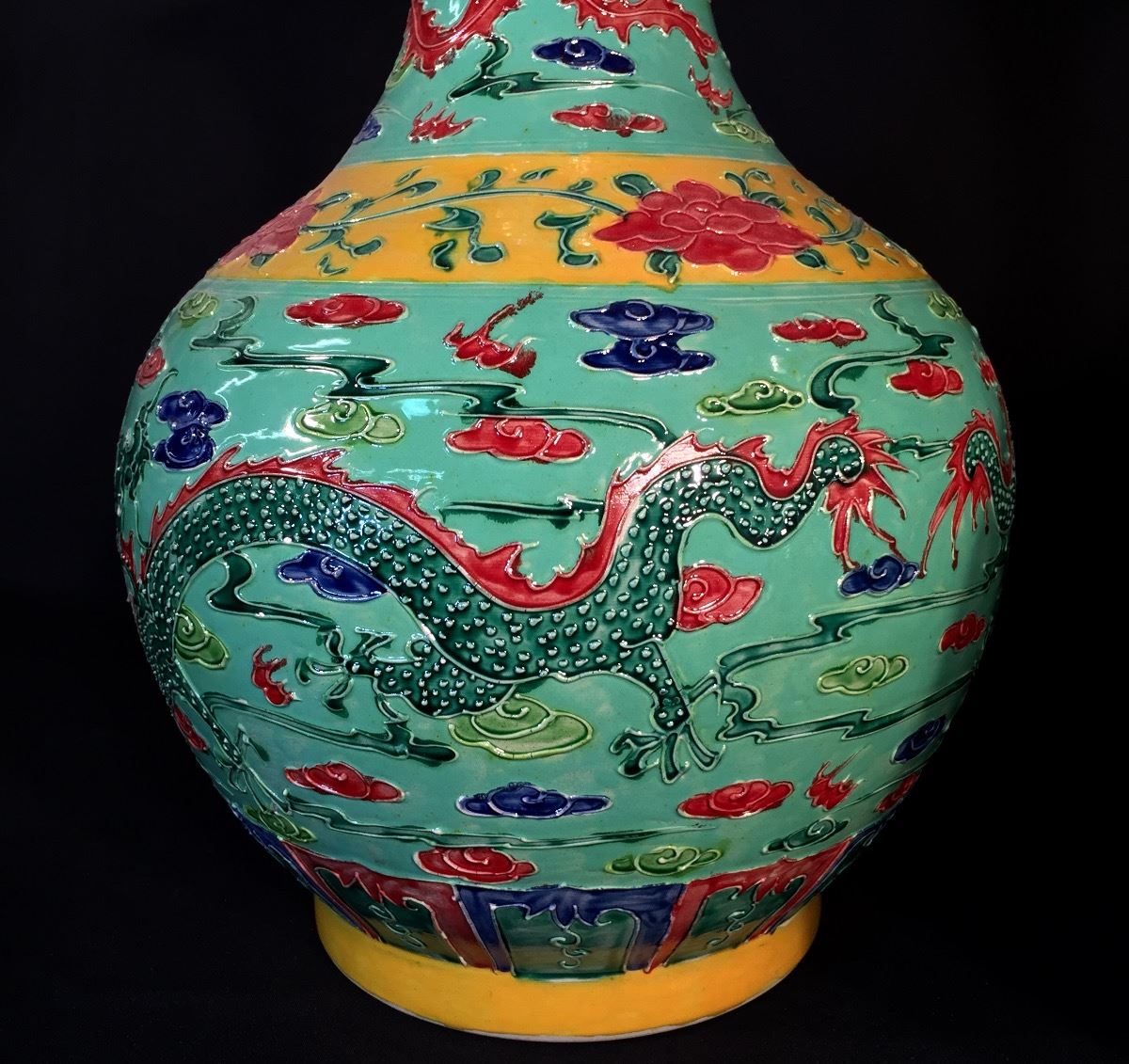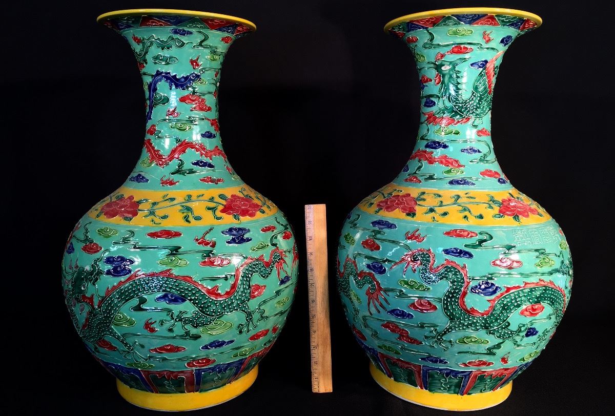 PAIR OF CHINESE FAMILLE VERTE STYLE HAND DECORATED VASES, 23’' H